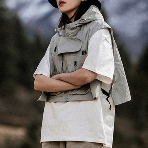 多ポケットで機能的なフード付きのショート丈ベスト。ジッパーフロント仕様で、着脱もスムーズです。様々なポケットで収納力も抜群。実用性とデザイン性を兼ね備えた、おすすめのベストです。
