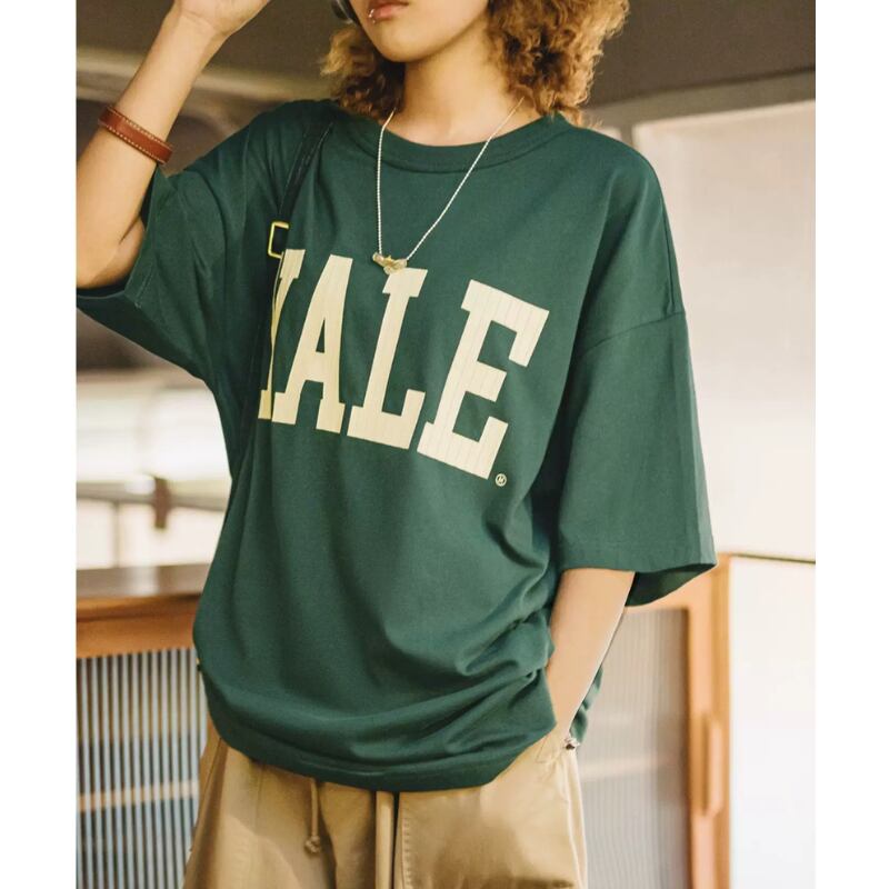 着心地抜群のロゴTシャツ。胸元にはYALEのロゴがプリントされ、さりげないアクセントになっています。シンプルながらも存在感のあるデザインで、様々なスタイルに合わせやすいのが魅力です。一枚で着るのはもちろん、レイヤードスタイルにもおすすめです。様々なシーンで活躍してくれる、使い勝手の良いアイテムです。