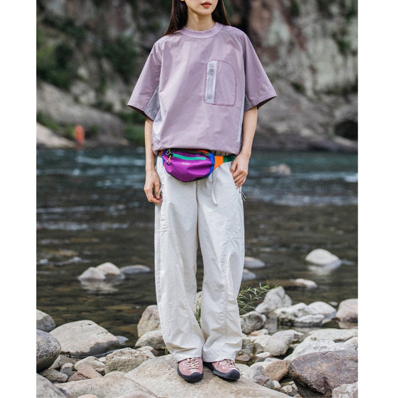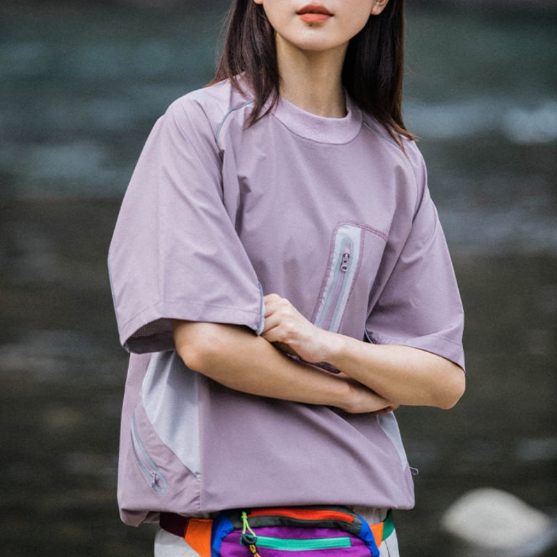 やわらかなニュアンスカラーが特徴のスポーツTシャツ。胸元のジップポケットがアクセントになり、軽やかな着心地でアクティブなシーンにもデイリーにも活躍します。ゆったりとしたシルエットで動きやすく、アウトドアやレジャーにもぴったりな一枚です。