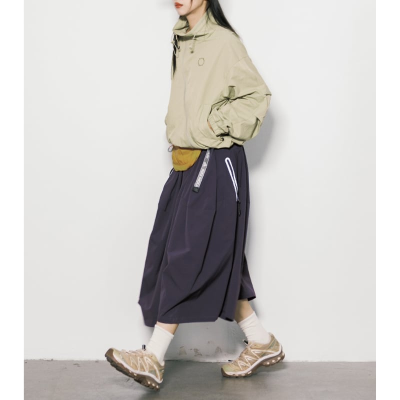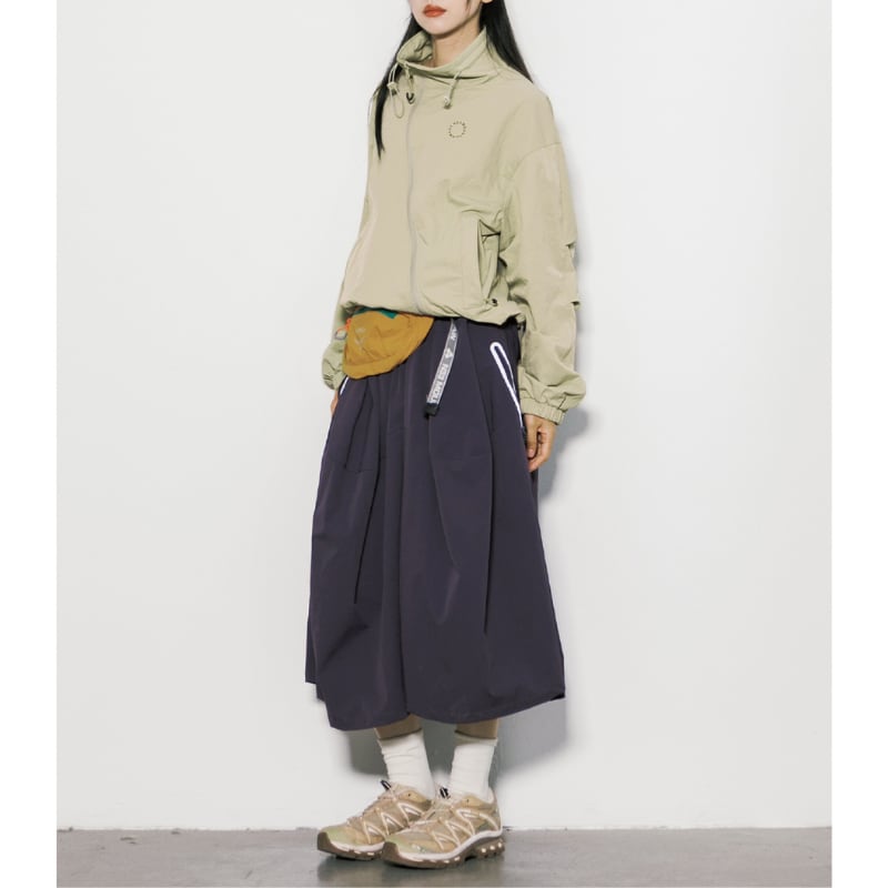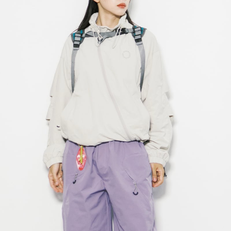 アシンメトリーなフロントジップとドロップショルダーが特徴のマウンテンジャケット。