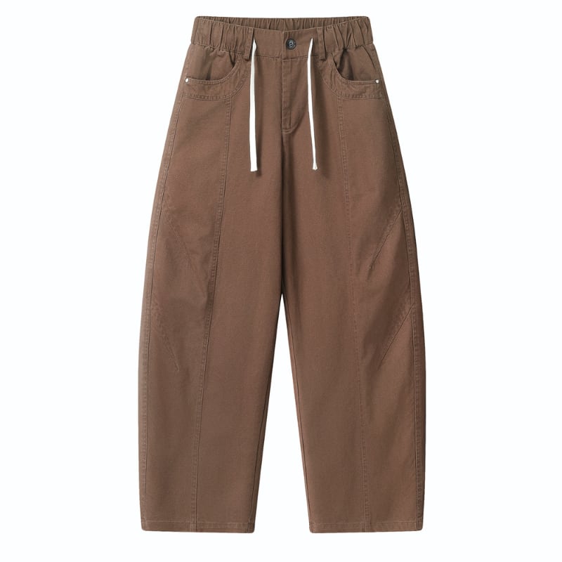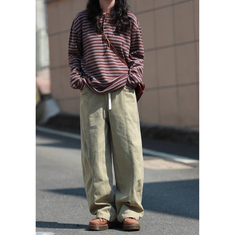 ウエストのドローストリングがポイントになったワイドレッグパンツ。