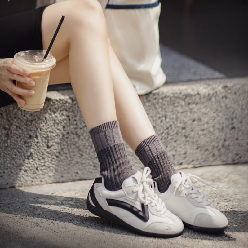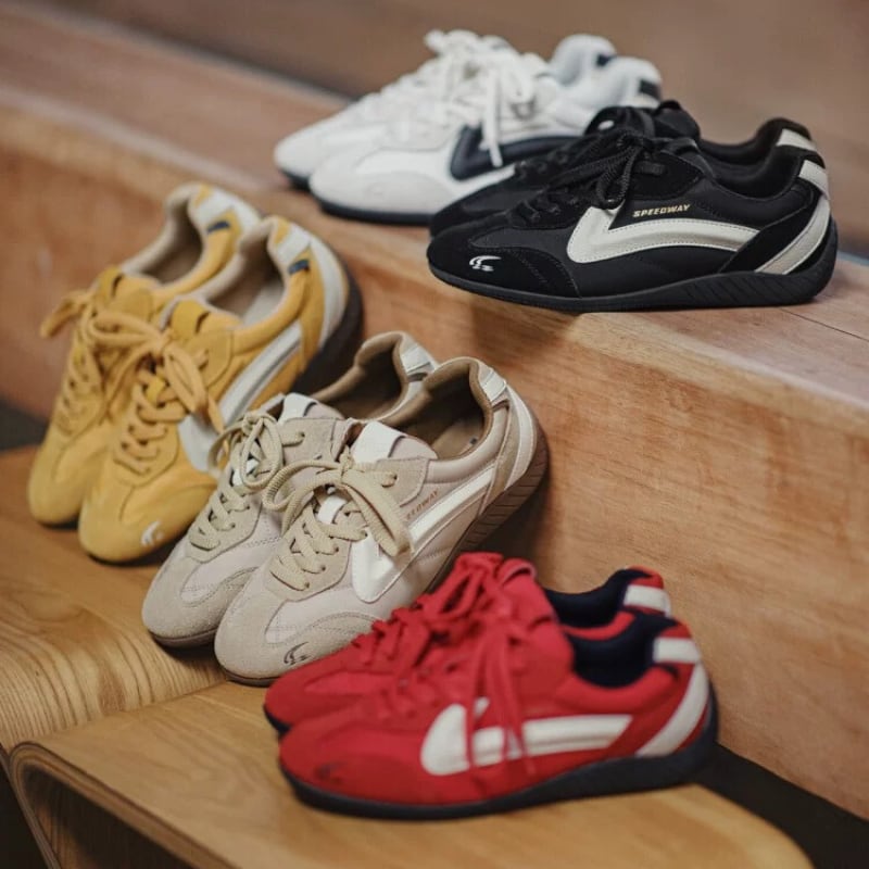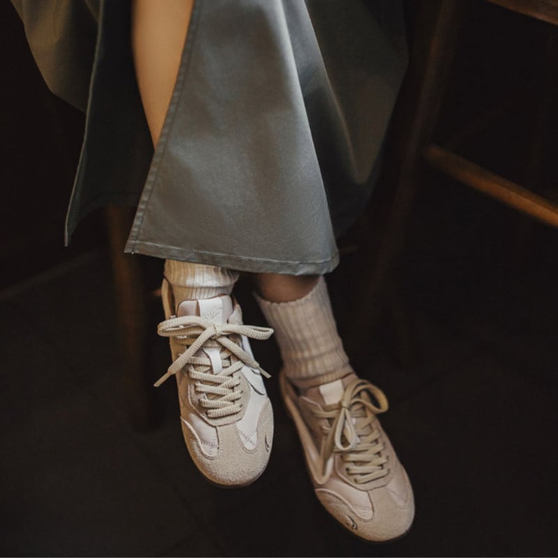やさしい色味と丸みのあるフォルムが魅力のレトロスニーカーです。
