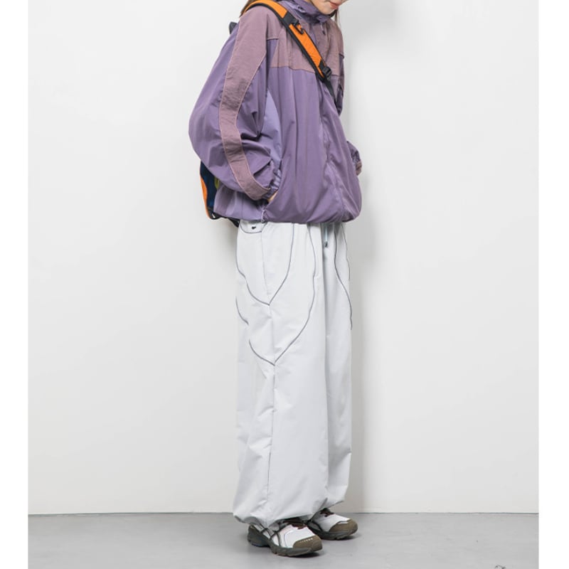 配色デザインが印象的なフード付きナイロンジャケット。