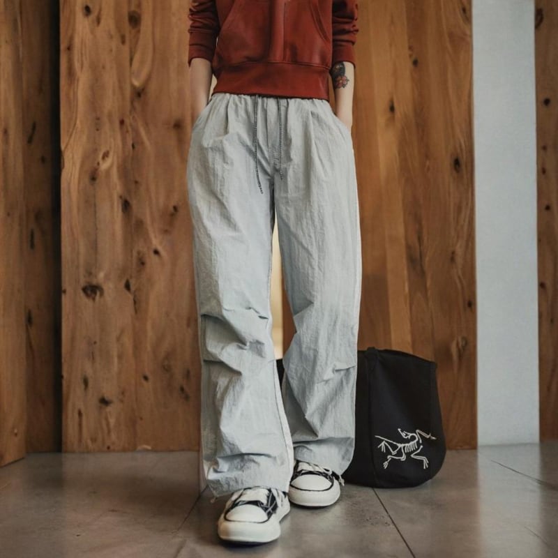 淡いオフホワイトカラーが印象的なワイドトラックパンツです。