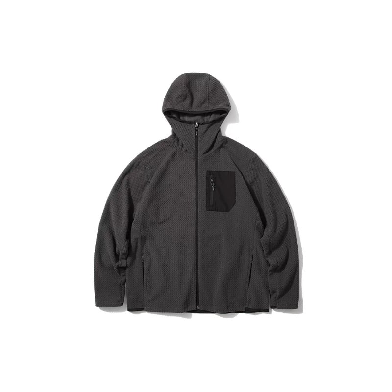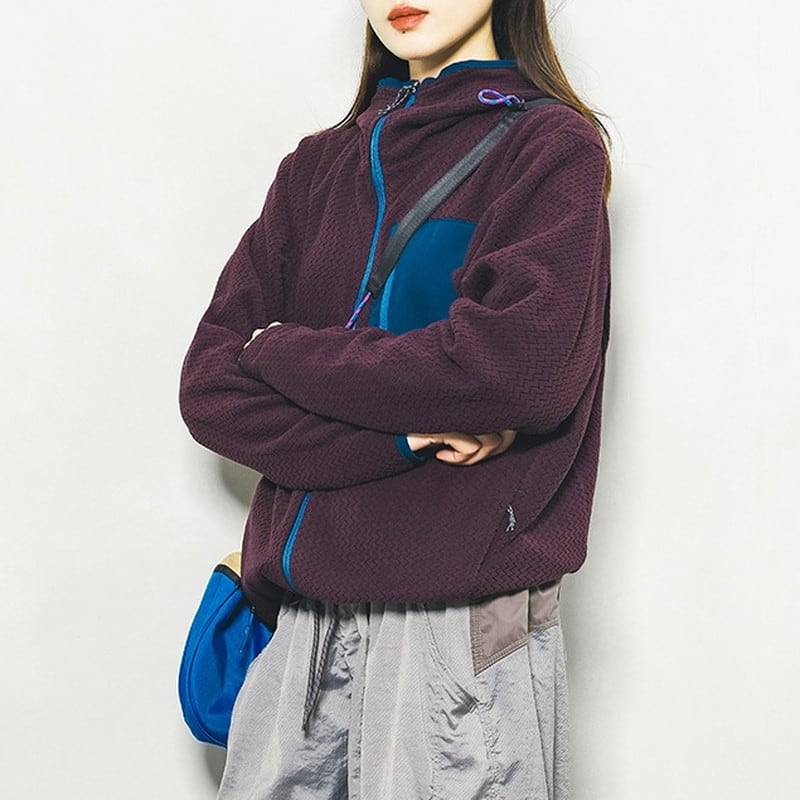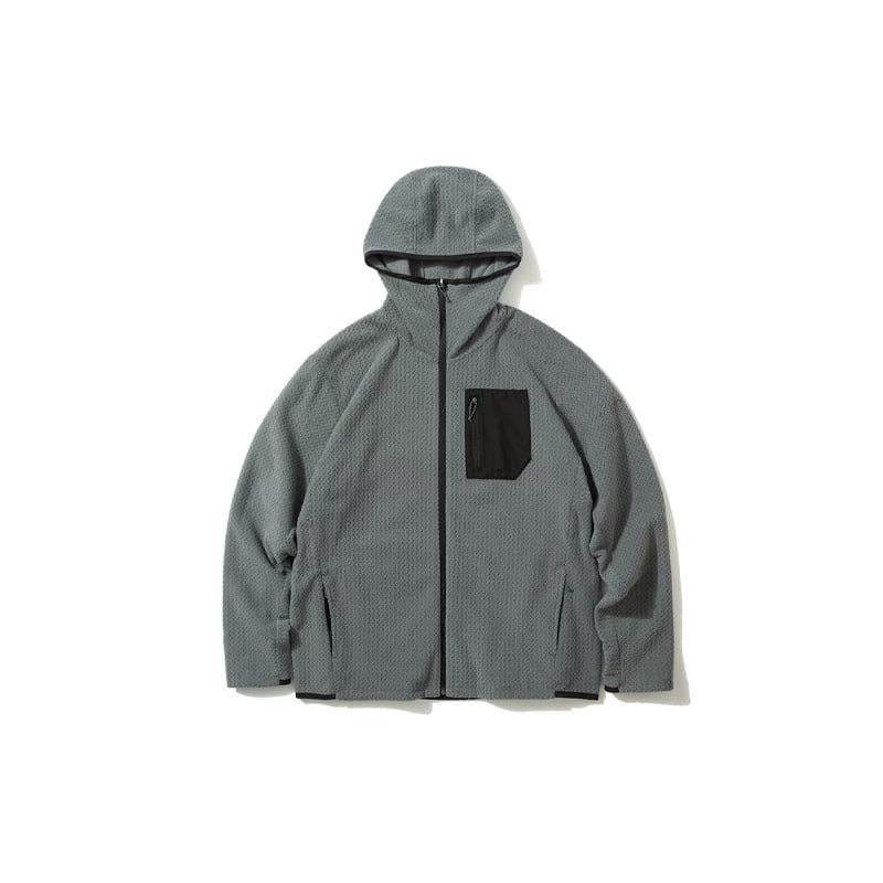 凹凸のある編み地が目を惹くジップアップパーカーです。