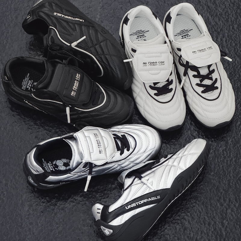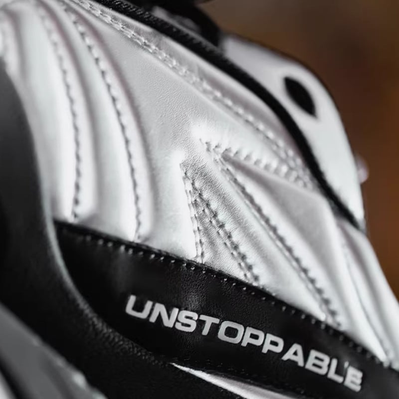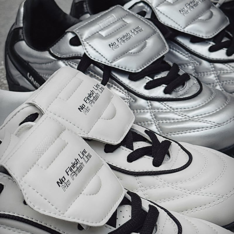 サイドの大胆なライン使いが足元にリズムを生み、カジュアルスタイルに動きをプラス。