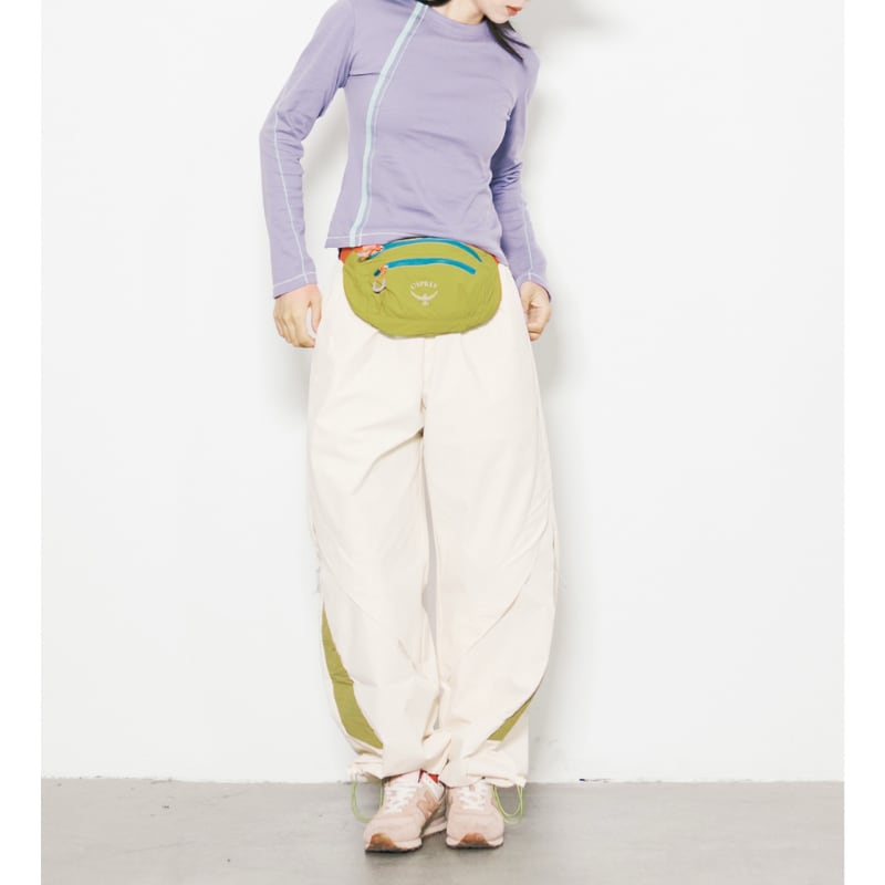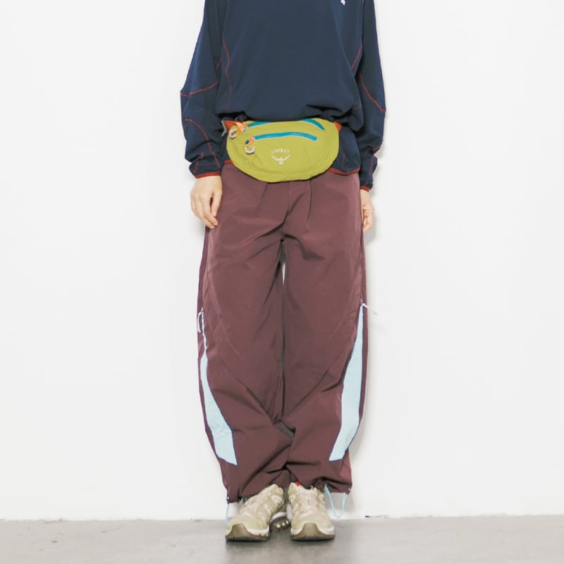 切り替えデザインが目を引くワイドトラックパンツです。