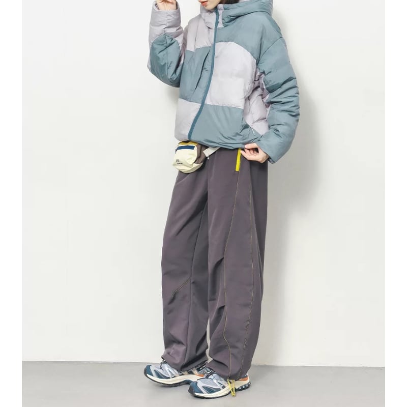 ゆるめのシルエットに、前後のカーブした切り替えがアクセントになり、動きのある見た目に仕上がっています。