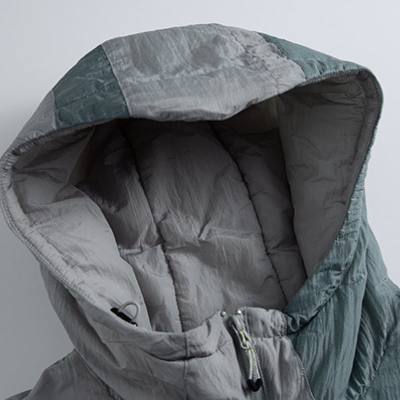 色の切り替えラインがしっかり映えるフード付きジップジャケット。