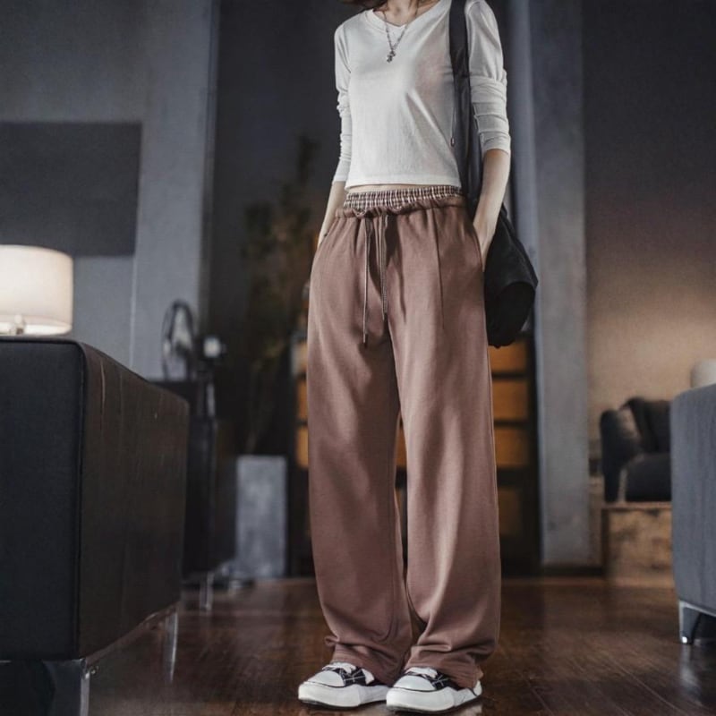 ウエストのチェック柄と裾のドローコードがアクセントになったパンツ。