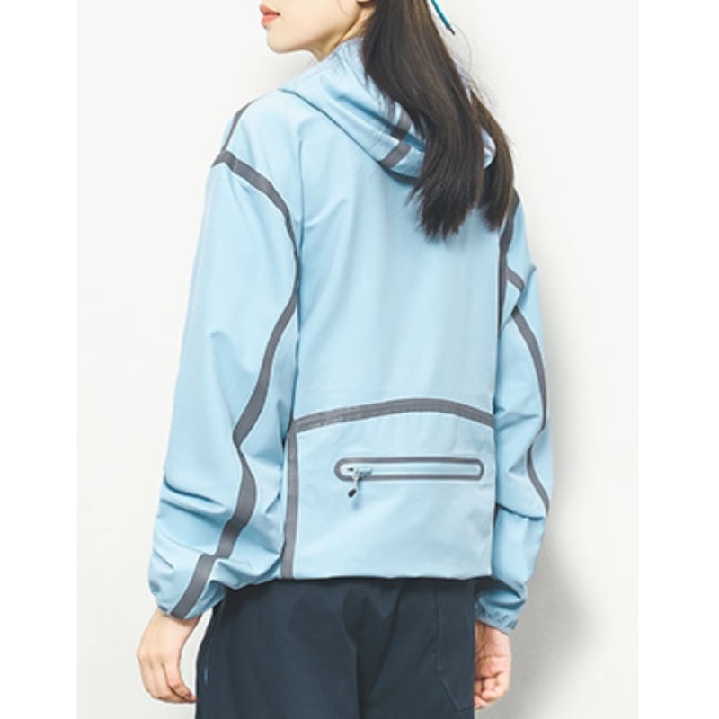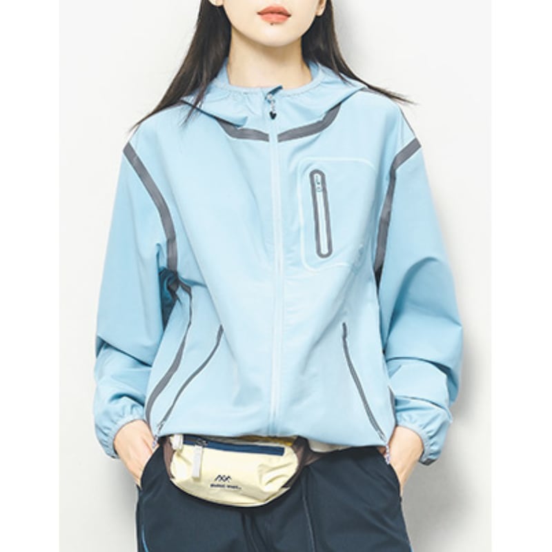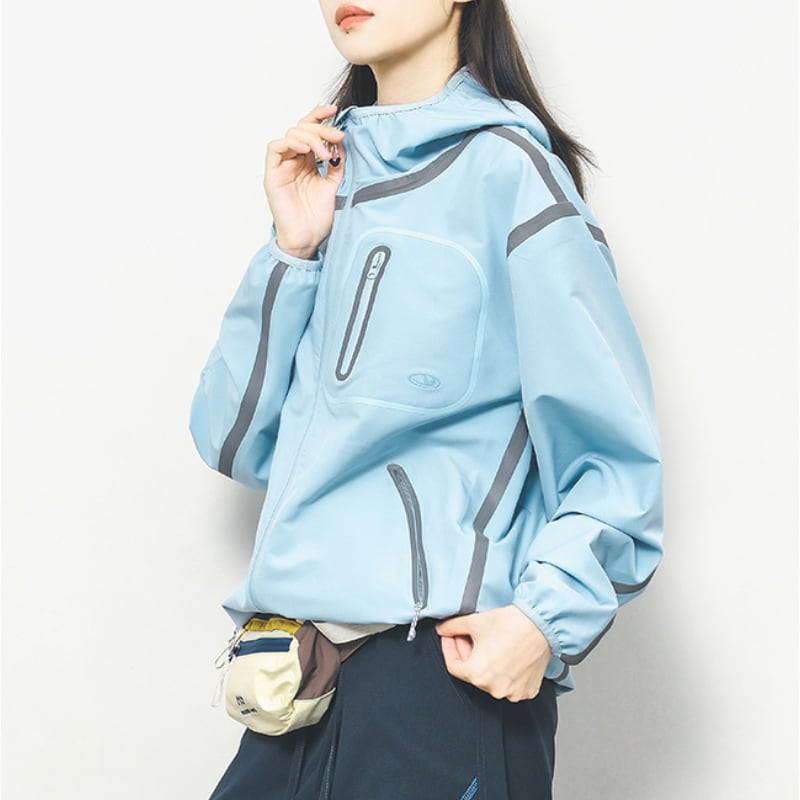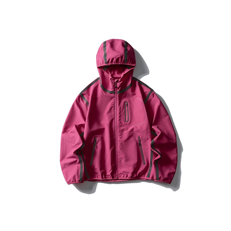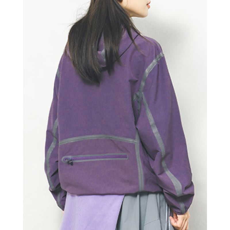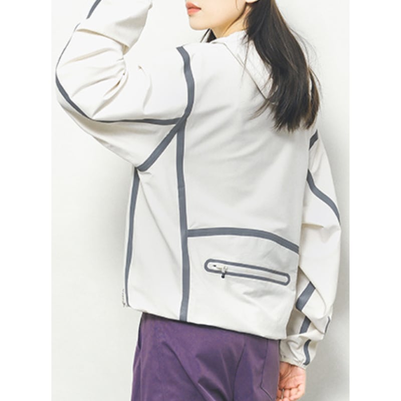 光沢のあるラインがデザインを強調する、フード付きのジップジャケットです。