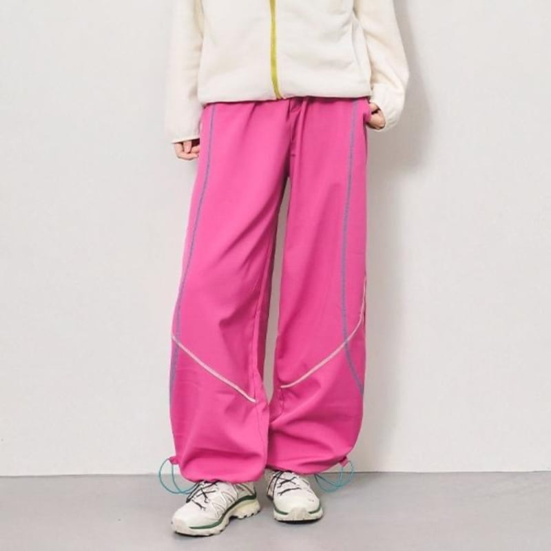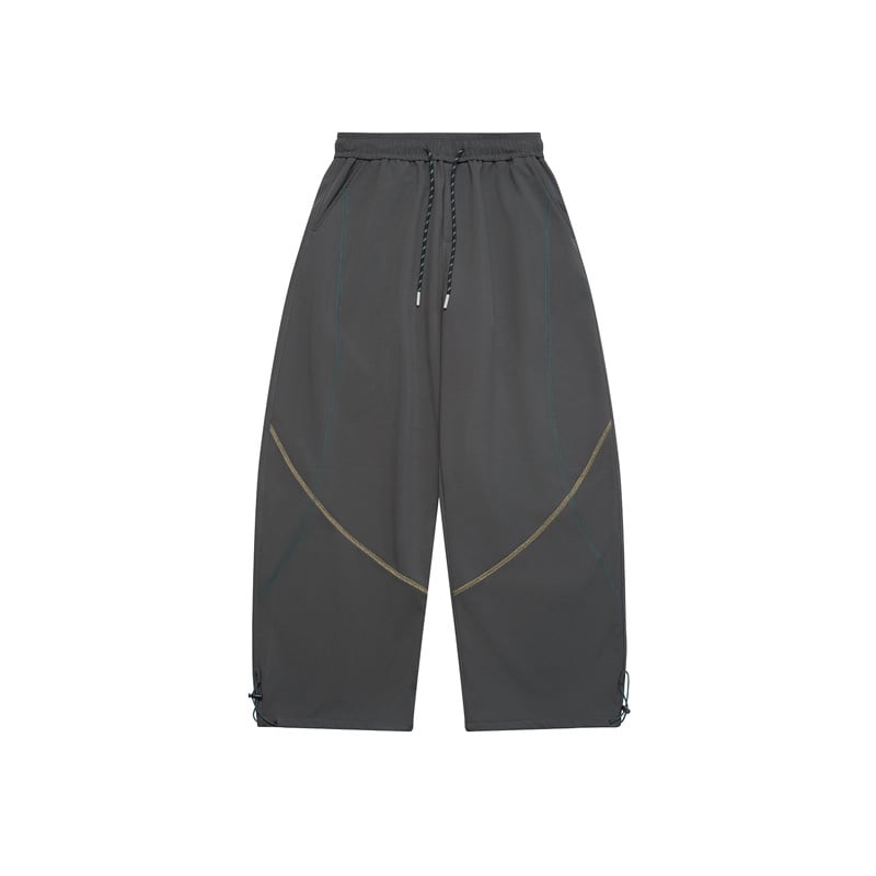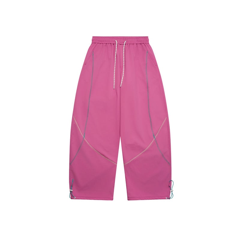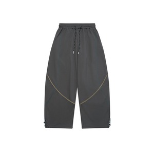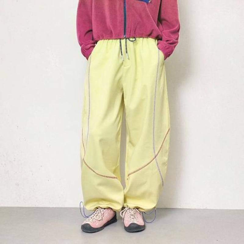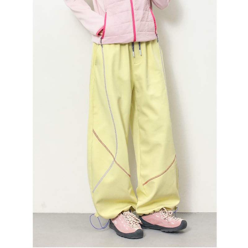 立体的な曲線を描く配色ステッチが目を引く、ワイドシルエットのパンツです。
