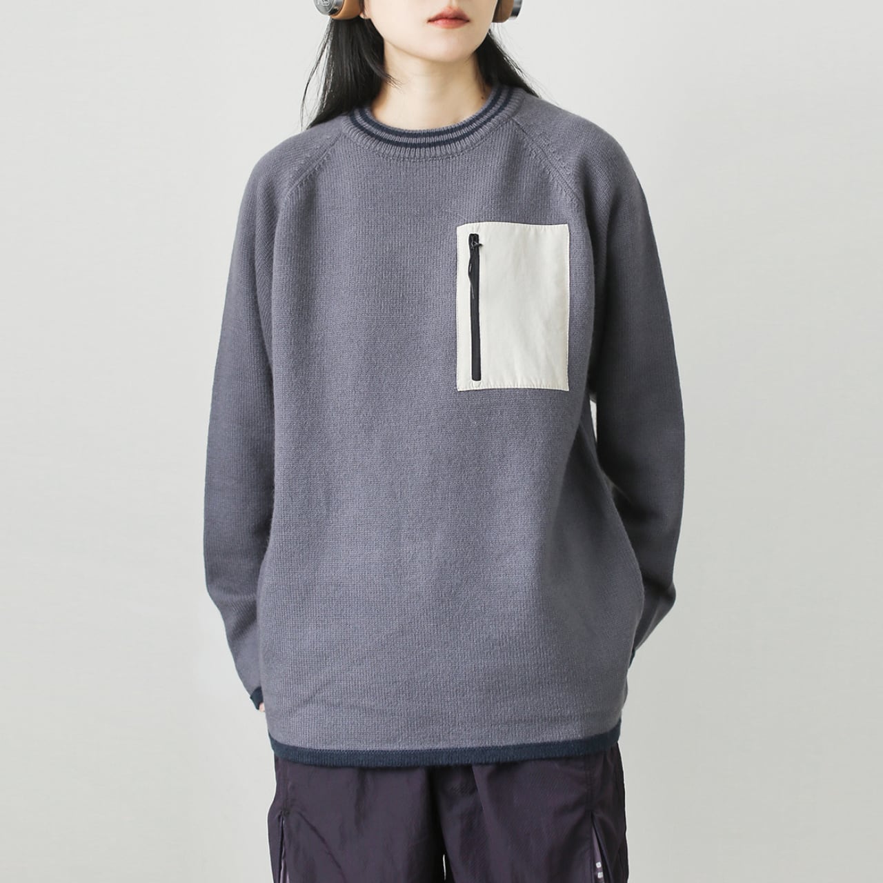 胸元のジップ付きポケットがアクセントになるニットです。