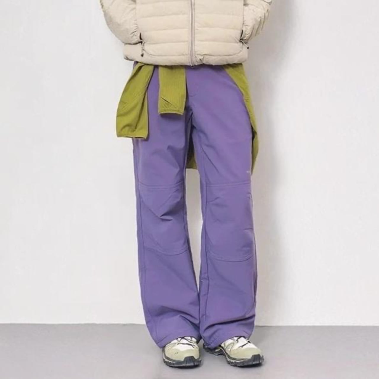 マットな質感に、膝まわりの切り替えが入ったアウトドアパンツ。