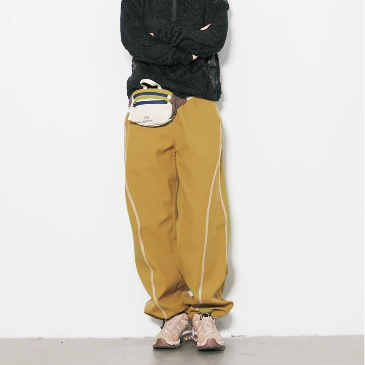 太ももから裾にかけて流れるように入ったカーブ状の切替ラインが特徴のパンツ。
