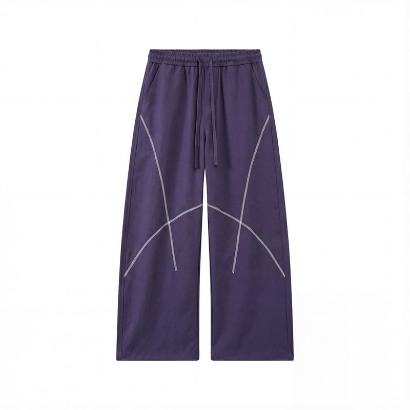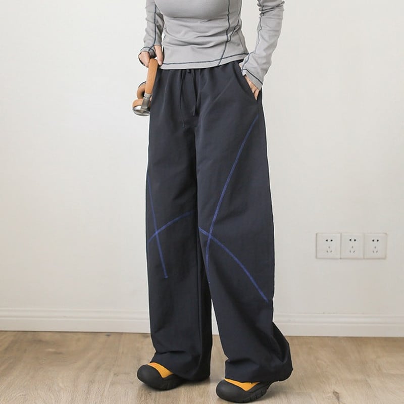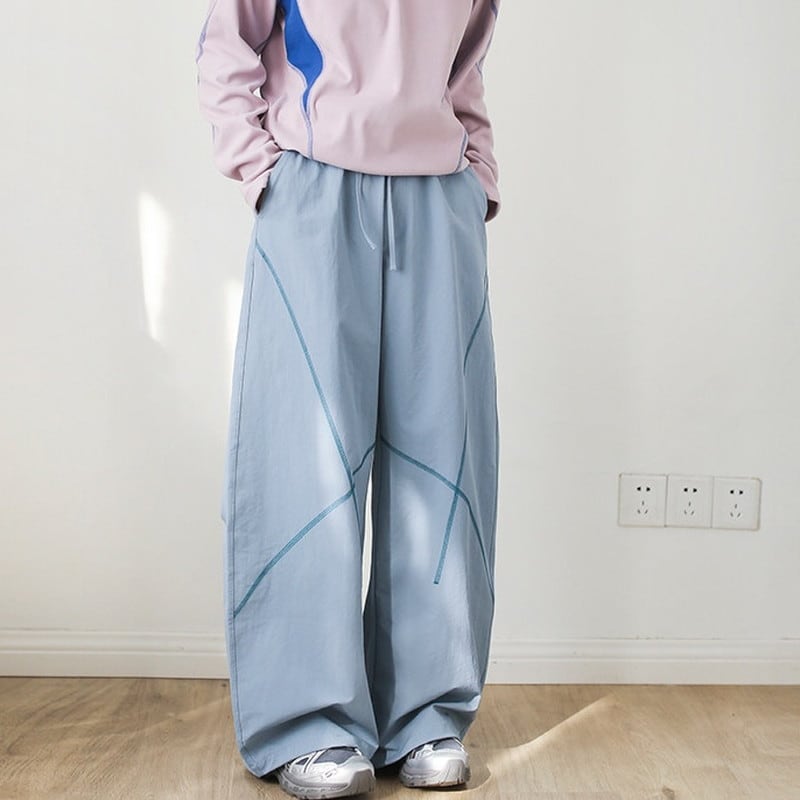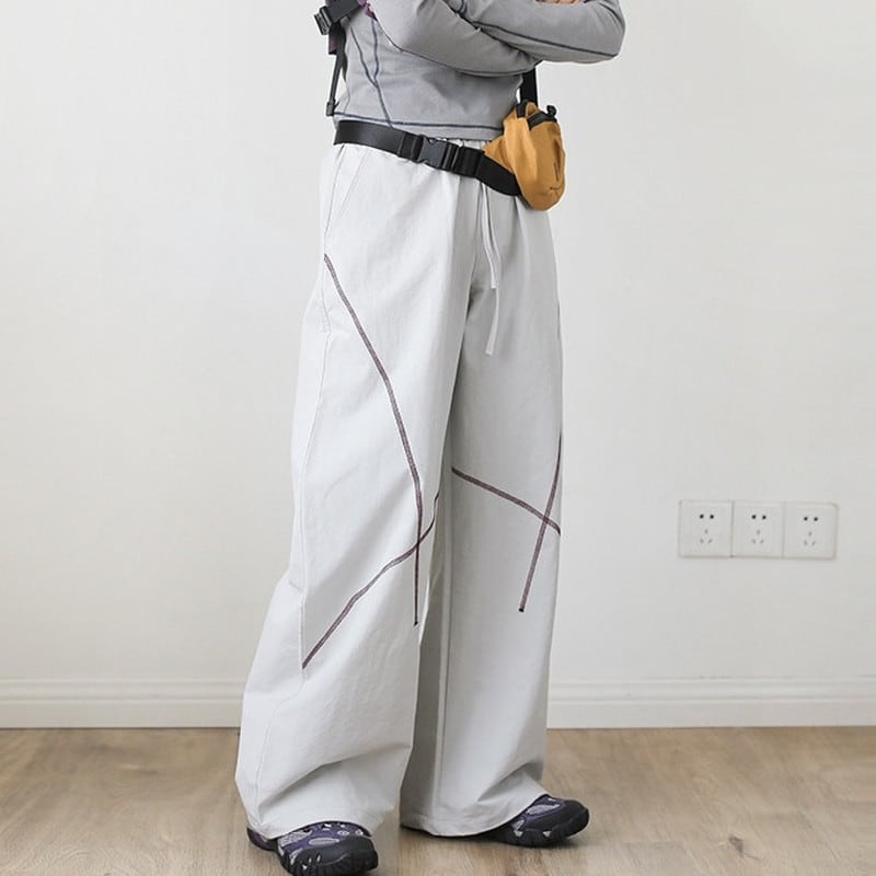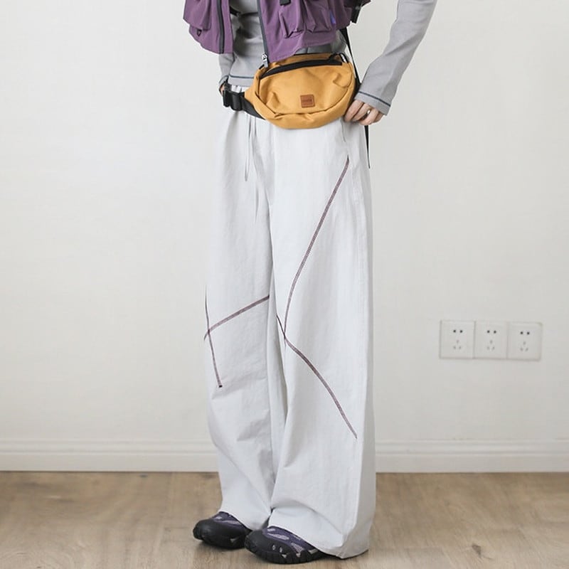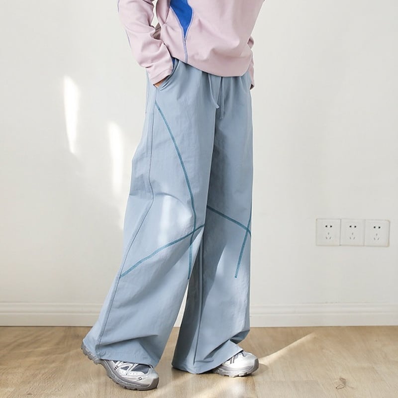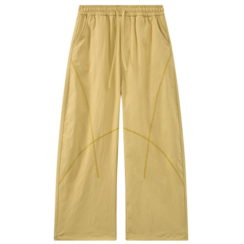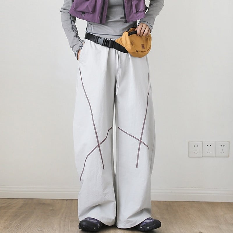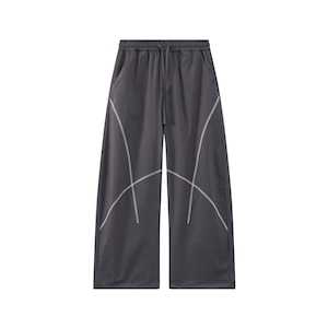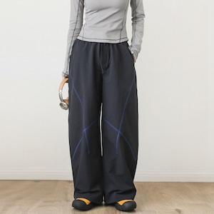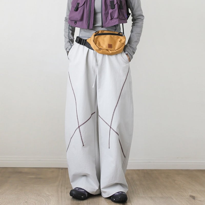 緩やかにカーブを描く立体的なステッチラインが、都会的なテック感と遊び心を演出するワイドパンツです。