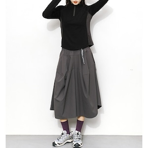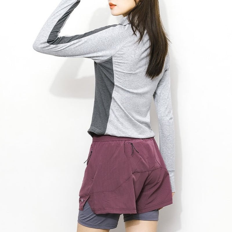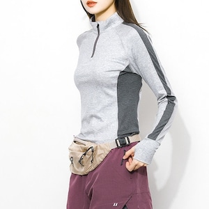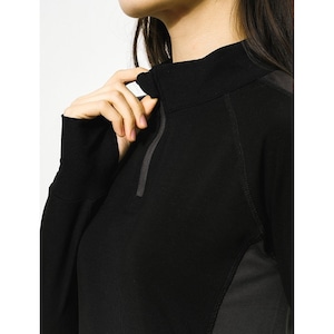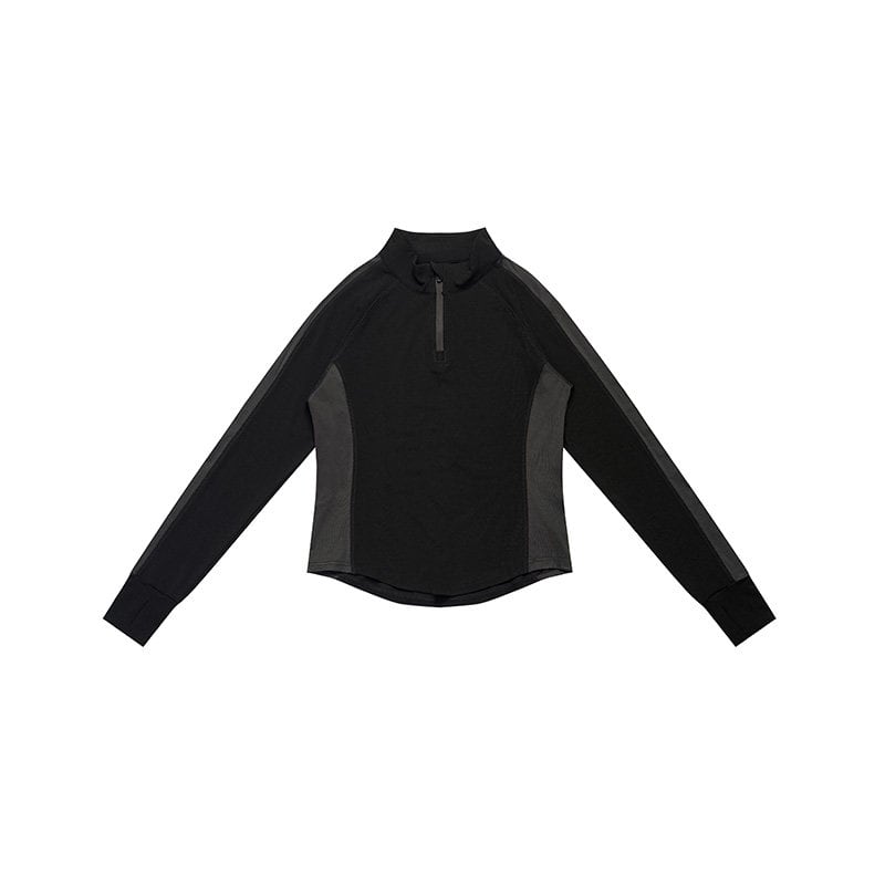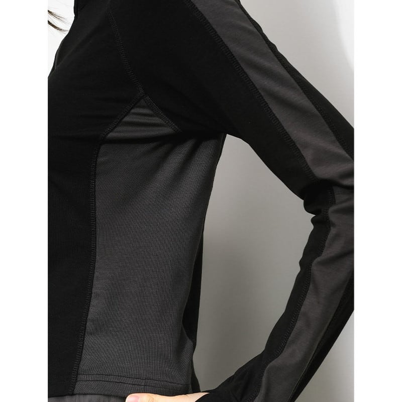 サイドから袖にかけて施された大胆な配色切り替えが、ボディラインをシャープに引き締めるハーフジップトップスです。