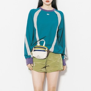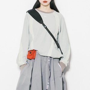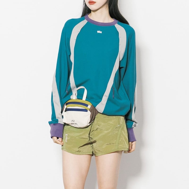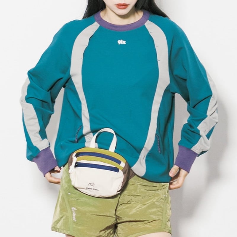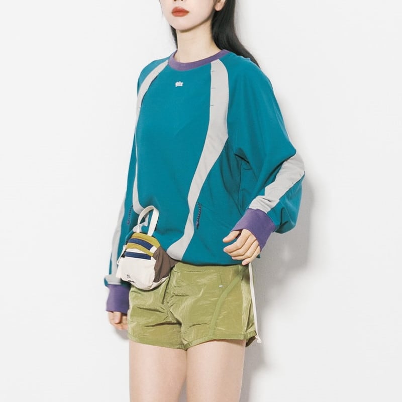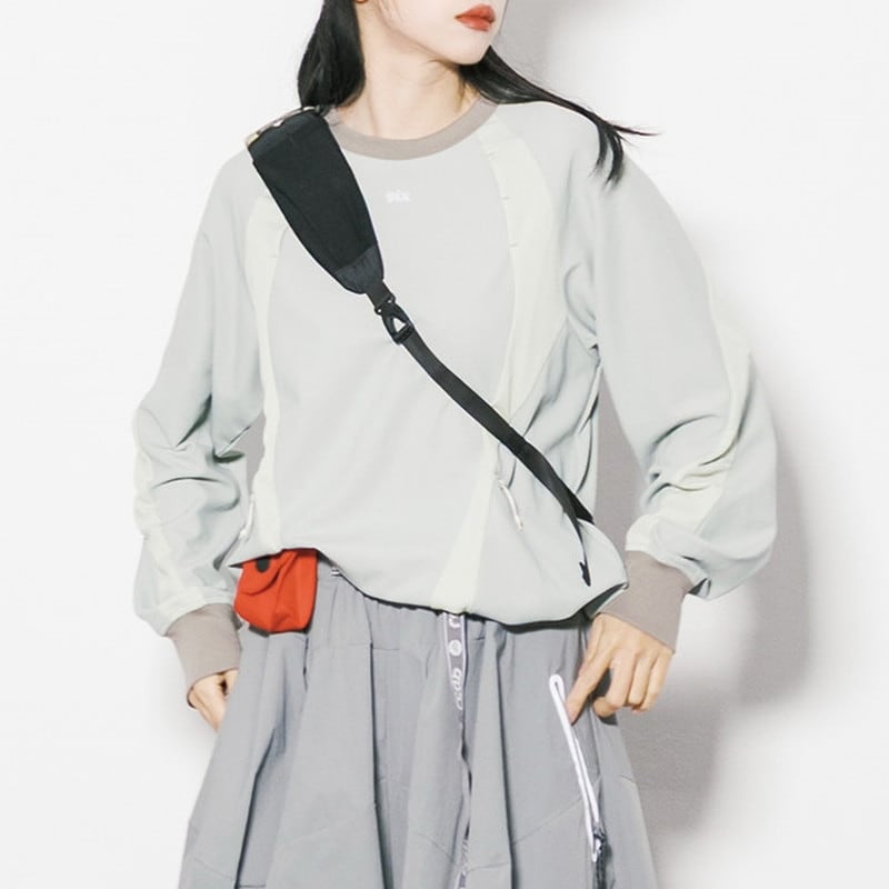 フロントから袖にかけて施された大胆な曲線状の切り替えデザインが、スポーティかつモダンな印象を与えるスウェットプルオーバーです。