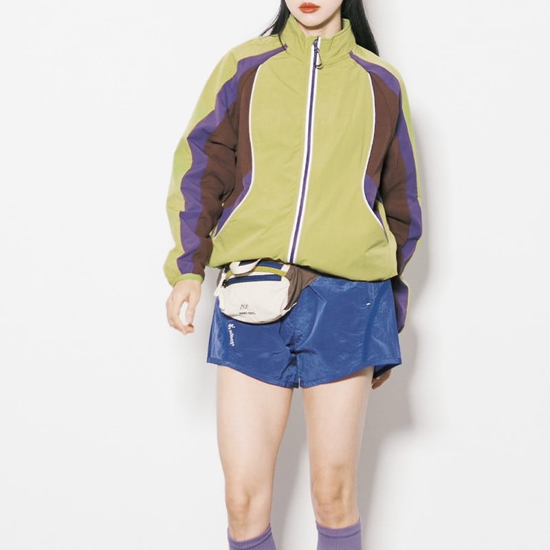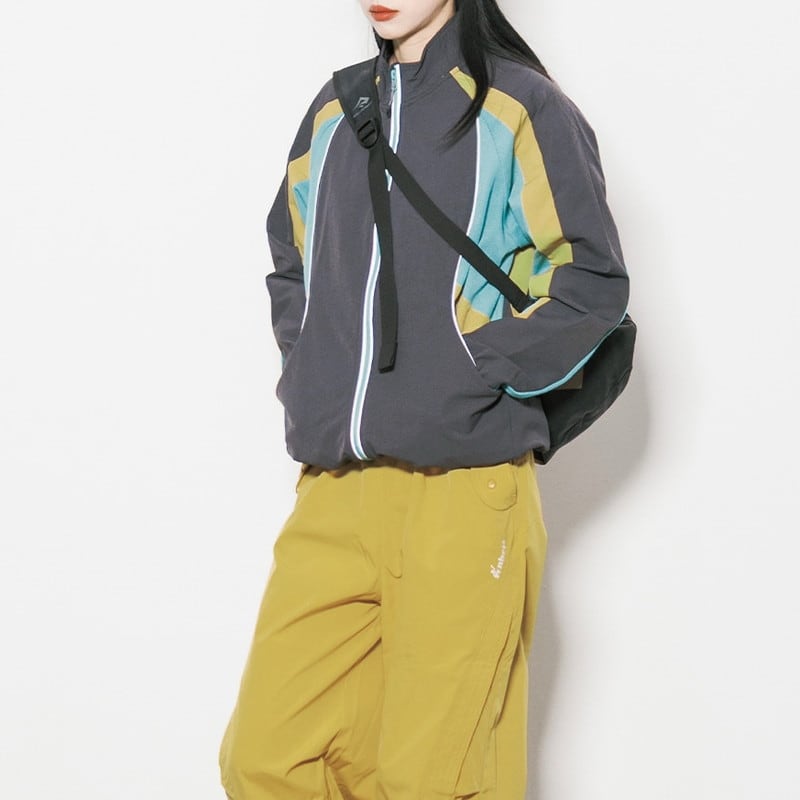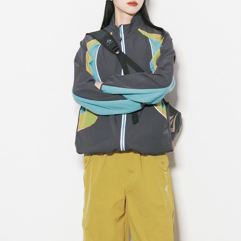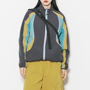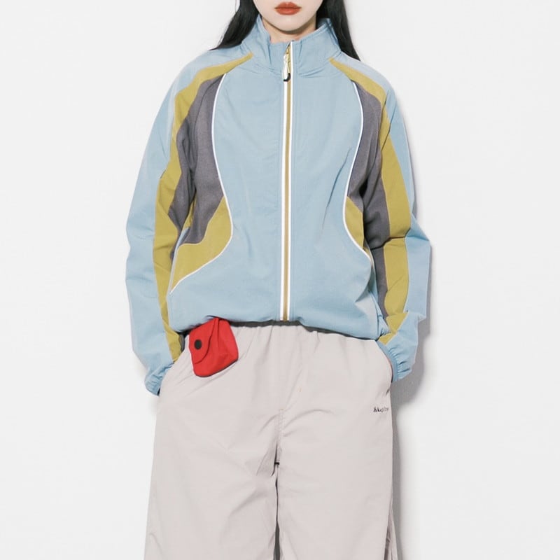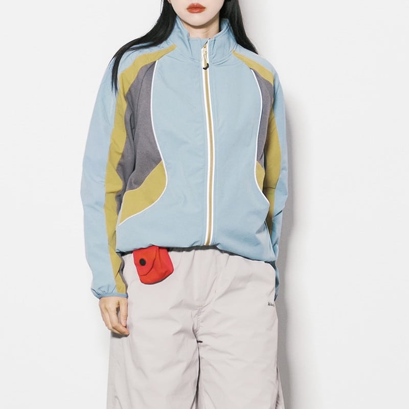 ボディから袖にかけて流れるような曲線的な配色切り替えが、レトロスポーティな躍動感を演出するトラックジャケットです。