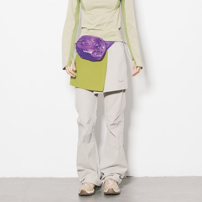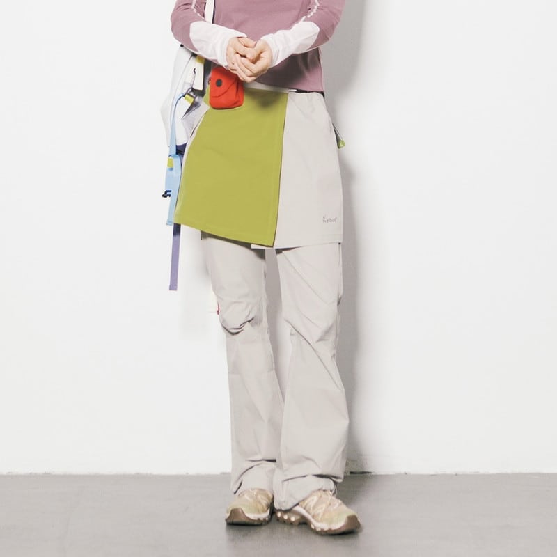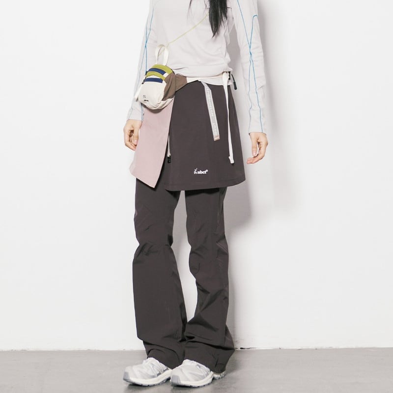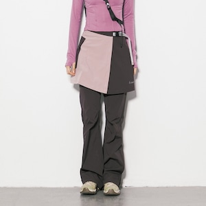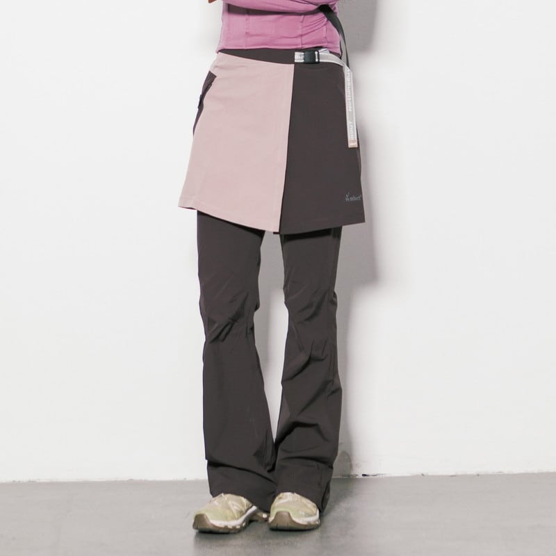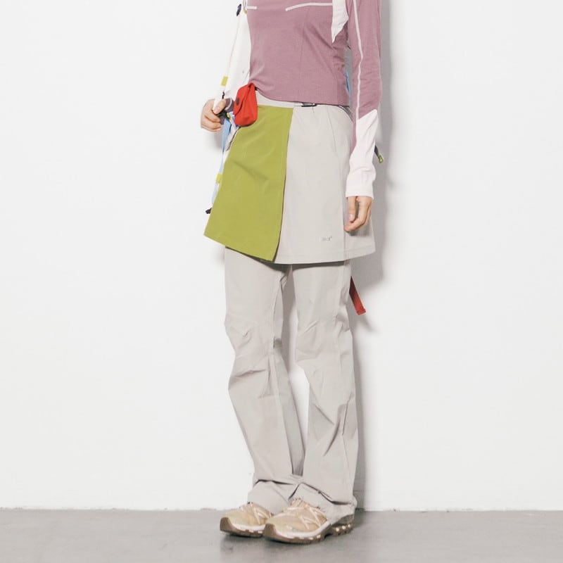 パンツの上にラップスカートを重ねた独創的なレイヤードデザインが、アクティブな機能美と女性らしいニュアンスを両立させるボトムスです。