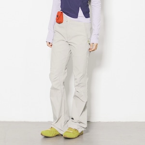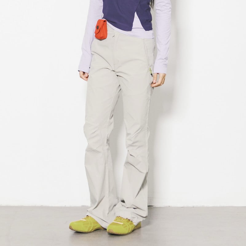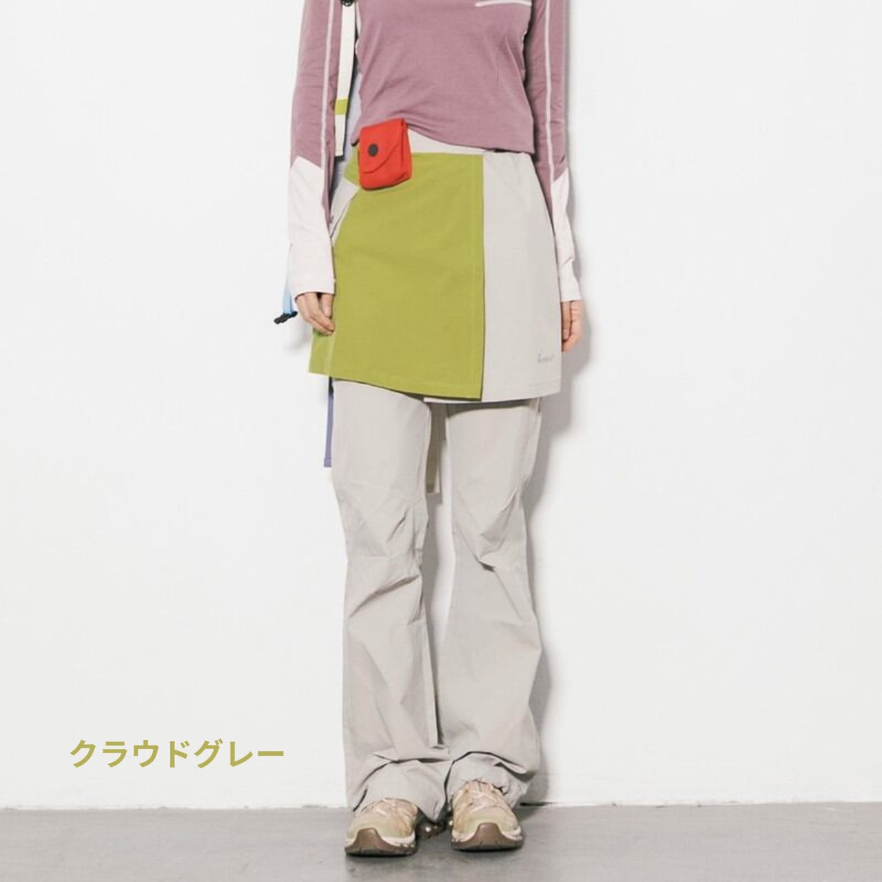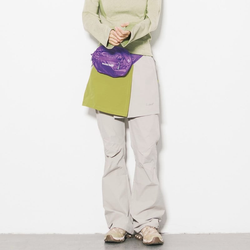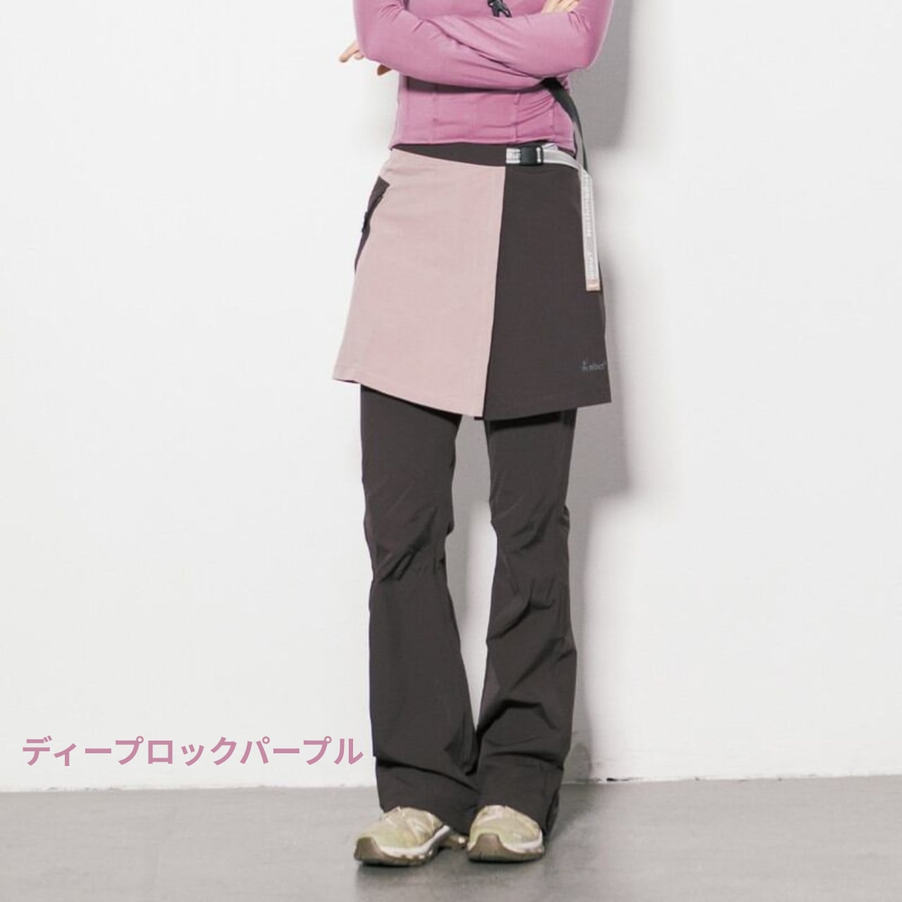 パンツの上にラップスカートを重ねた独創的なレイヤードデザインが、アクティブな機能美と女性らしいニュアンスを両立させるボトムスです。
