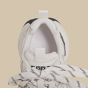複雑に重なり合うアッパーのパネルデザインと、幾重にも交差するシューレースのディテールが、足元に圧倒的な存在感を放つスニーカーです。