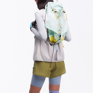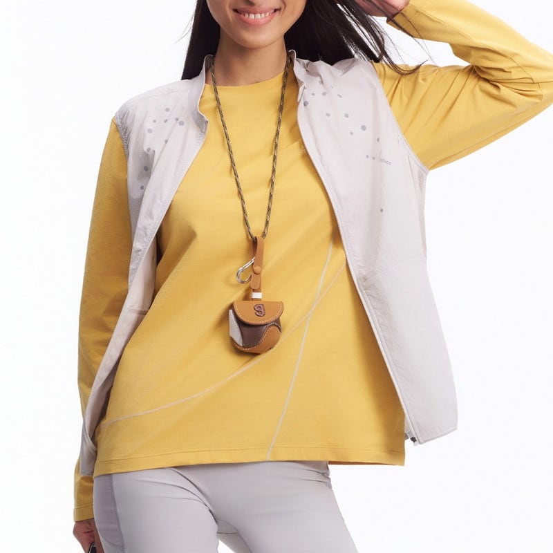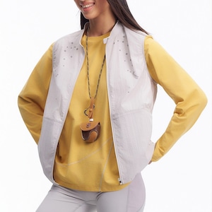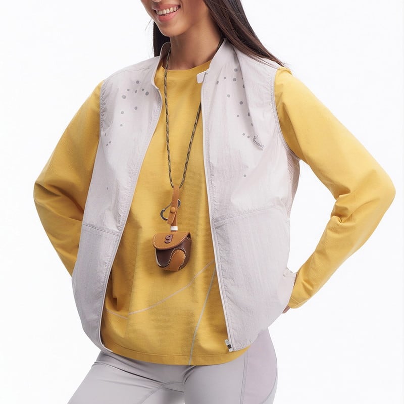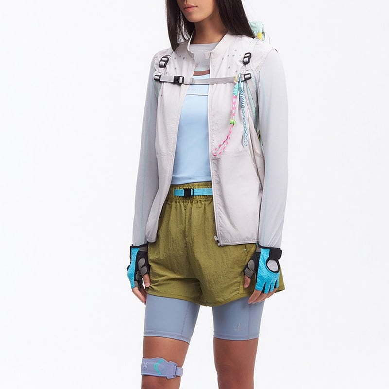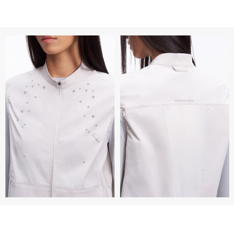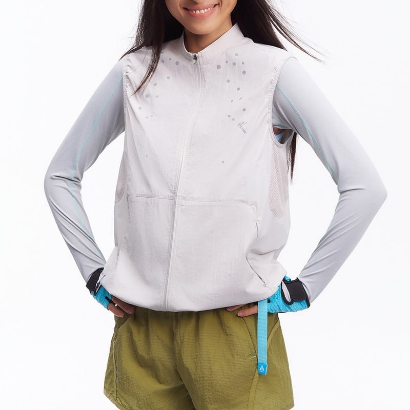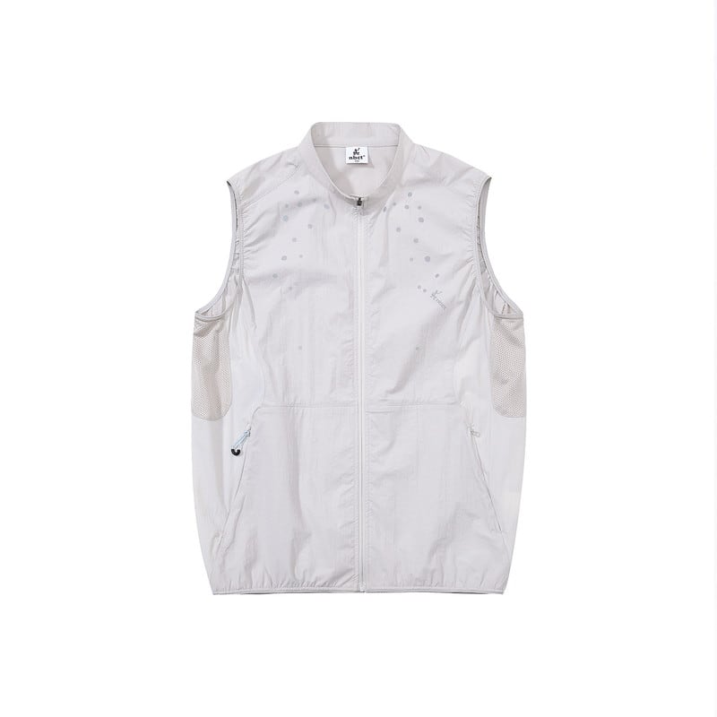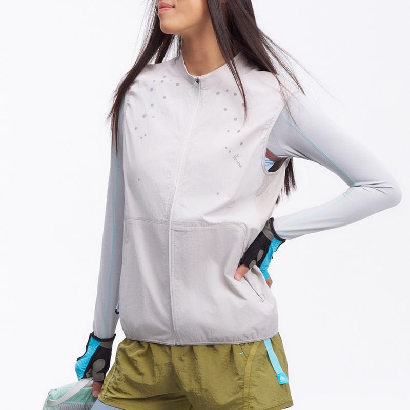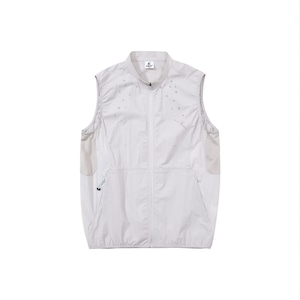 胸元に施された繊細なデザインが、ミニマルな佇まいの中にテクニカルな表情と軽やかさを添えるジップアップベストです。