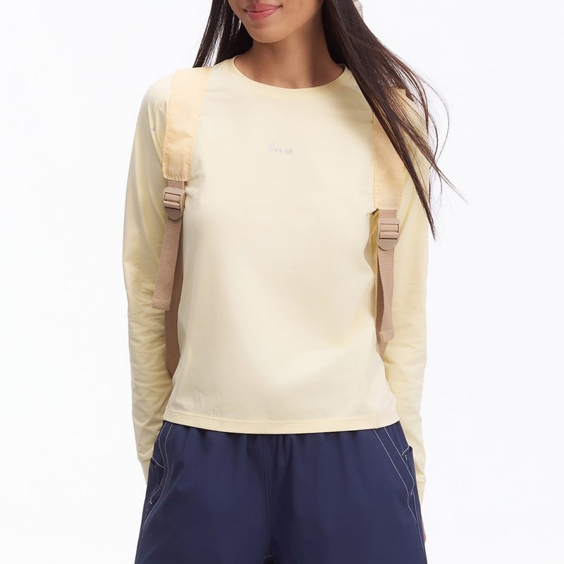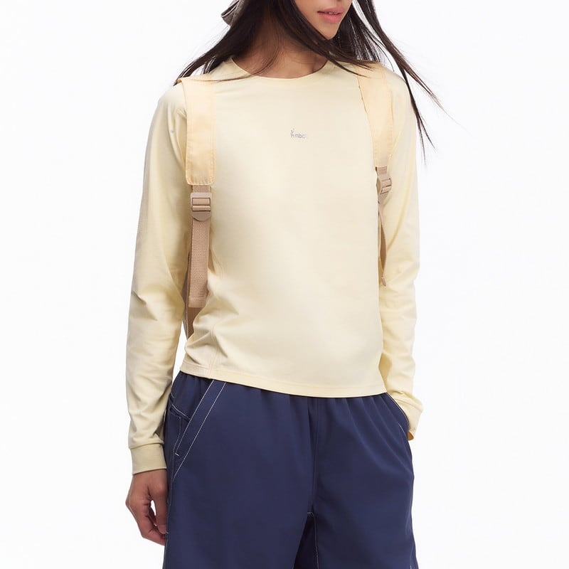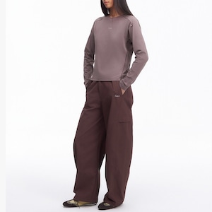 胸元に配された控えめなロゴプリントが、シンプルなデザインの中に洗練されたアクセントを添えるロングスリーブトップスです。