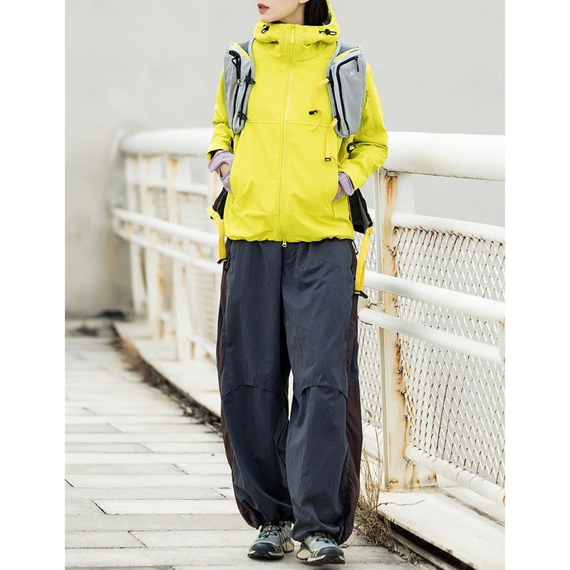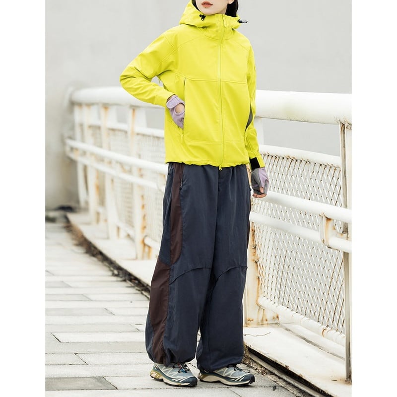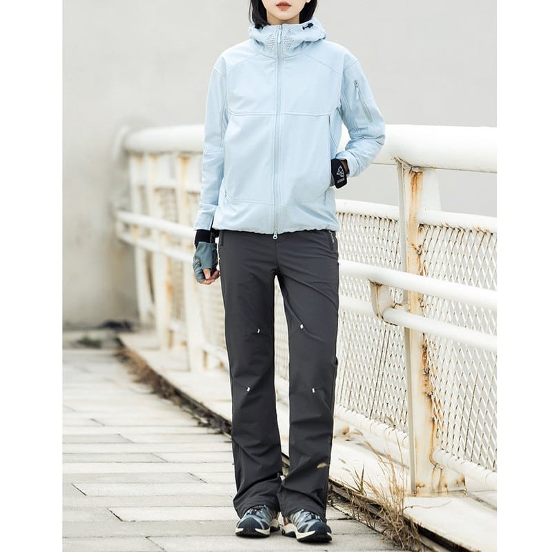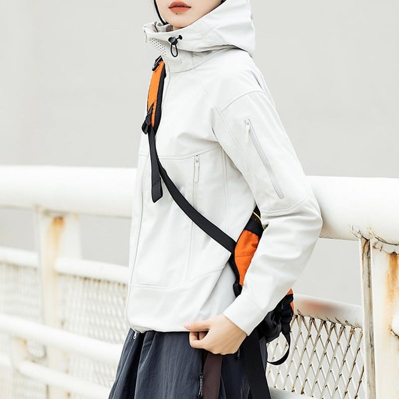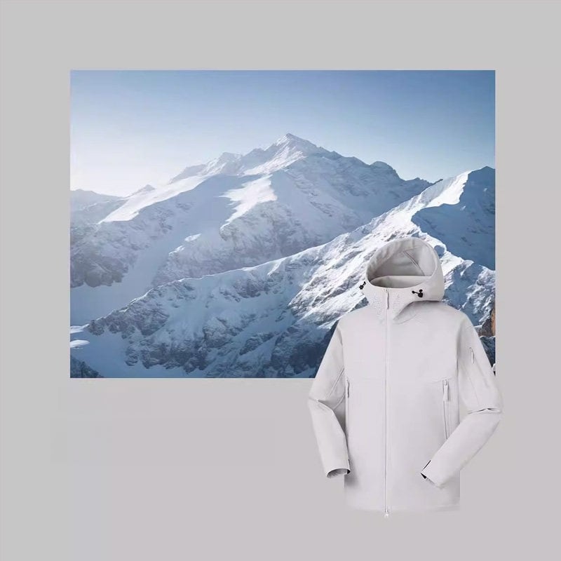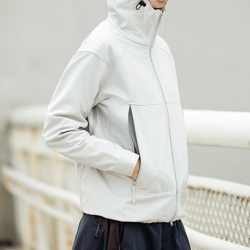包み込むような高い襟ラインと立体的なフード構造が、都会的でストイックな表情を演出するシェルジャケットです。