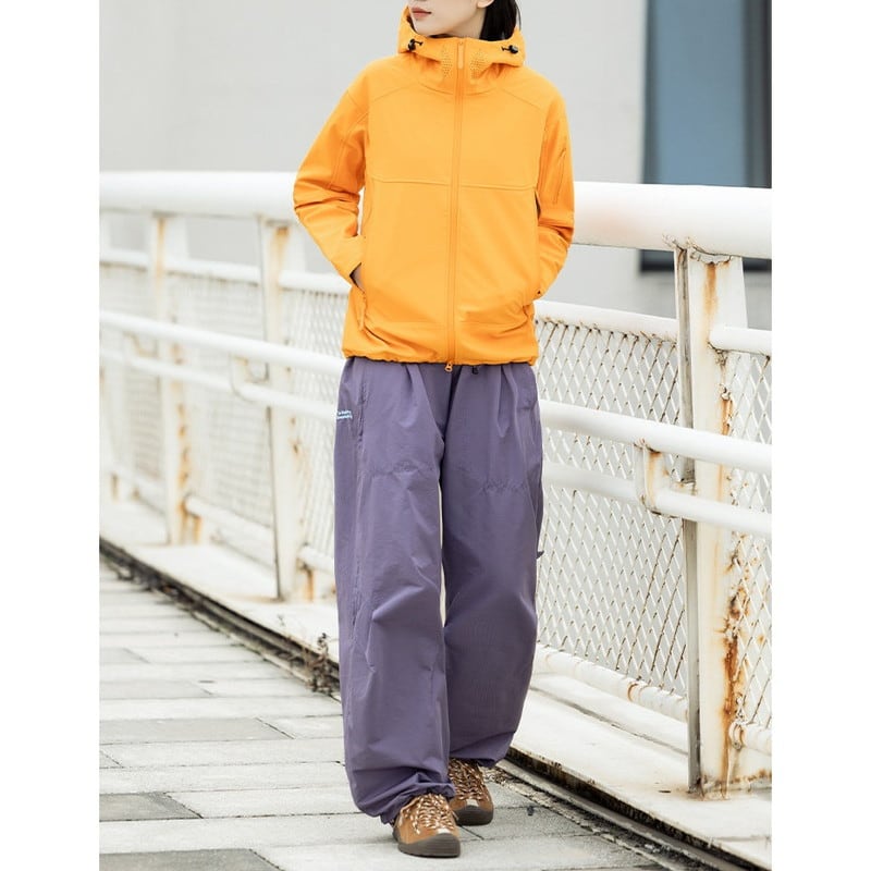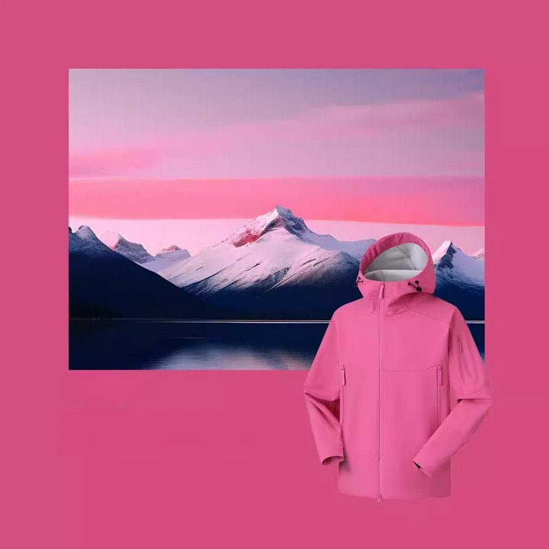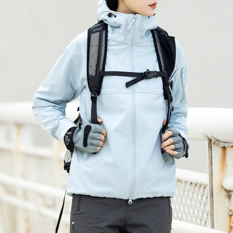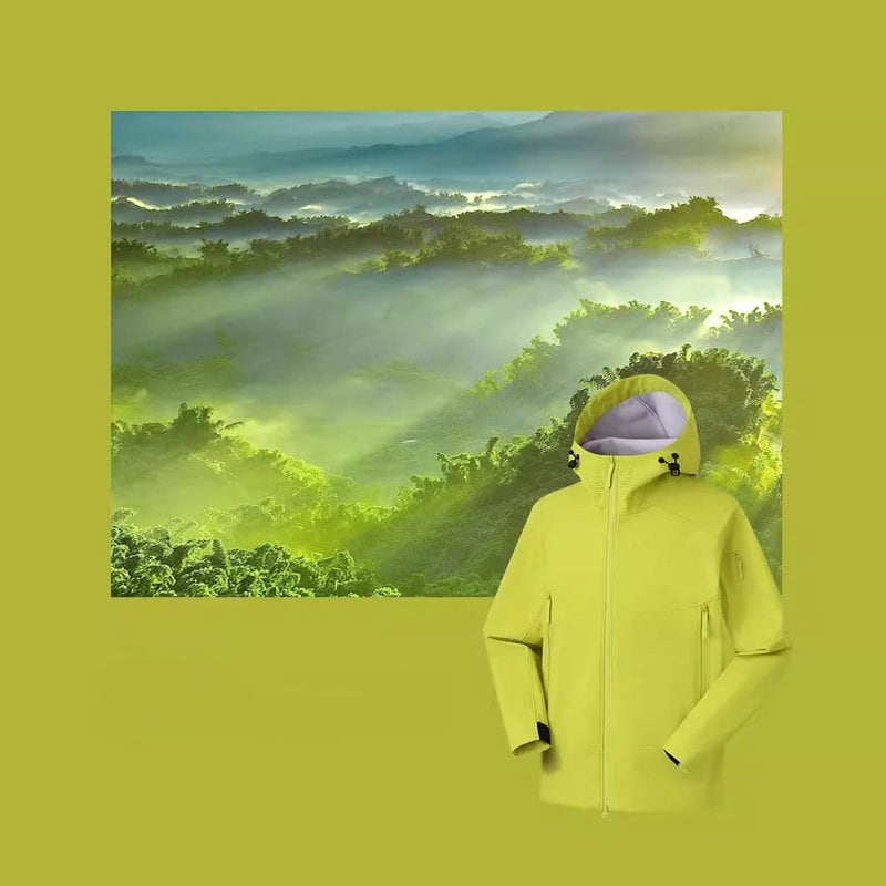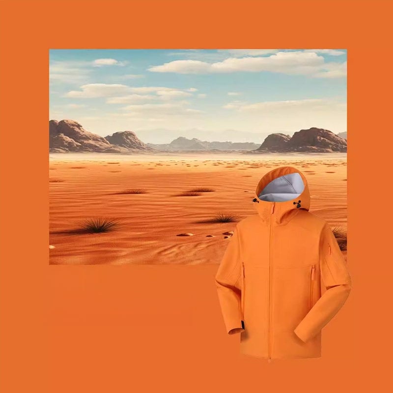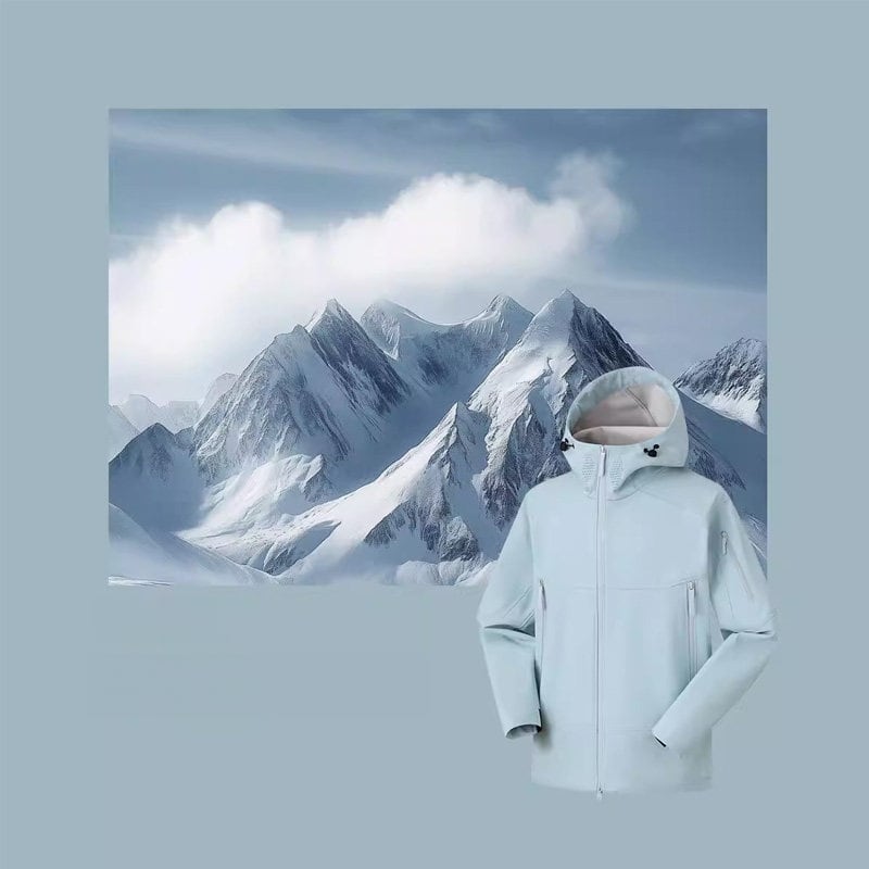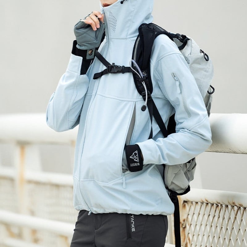 包み込むような高い襟ラインと立体的なフード構造が、都会的でストイックな表情を演出するシェルジャケットです。