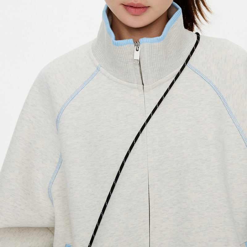 肩周りの動きを妨げないラグランスリーブと、全体に施された繊細なステッチワークが、都会的で洗練された表情を演出するジップアップトップスです。