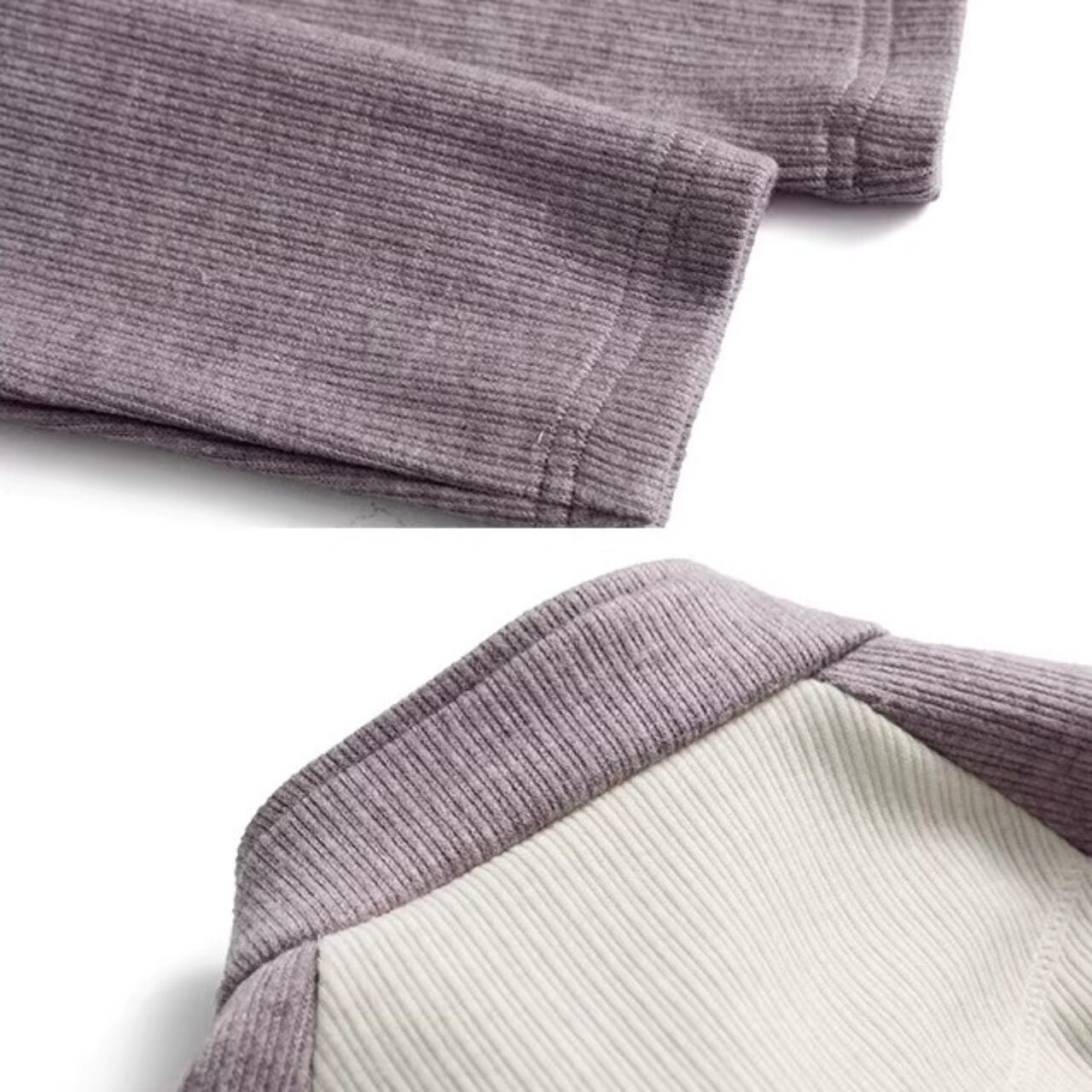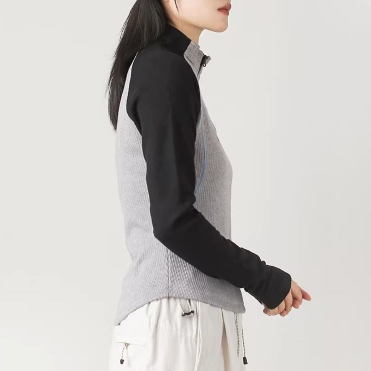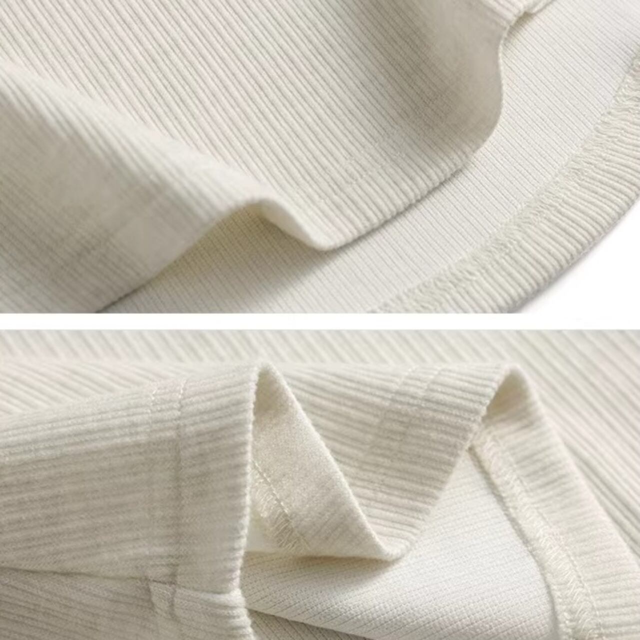 縦ラインを強調するリブ調のディテールとスリムなシルエットで、着痩せ効果抜群のトップス。