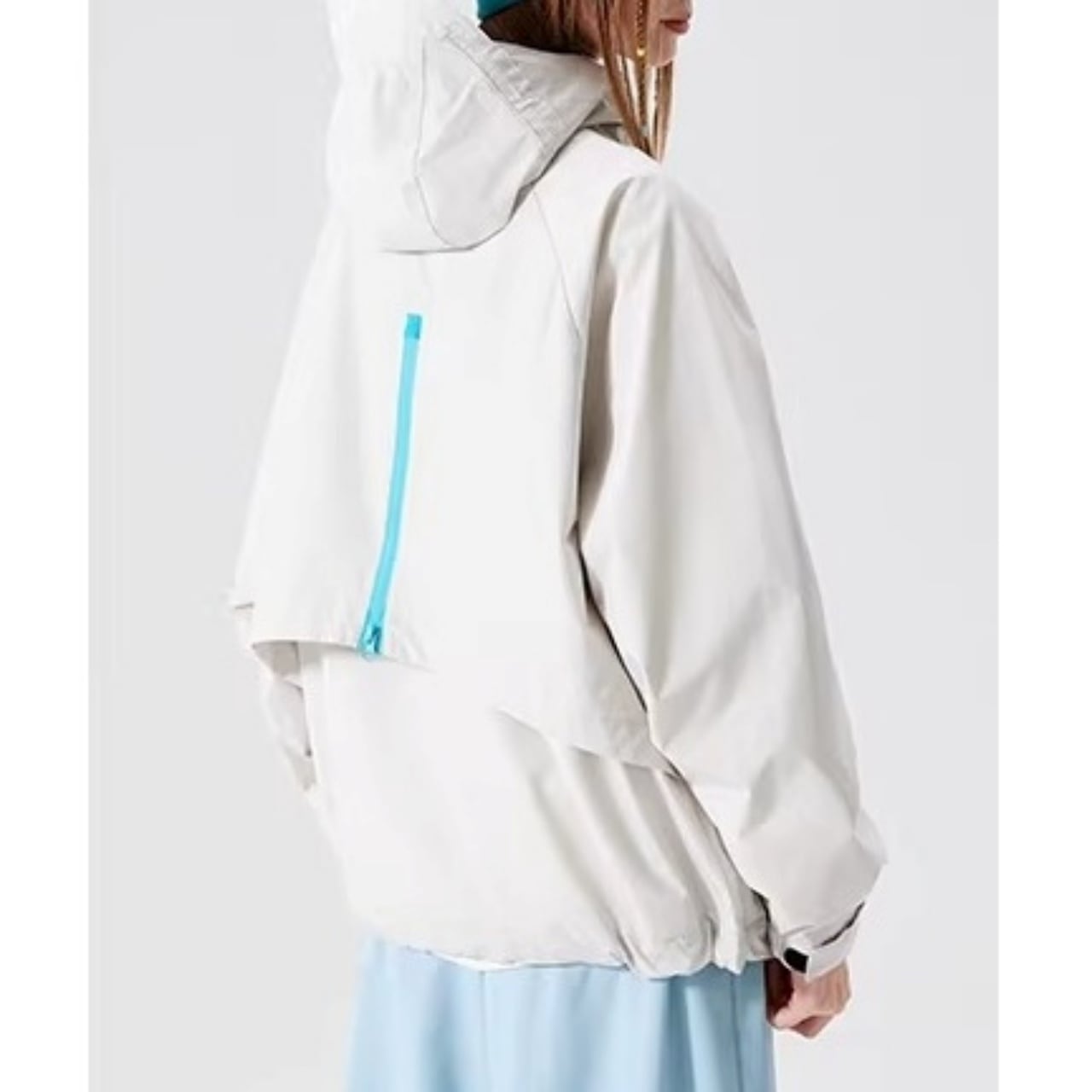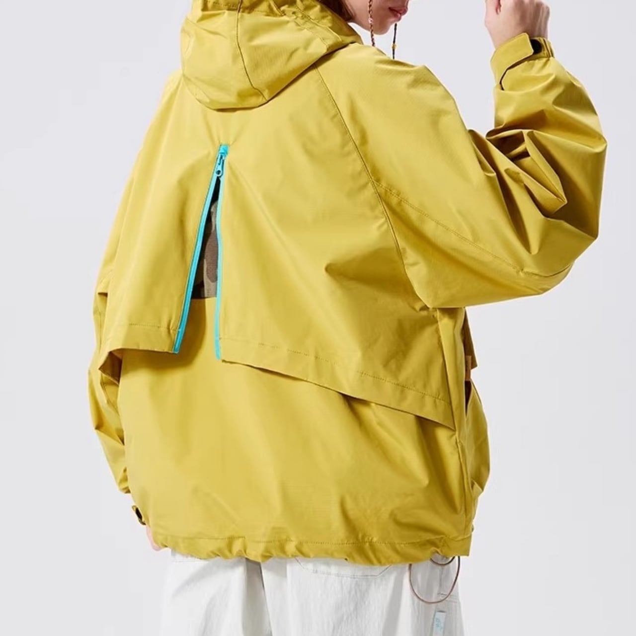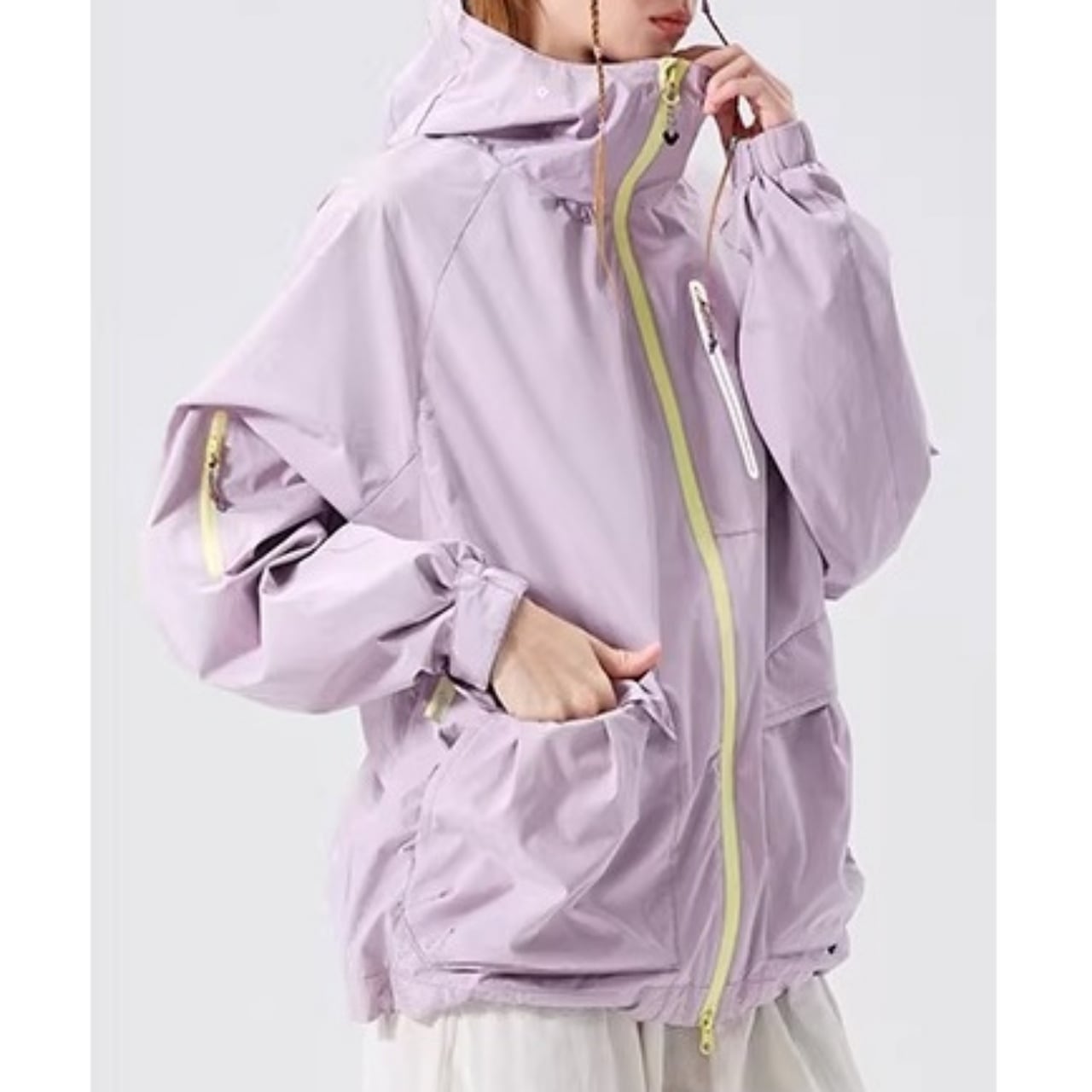 首元までしっかりカバーするハイネック仕様のフードが、洗練されたアクティブな印象を与えます。