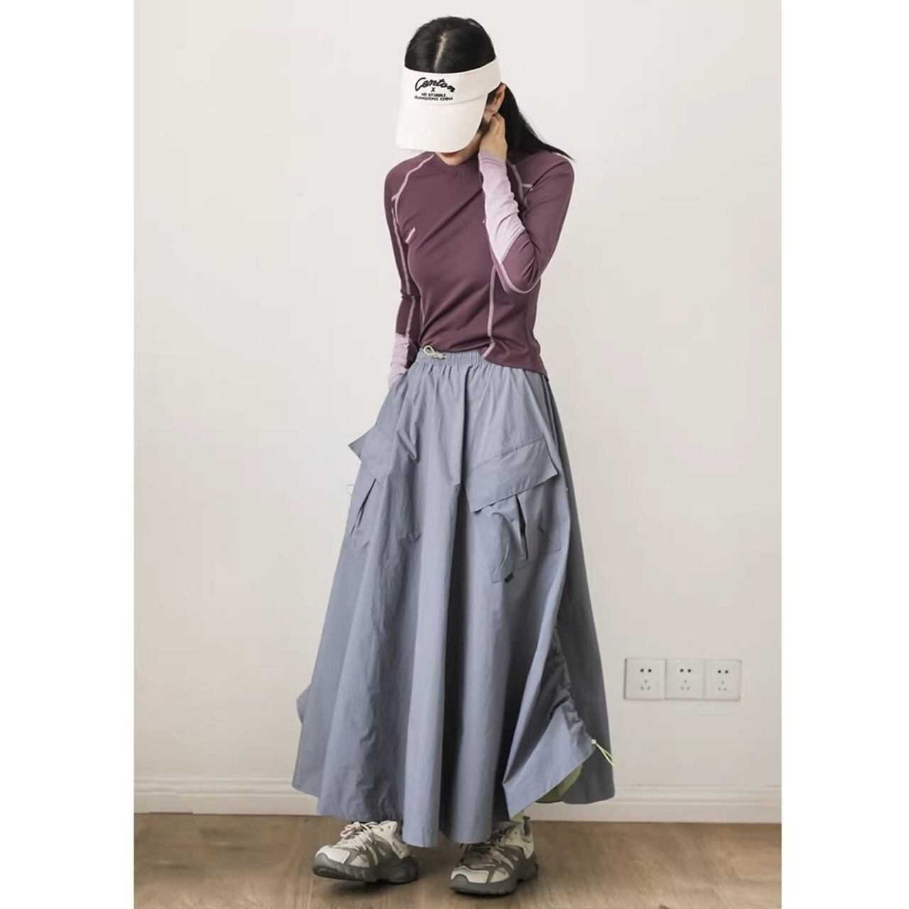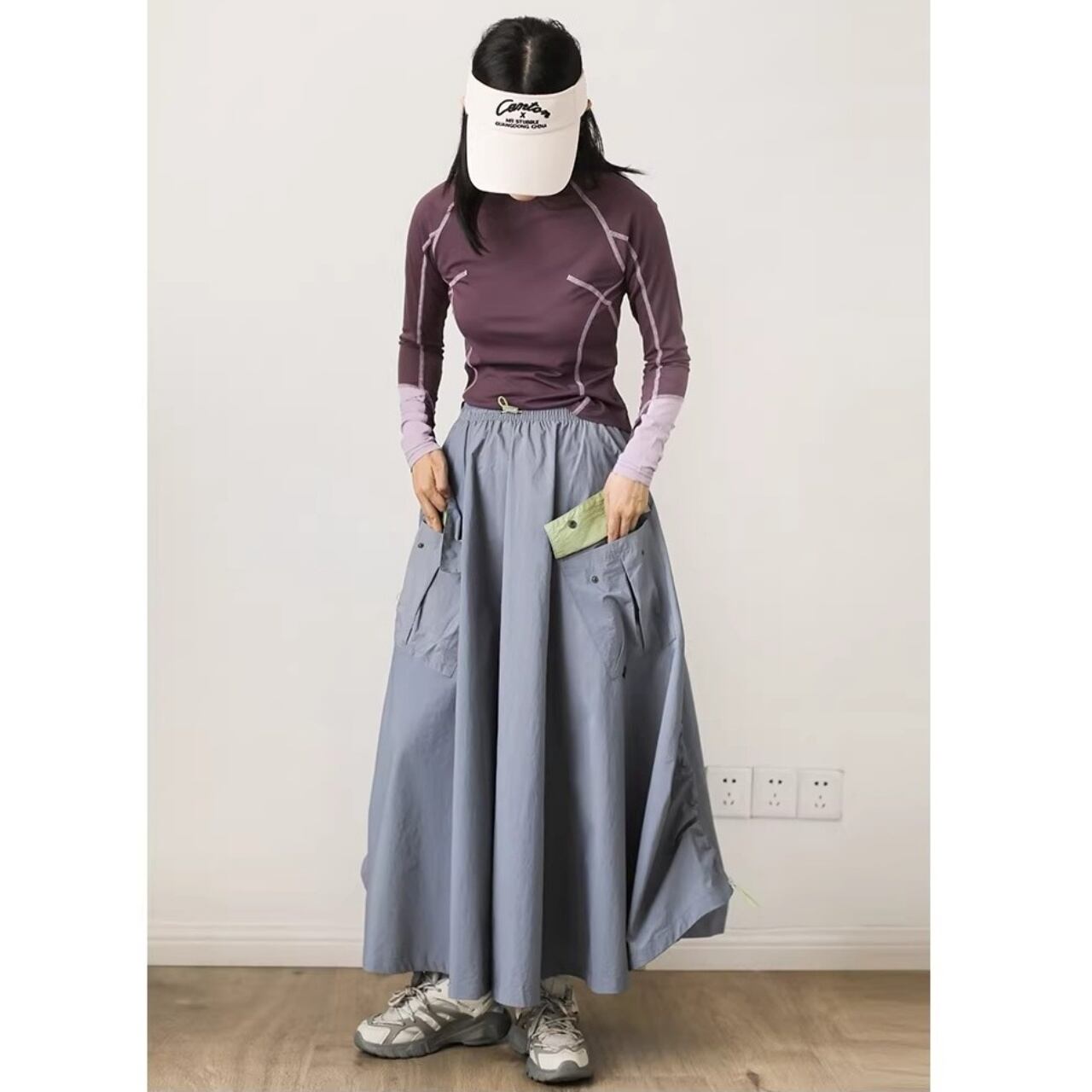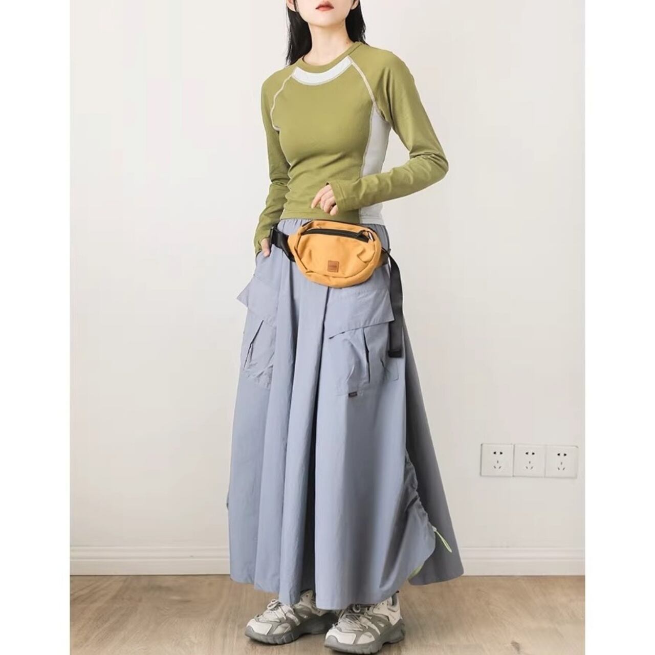 パッチポケットがアクセントになったミモレ丈Aラインスカート。