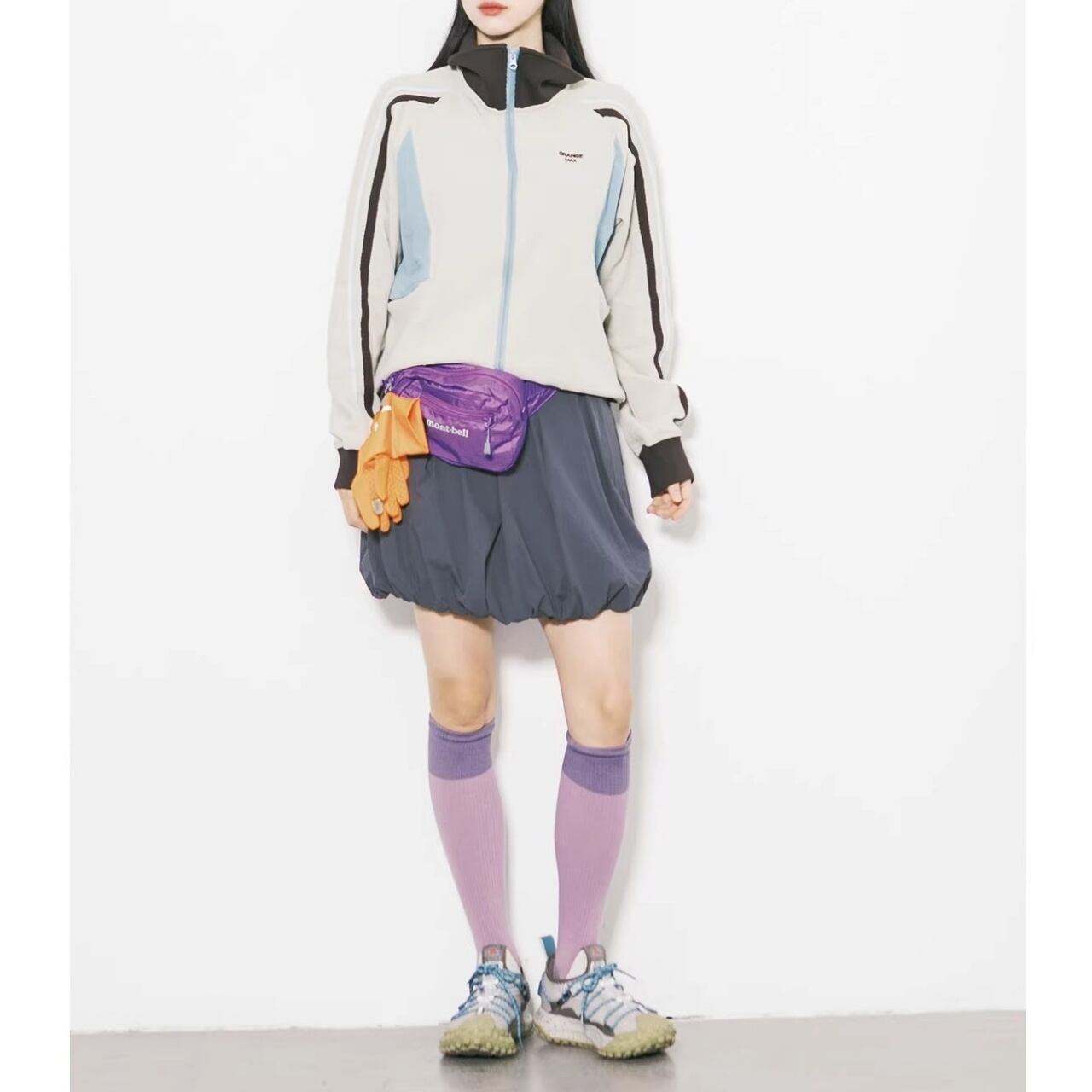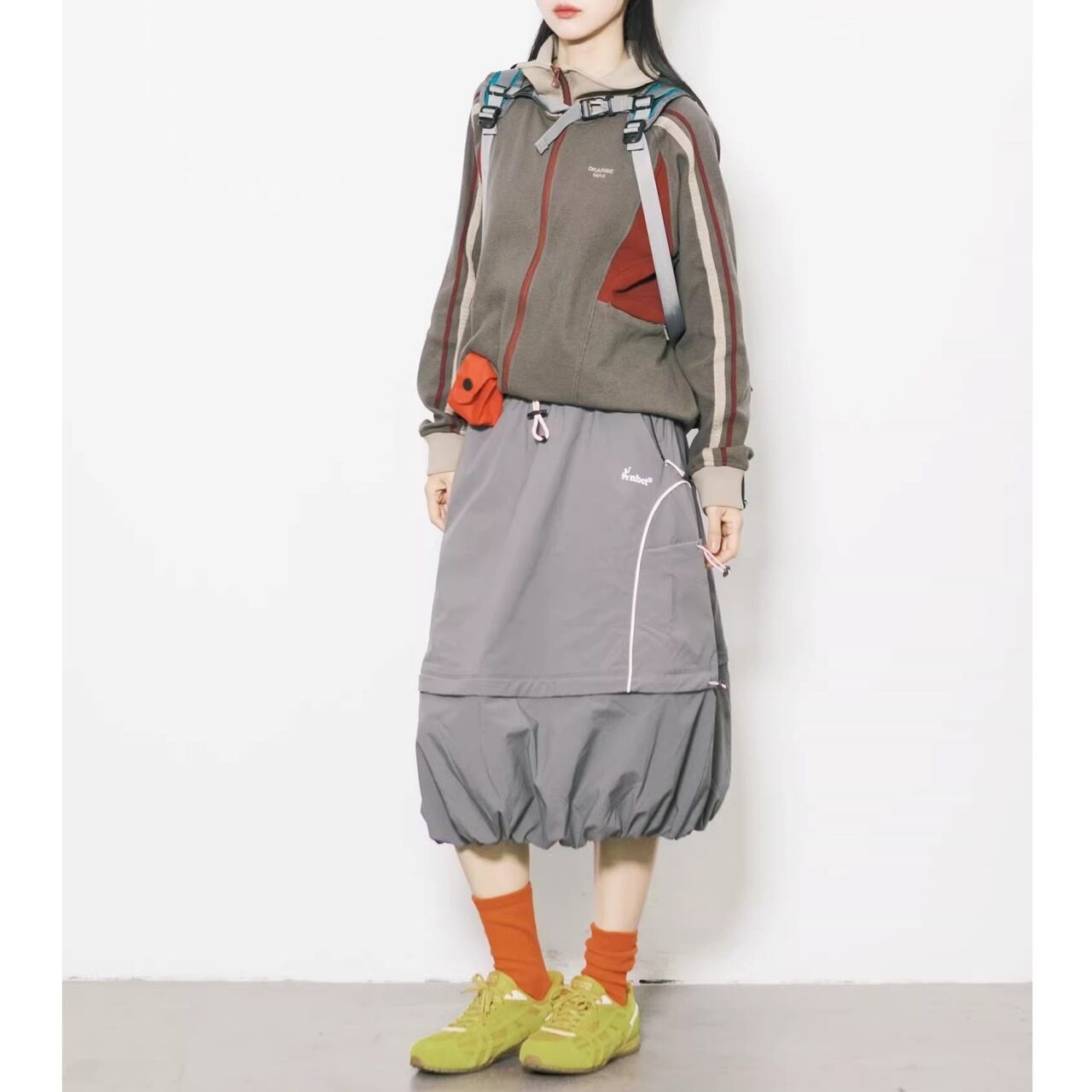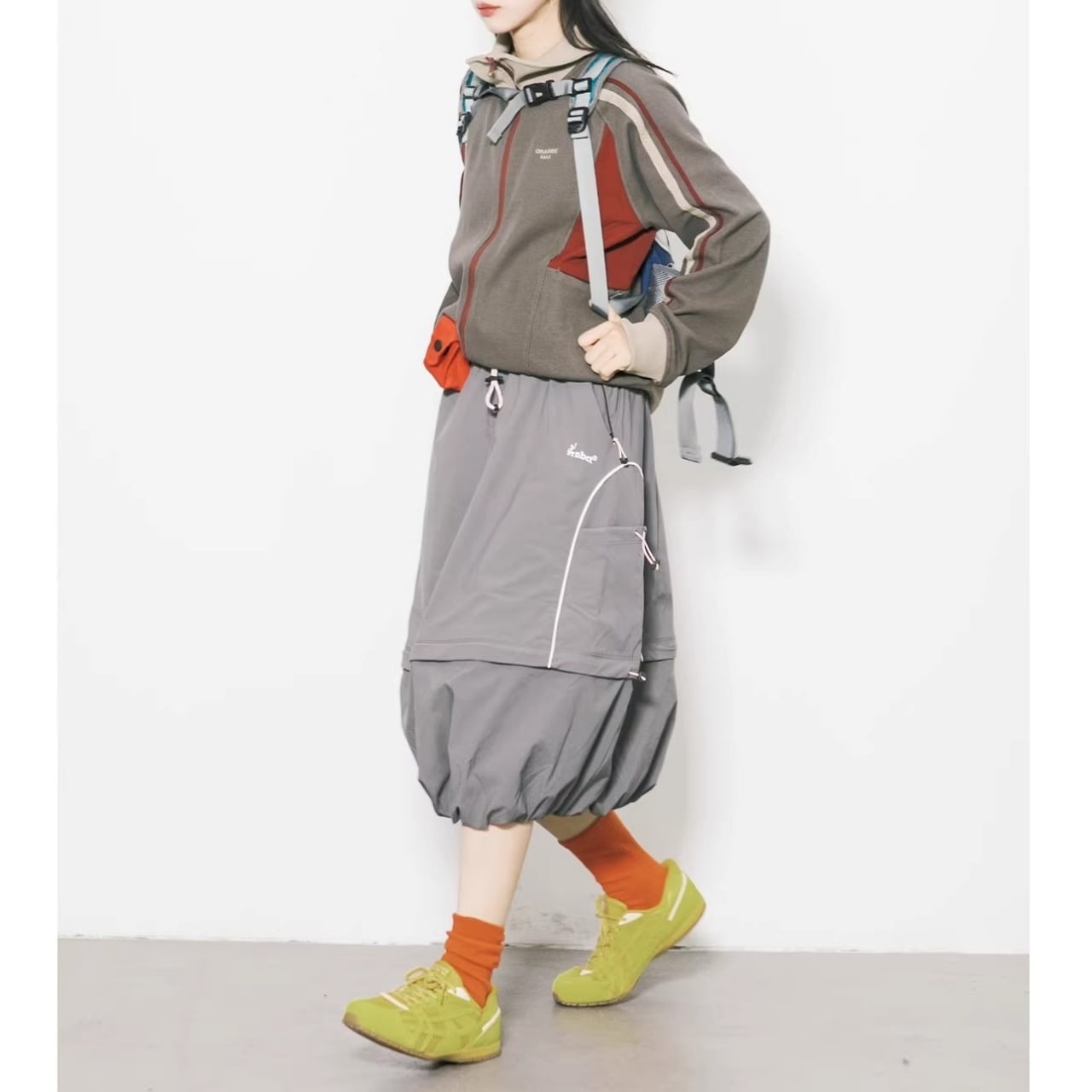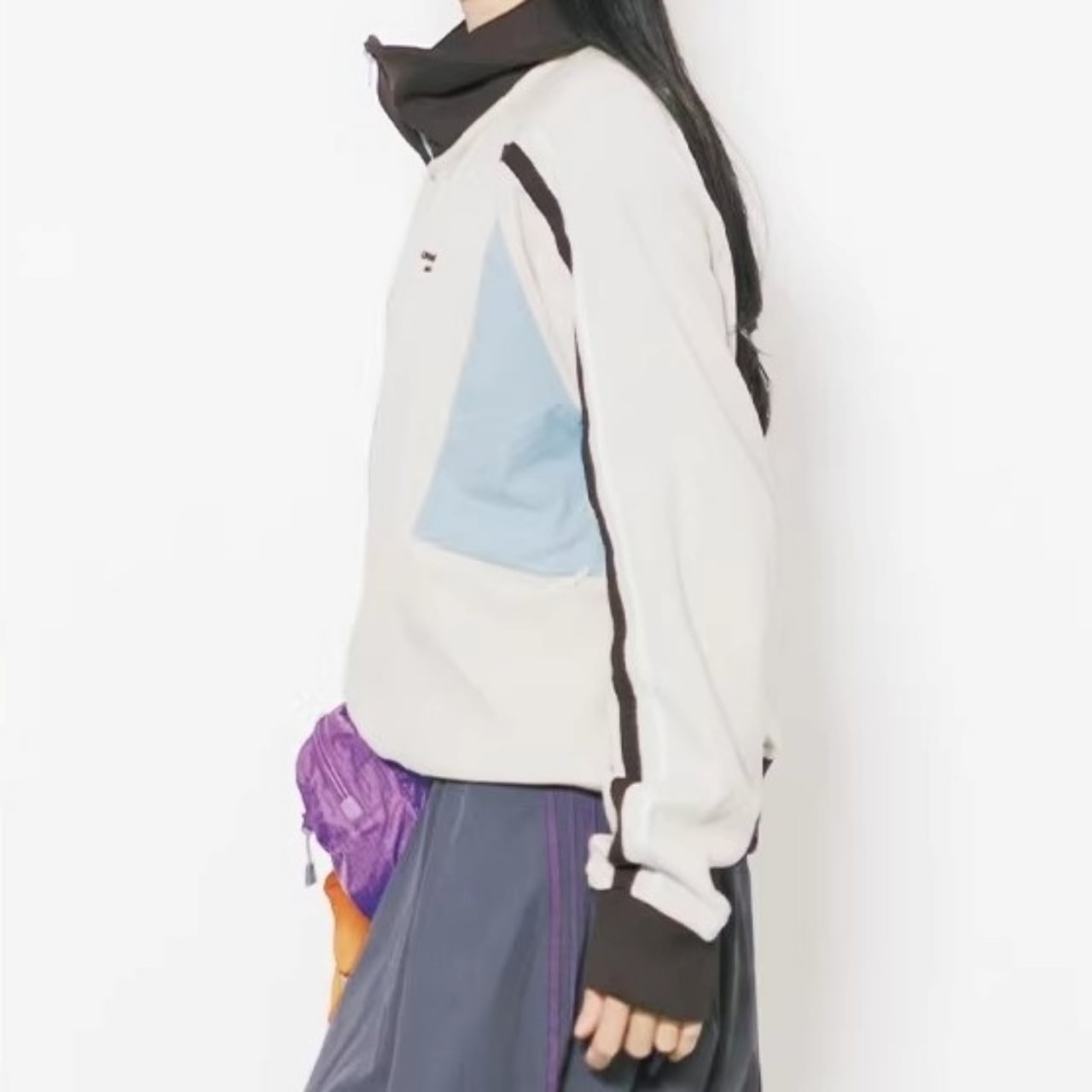 サイドのパネルカラーと袖のライン使いが、都会的なストリートスタイルを演出します。