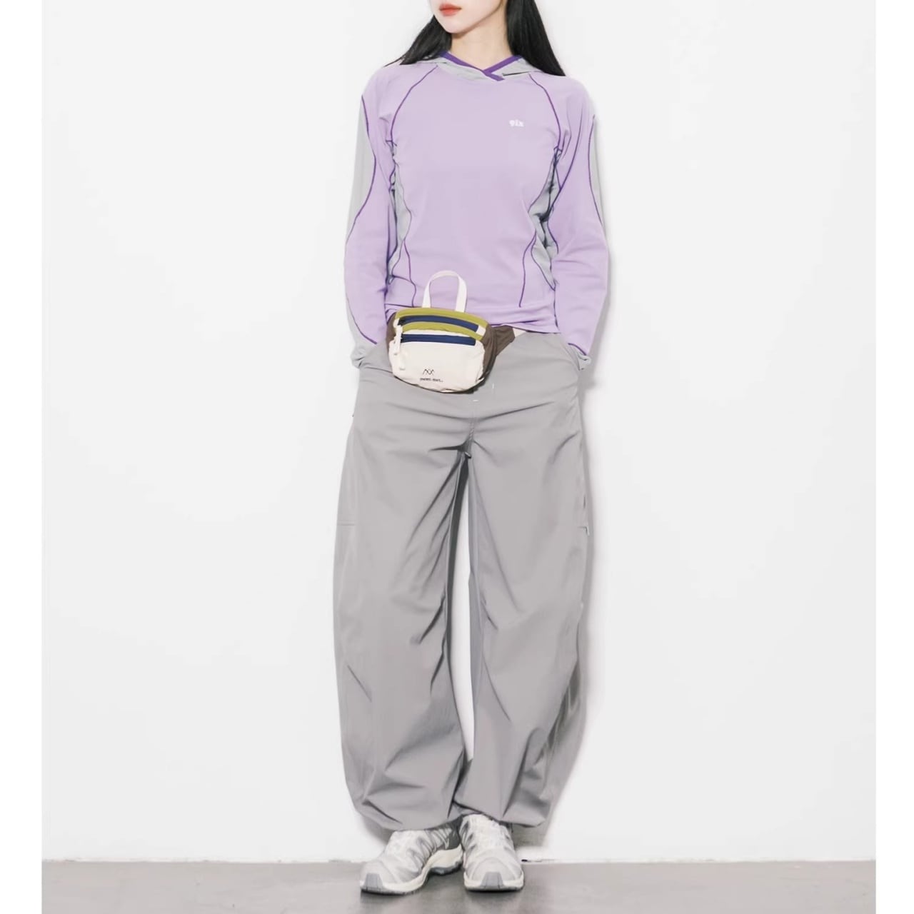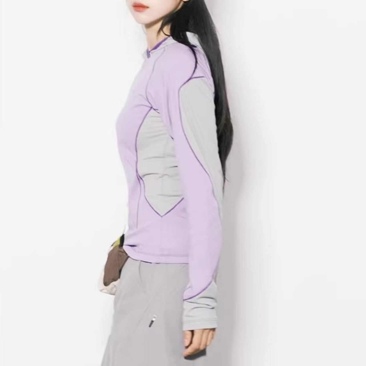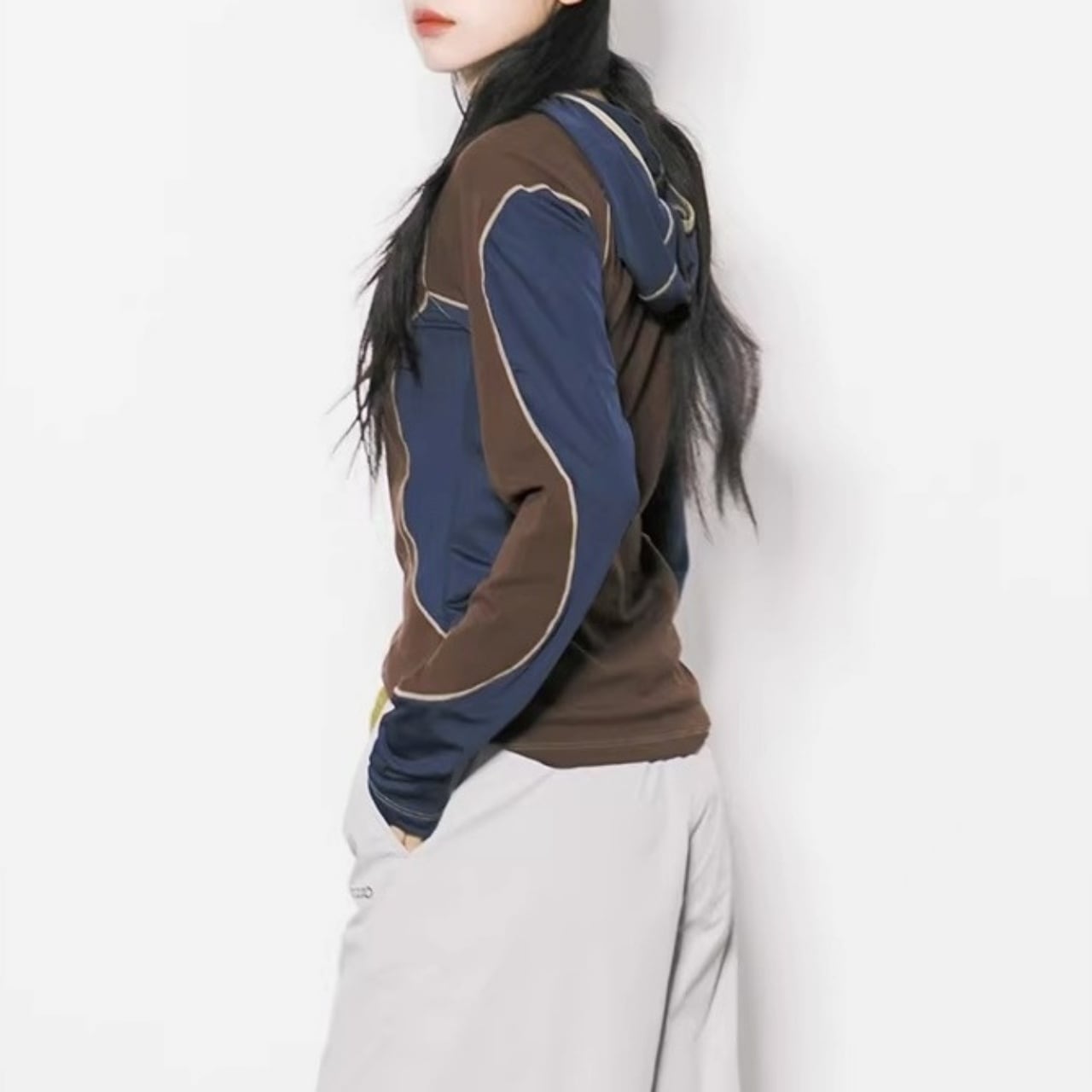 サイドや袖にあしらわれた大胆な配色ラインが、視覚的にシャープな印象を与えます。