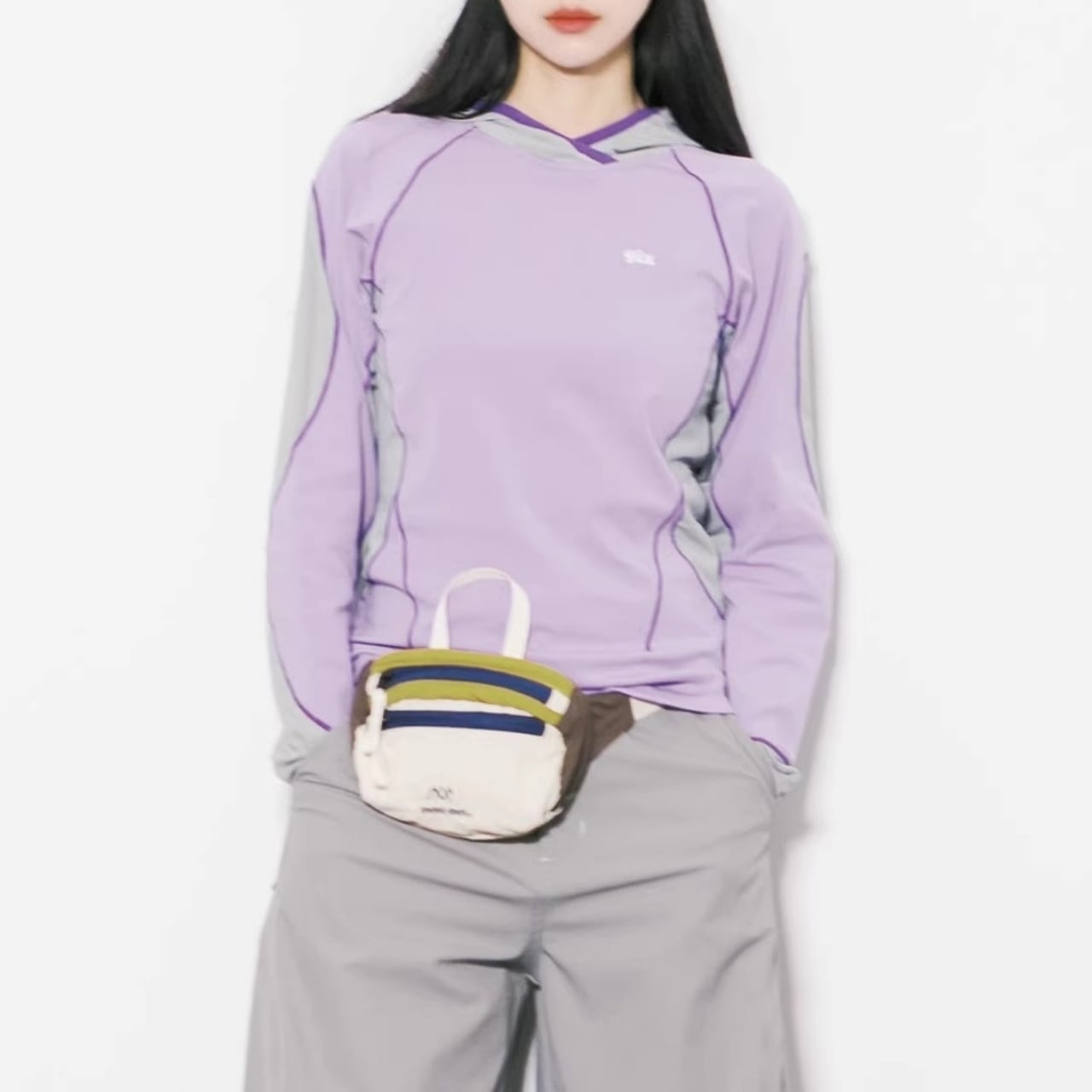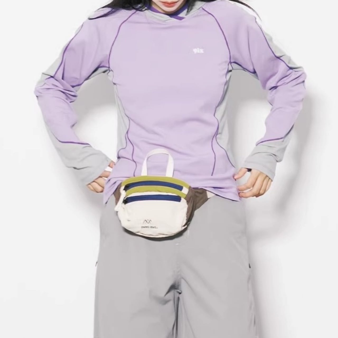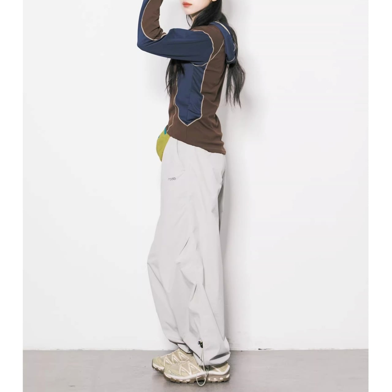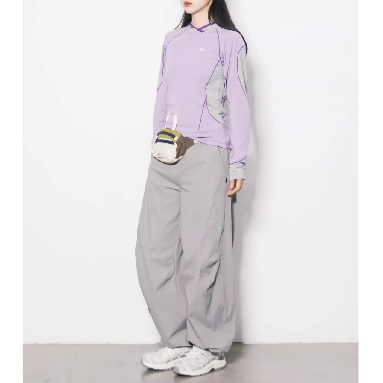 サイドや袖にあしらわれた大胆な配色ラインが、視覚的にシャープな印象を与えます。