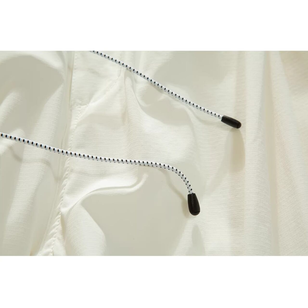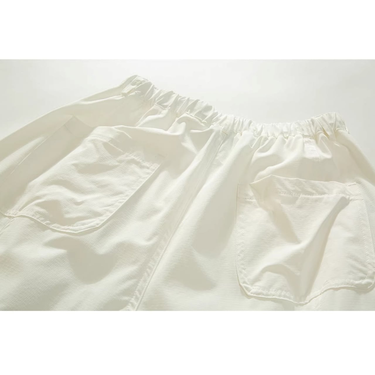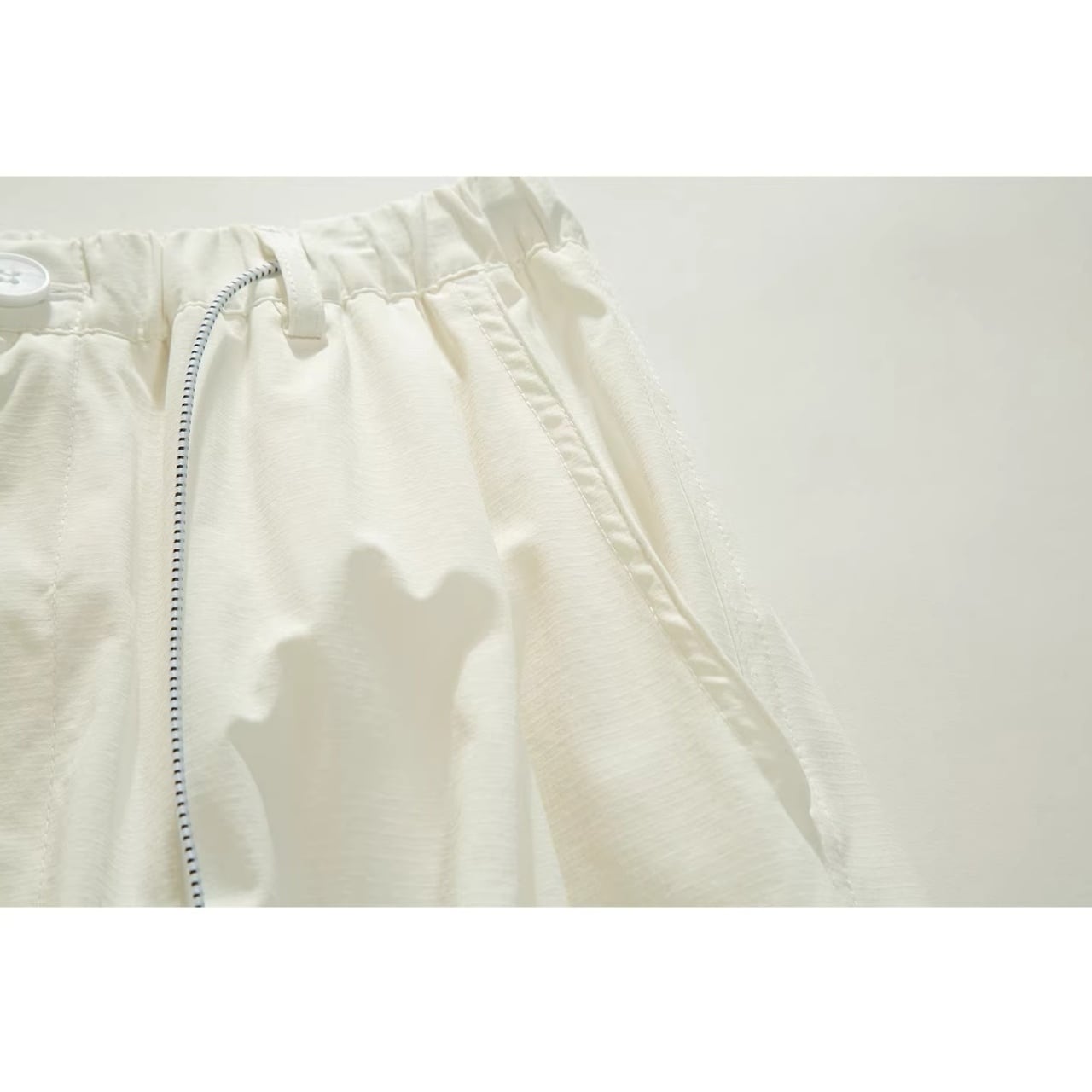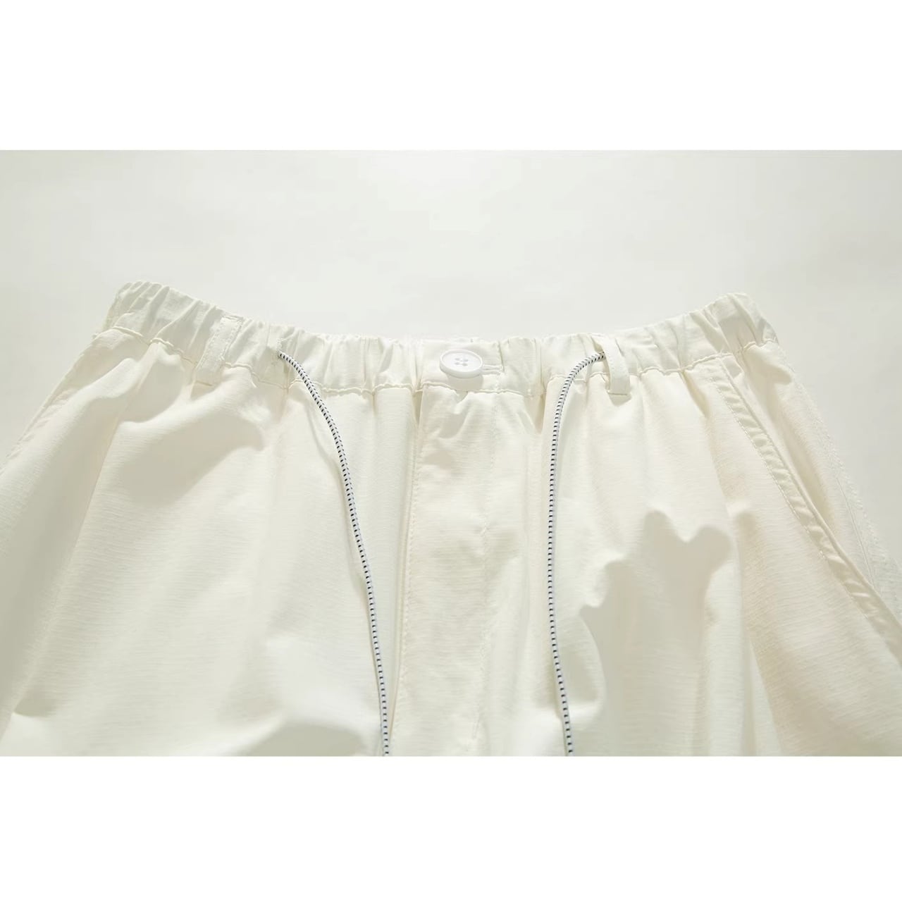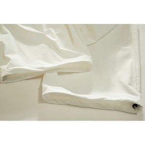 ウエストはゴム仕様にボタンと長めの紐を配し、タックインした際のアクセントに。