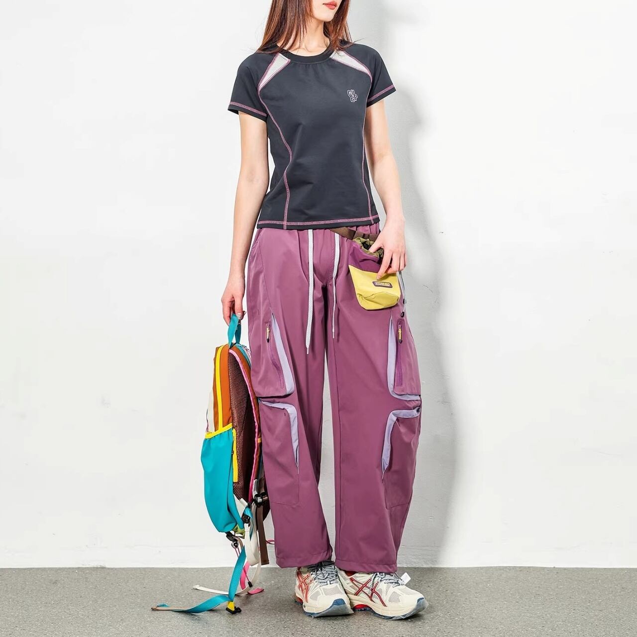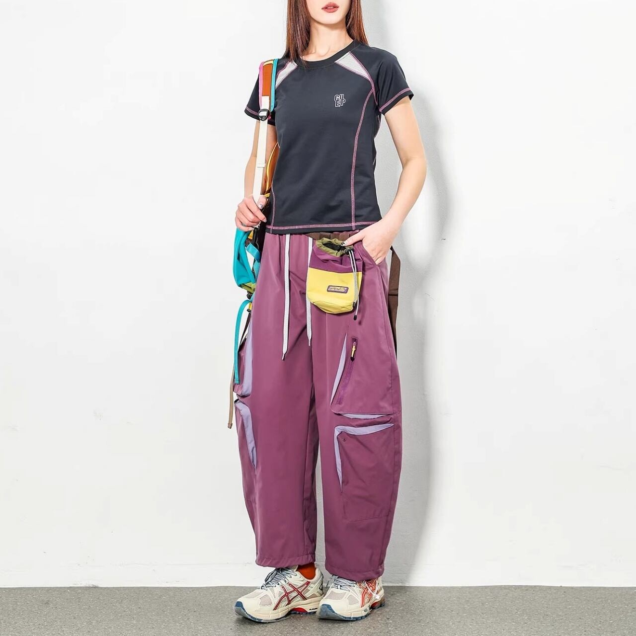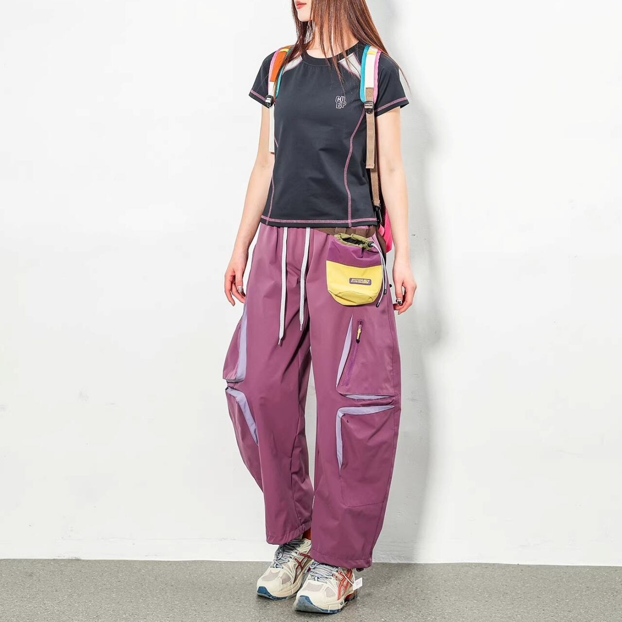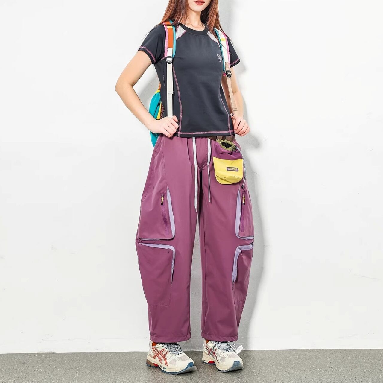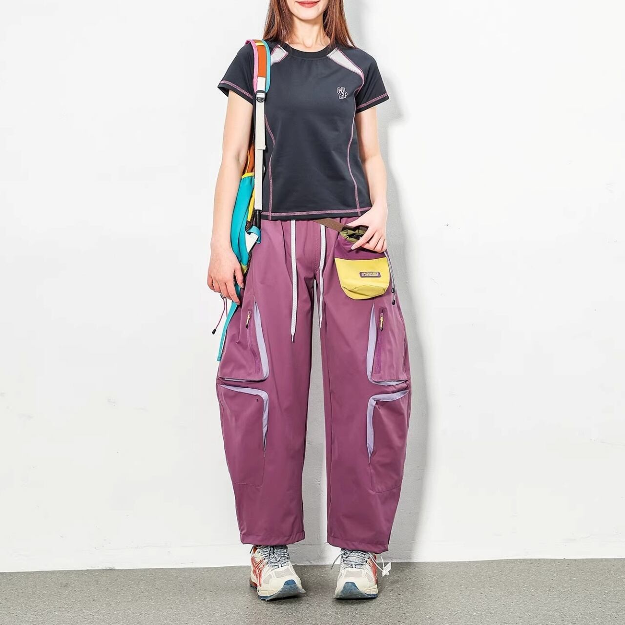 膝周りに配置された多機能ジップポケットが、テック感のある都会的なスタイルを演出します。