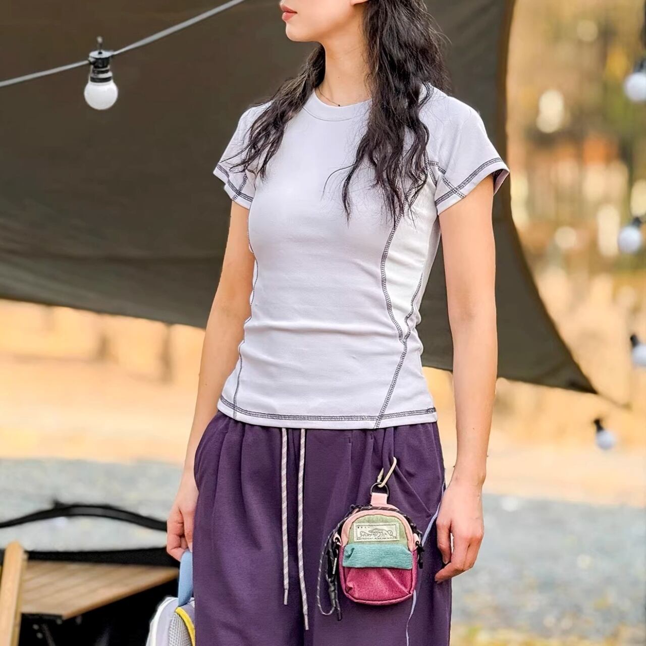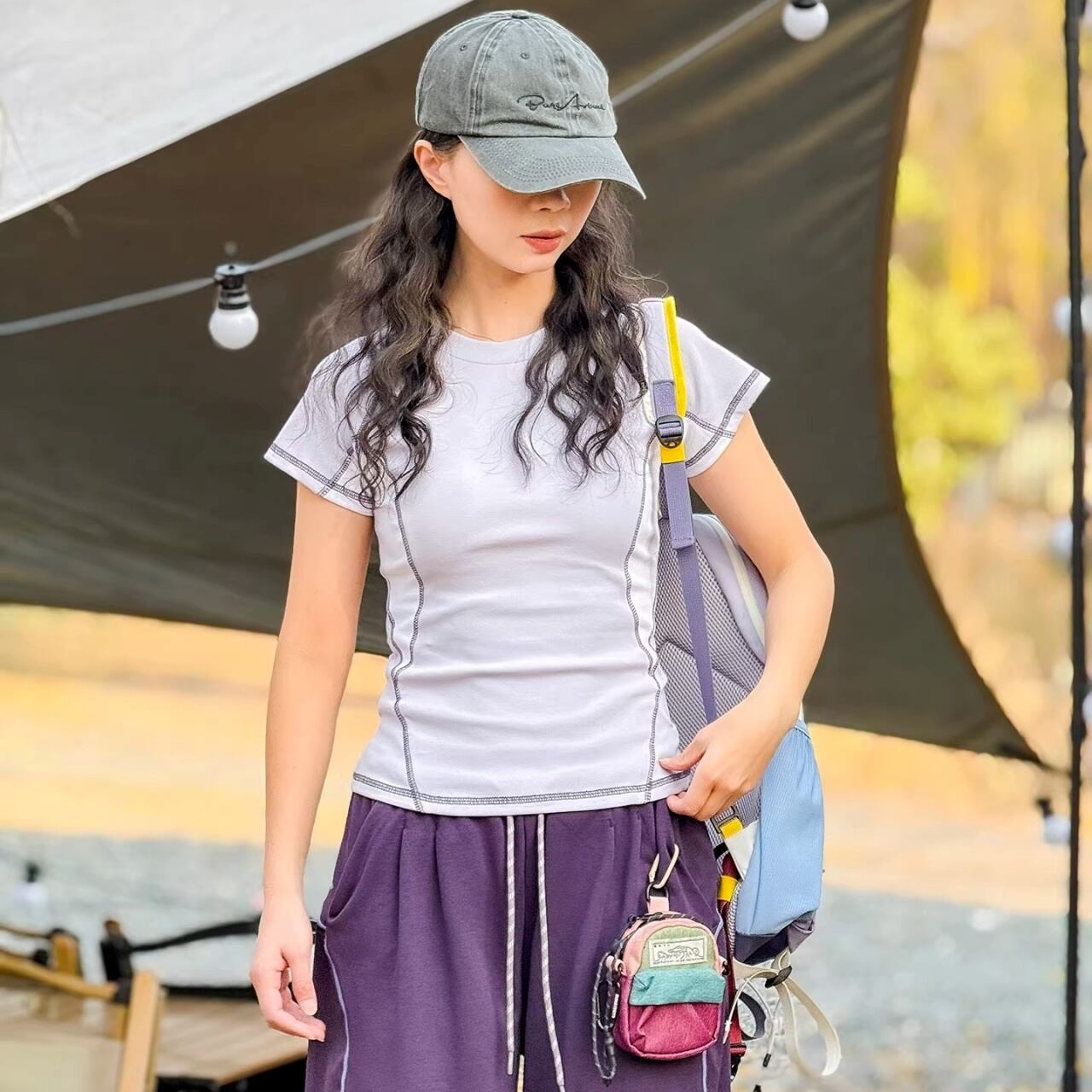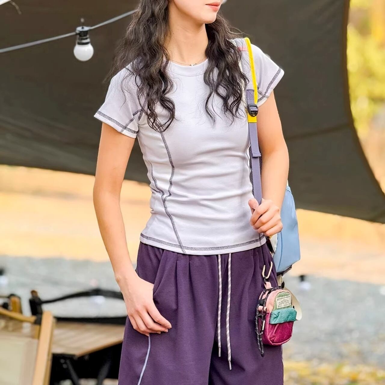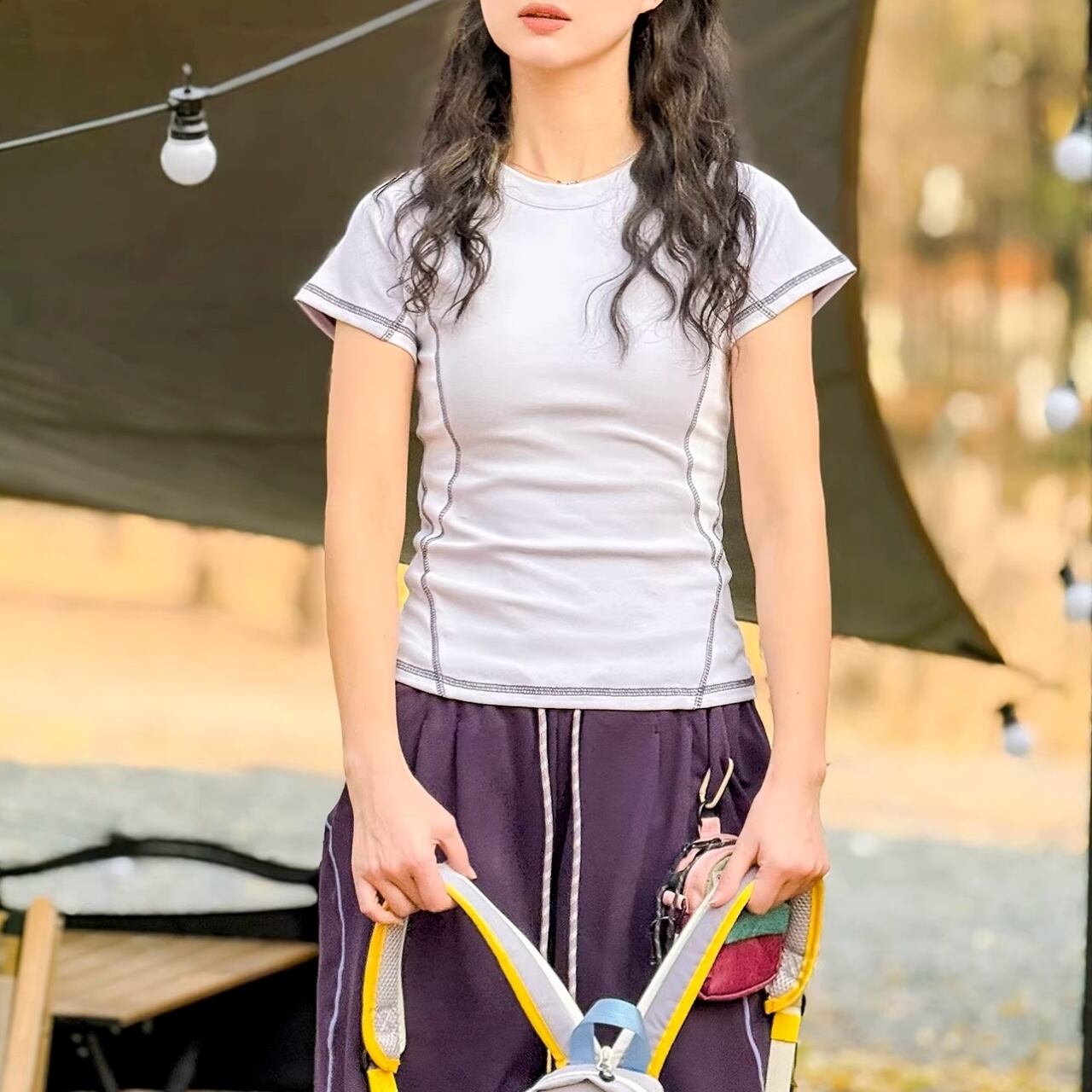 ステッチがアクセントになったクロップド丈の半袖Tシャツ。