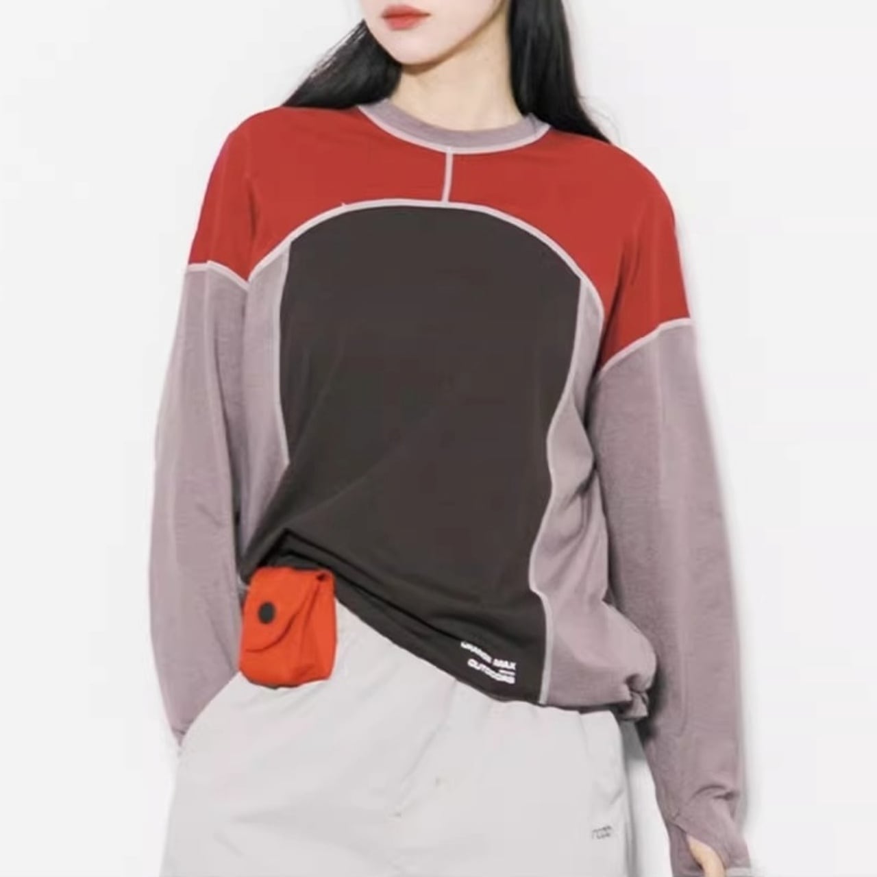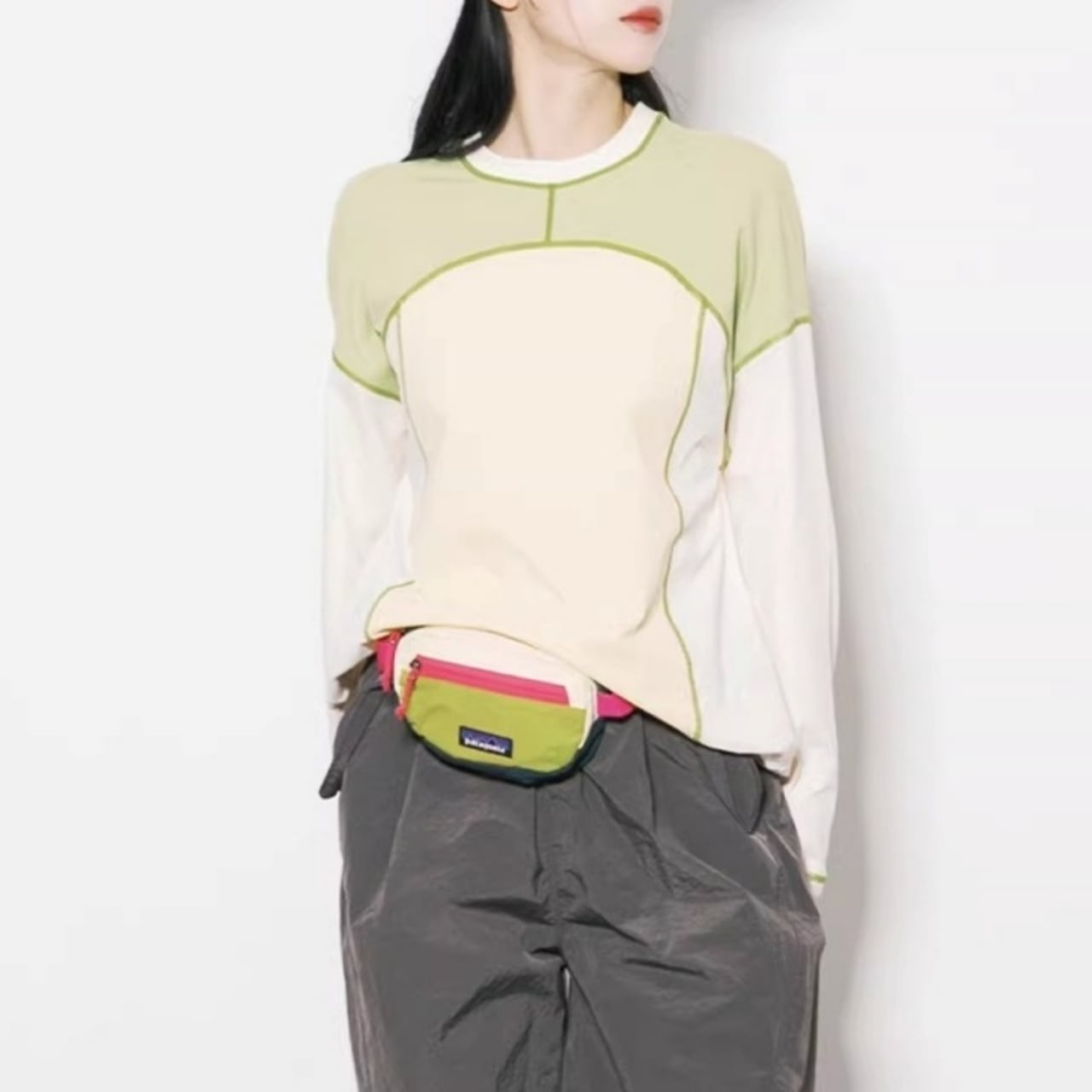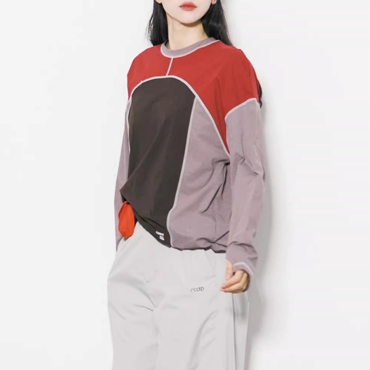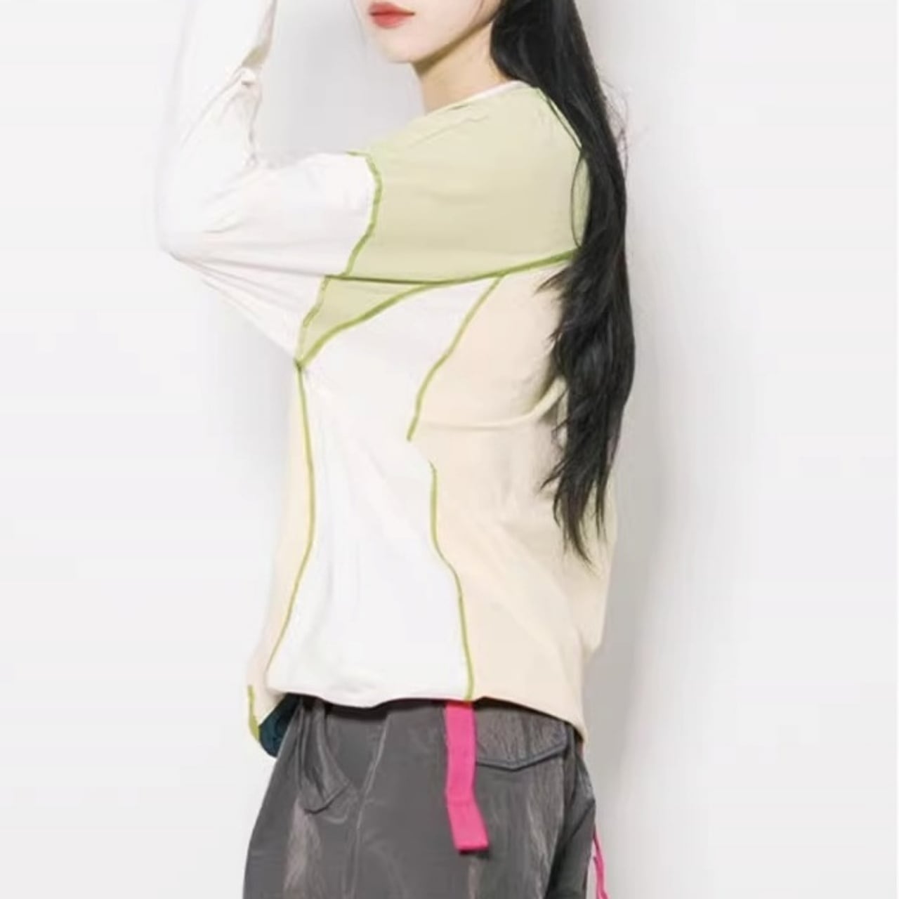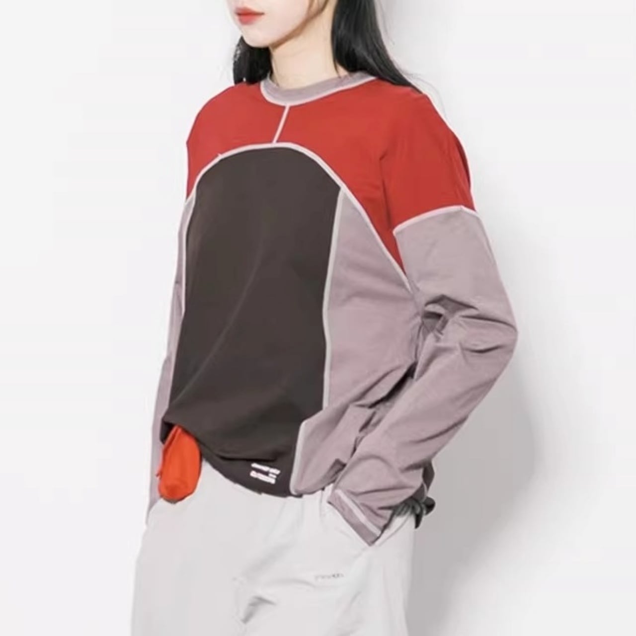 大胆な切り替えデザインと配色ステッチが目を引く、主役級のロンT。