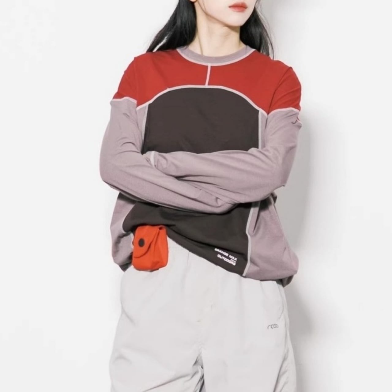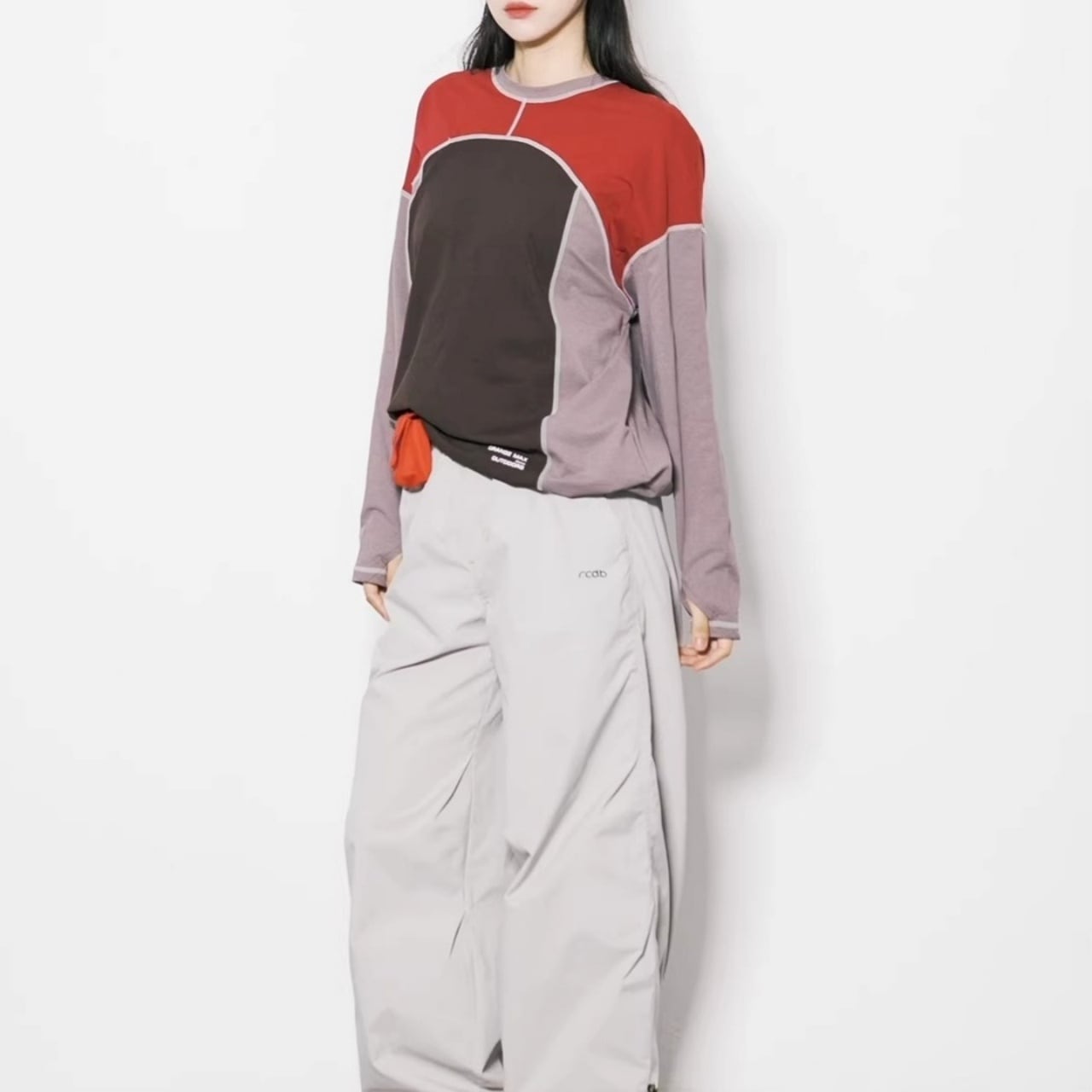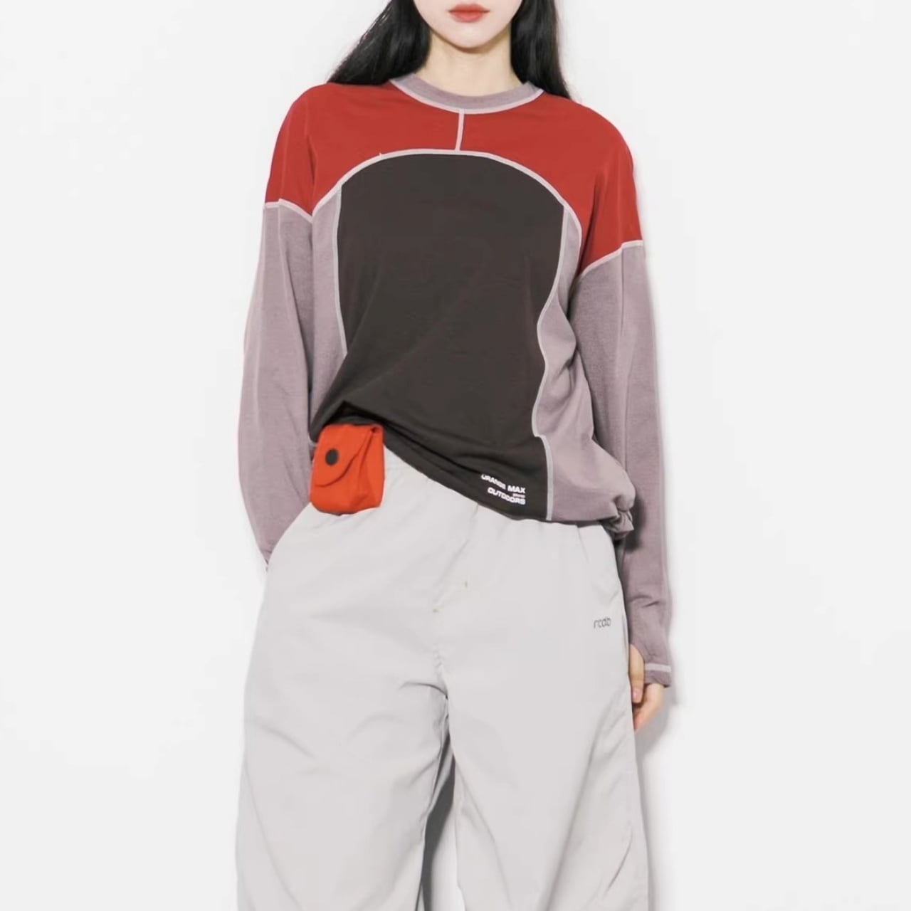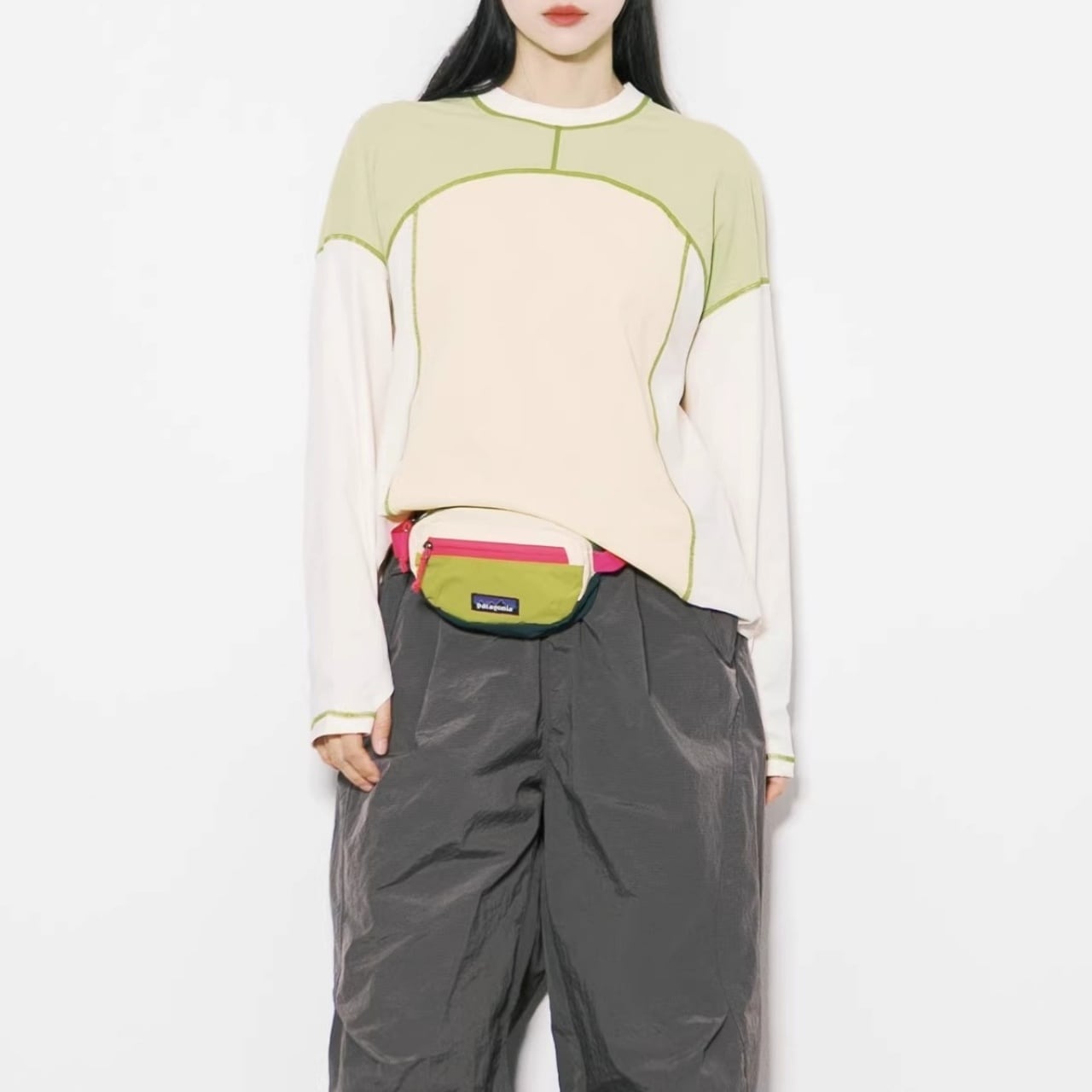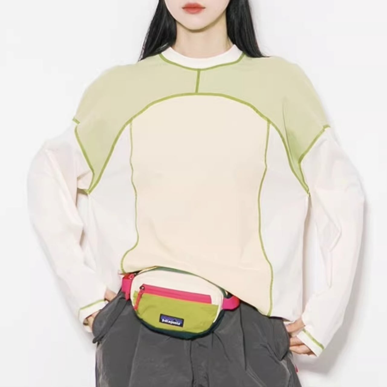 大胆な切り替えデザインと配色ステッチが目を引く、主役級のロンT。