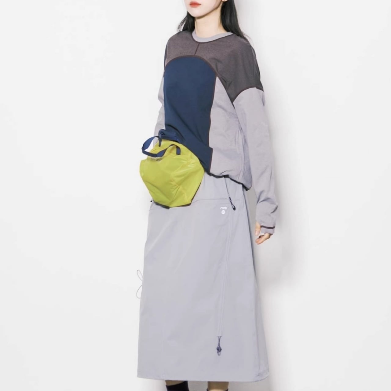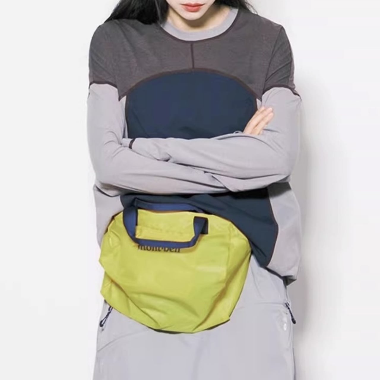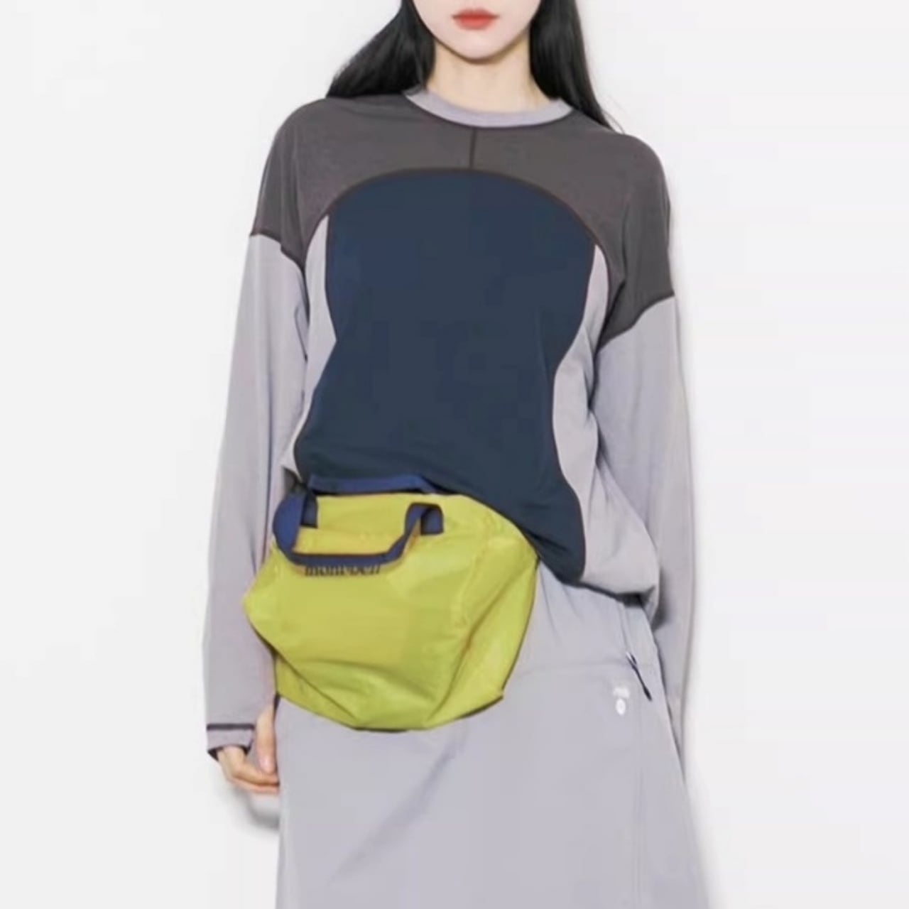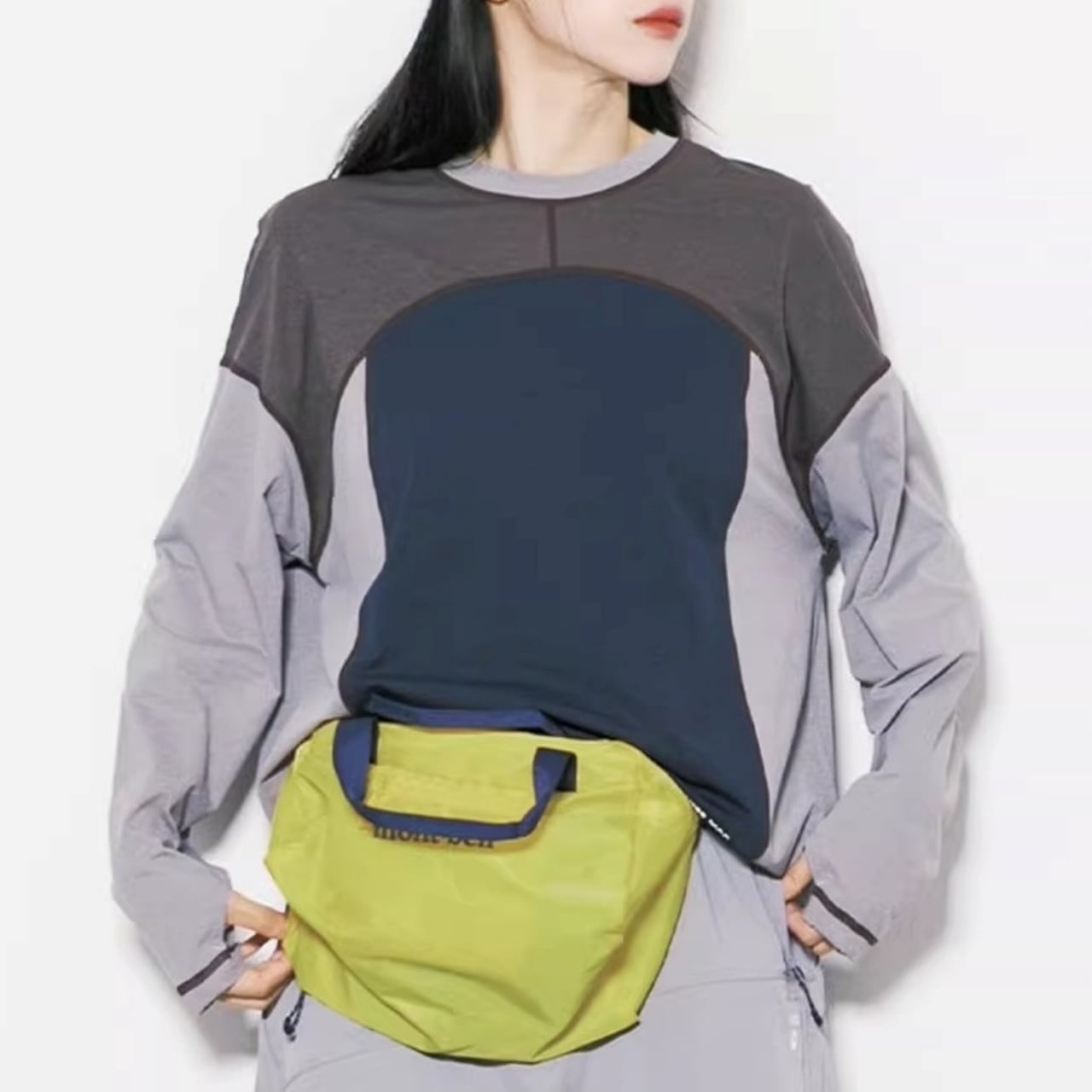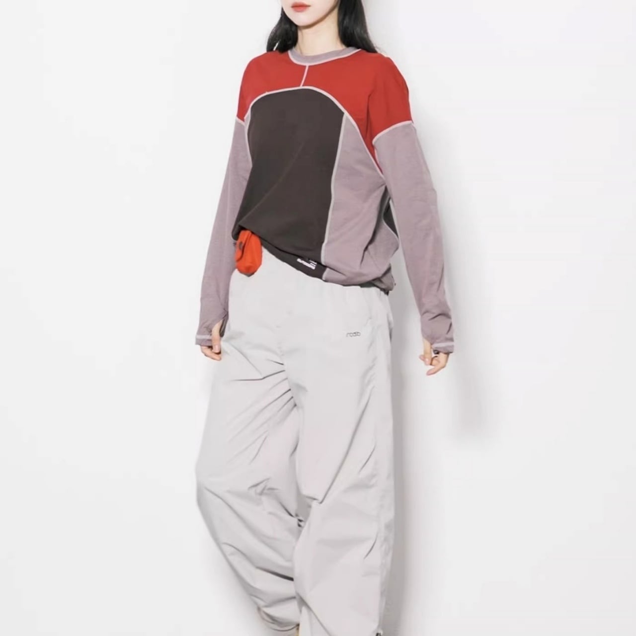 大胆な切り替えデザインと配色ステッチが目を引く、主役級のロンT。
