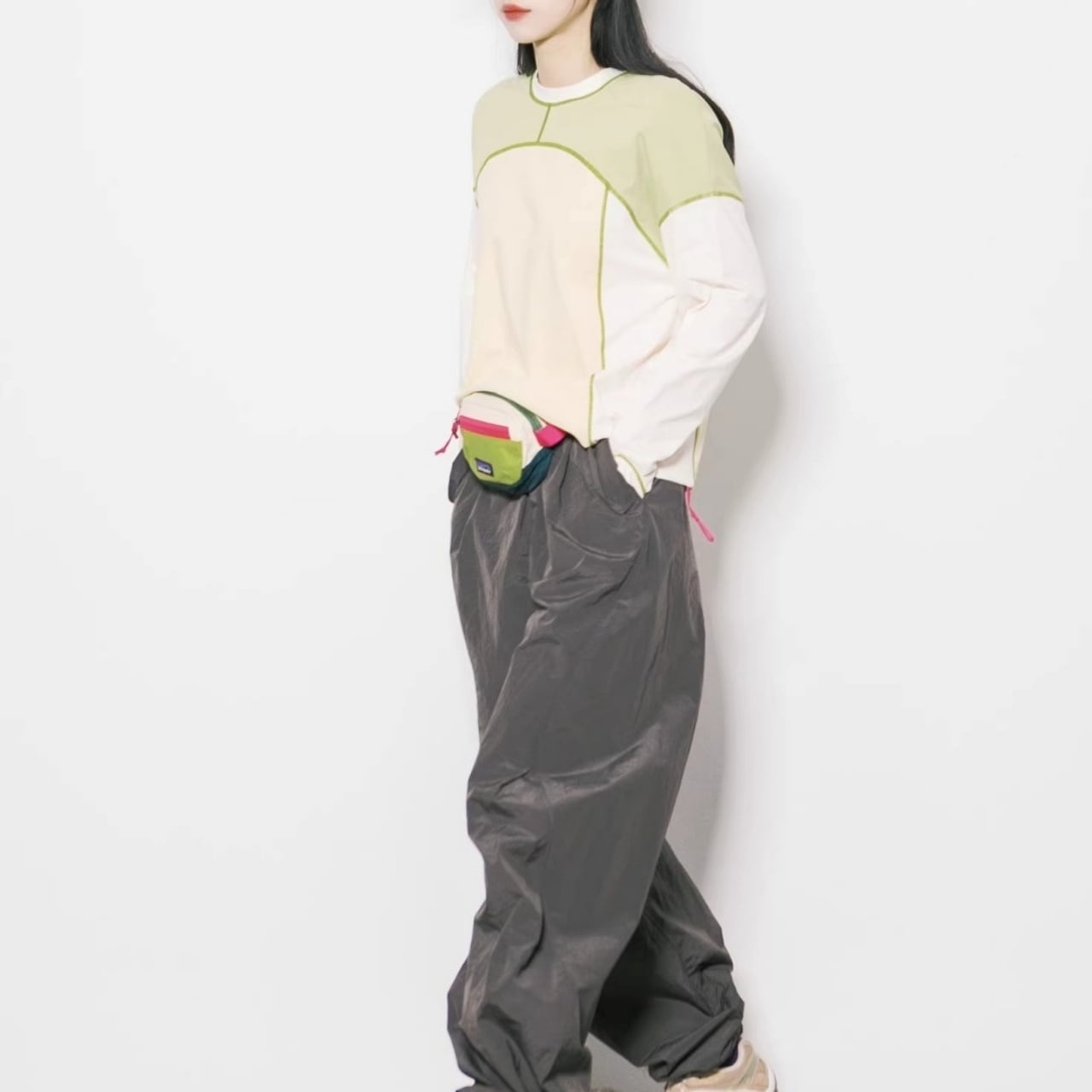 デニムやワイドパンツはもちろん、ナイロンパンツと合わせたストリートな着こなしもおすすめ。