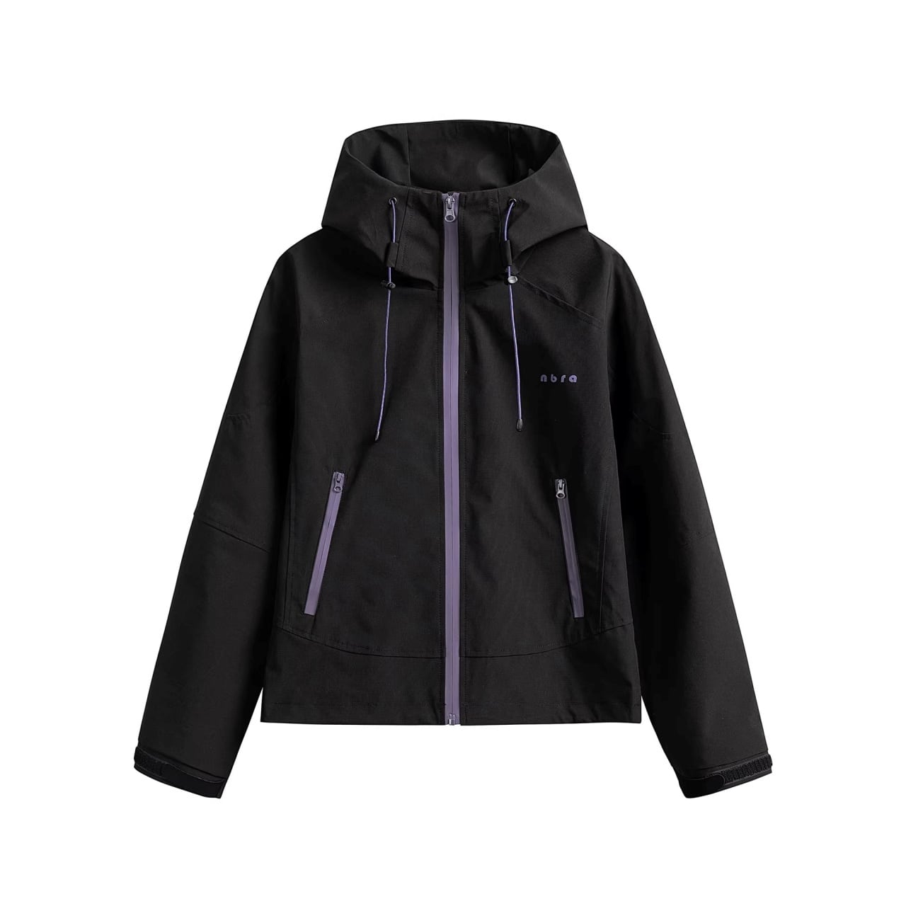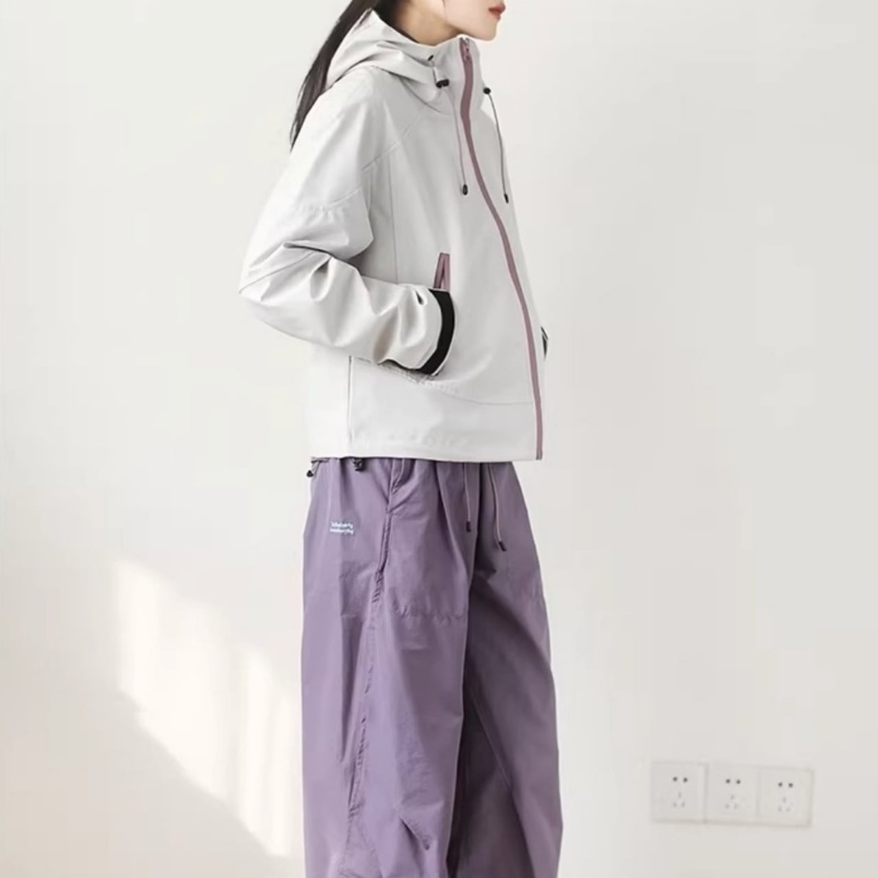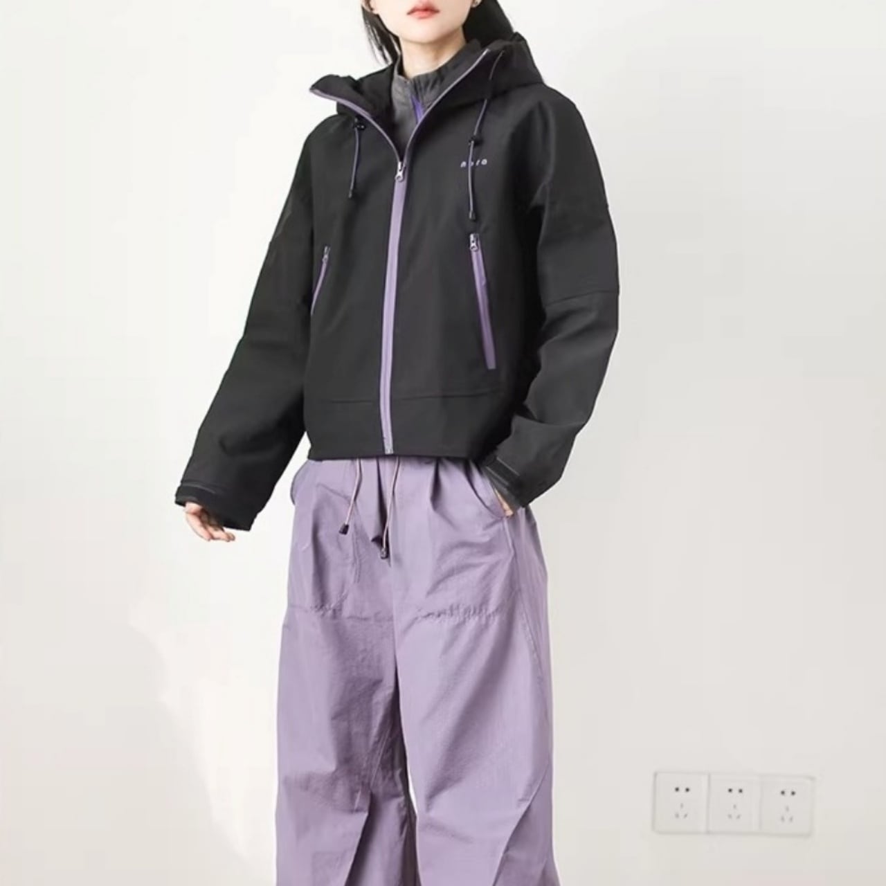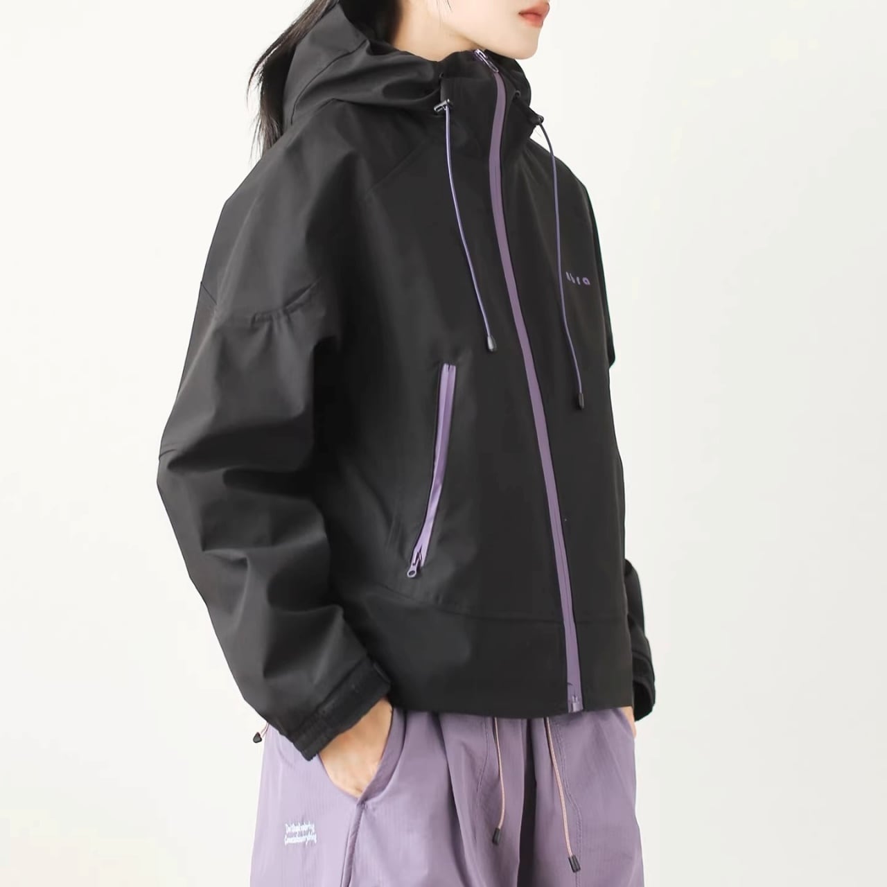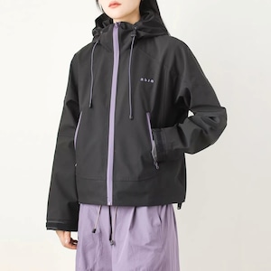 フロントジップと配色がアクセントになったフーデッドジャケット。