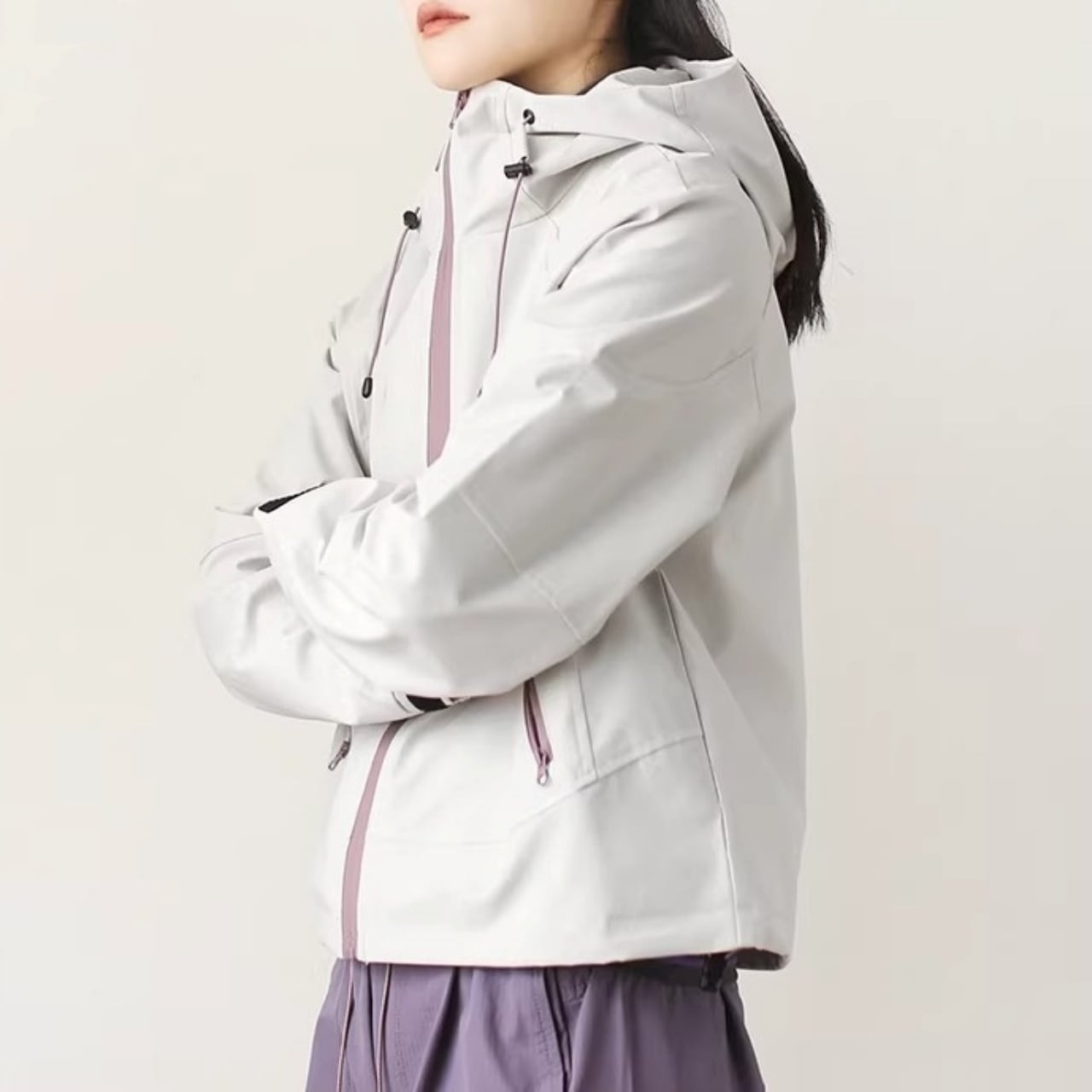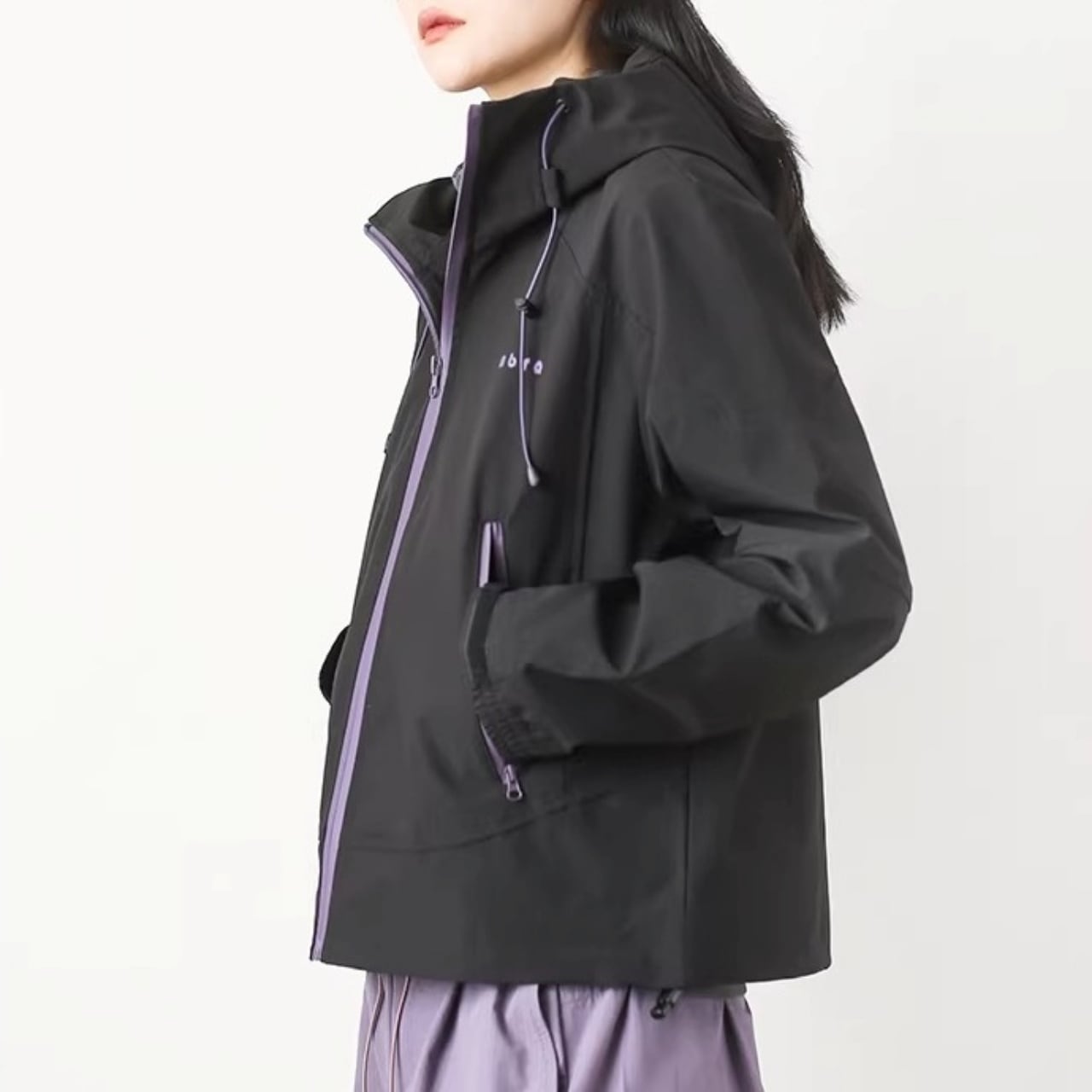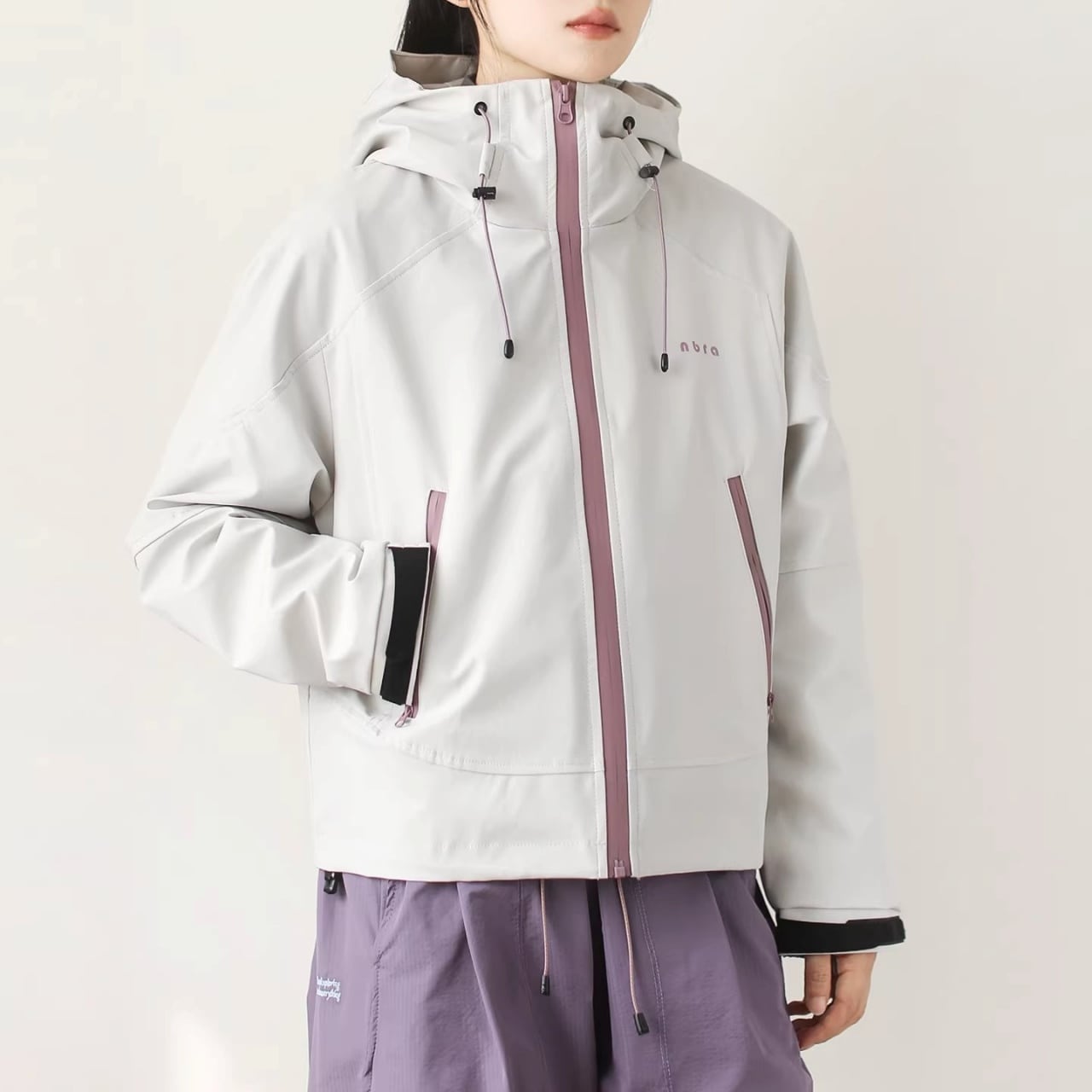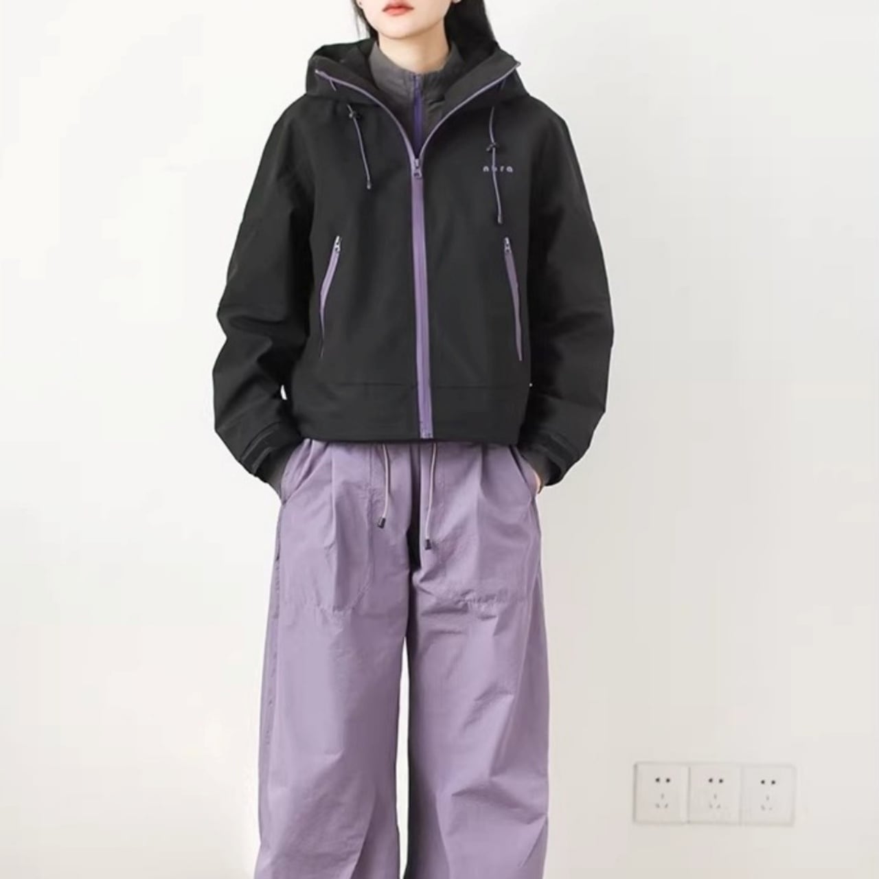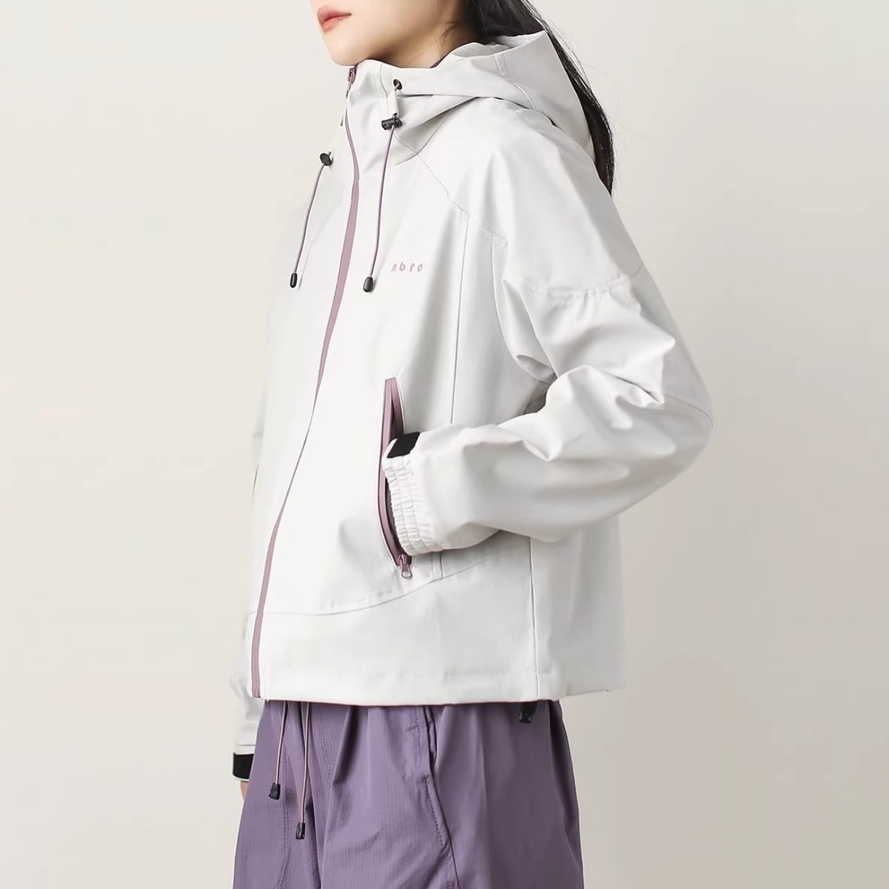 フロントジップと配色がアクセントになったフーデッドジャケット。