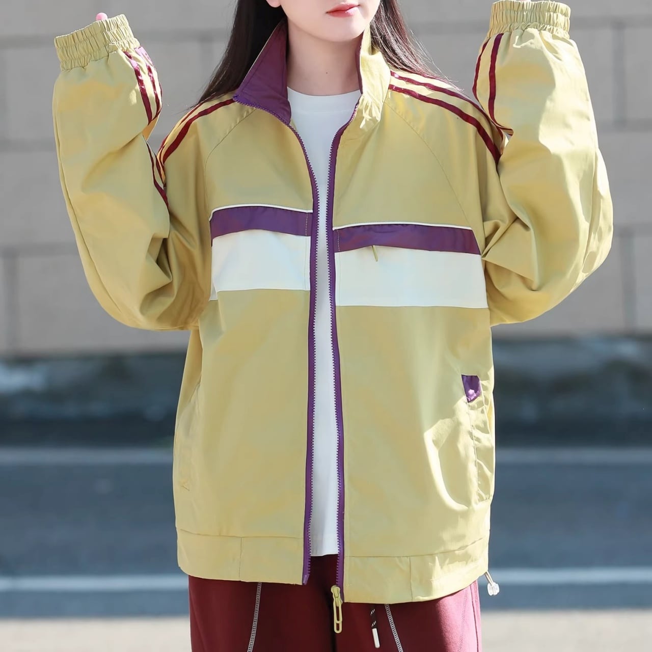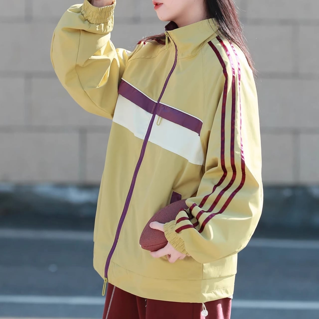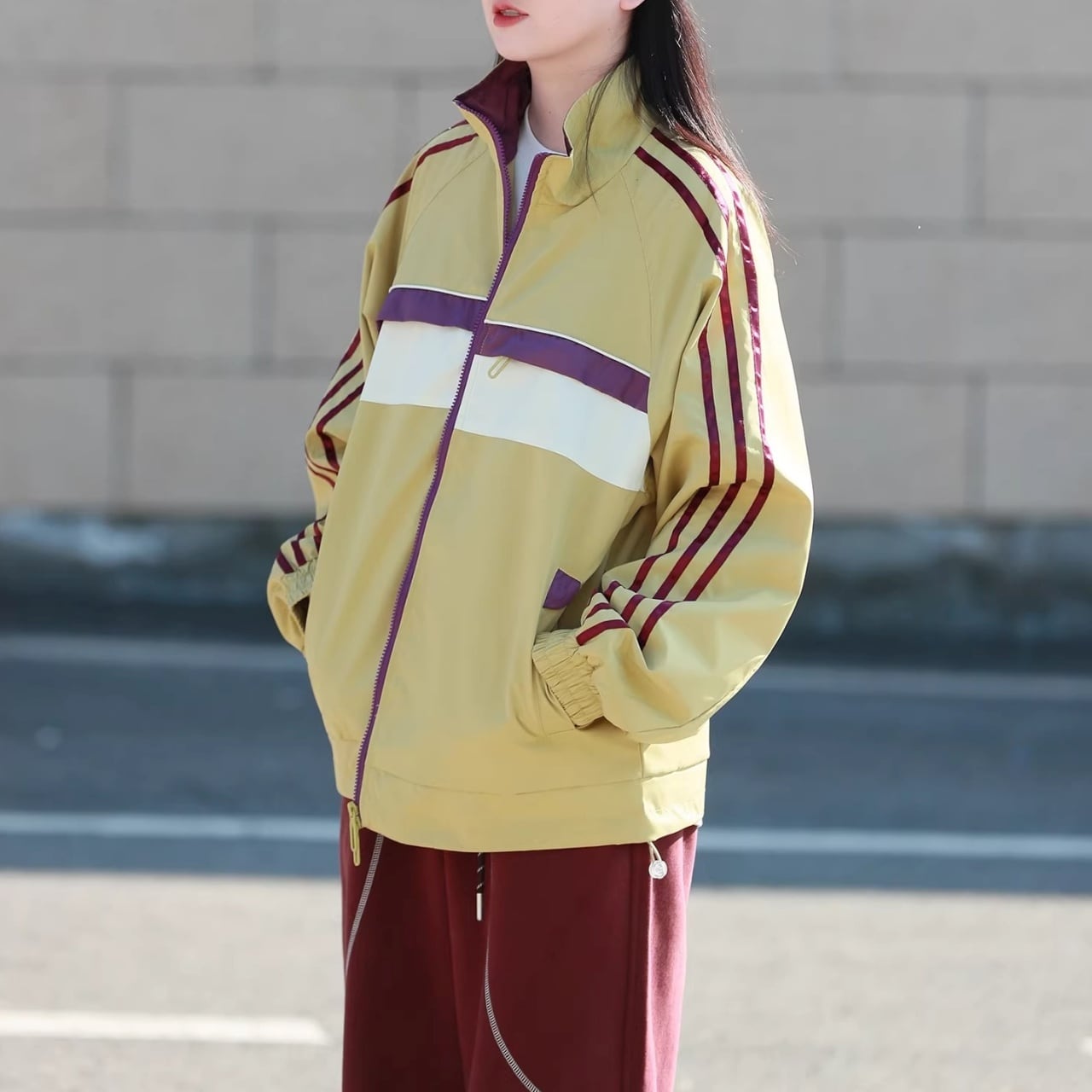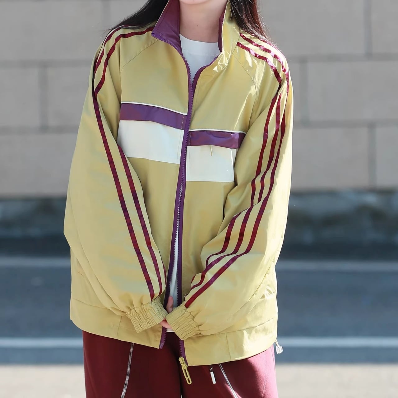肩から袖にかけての3本ラインと、胸元のカラーブロックがコーディネートのアクセントになります。