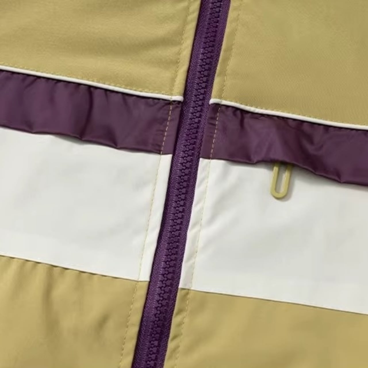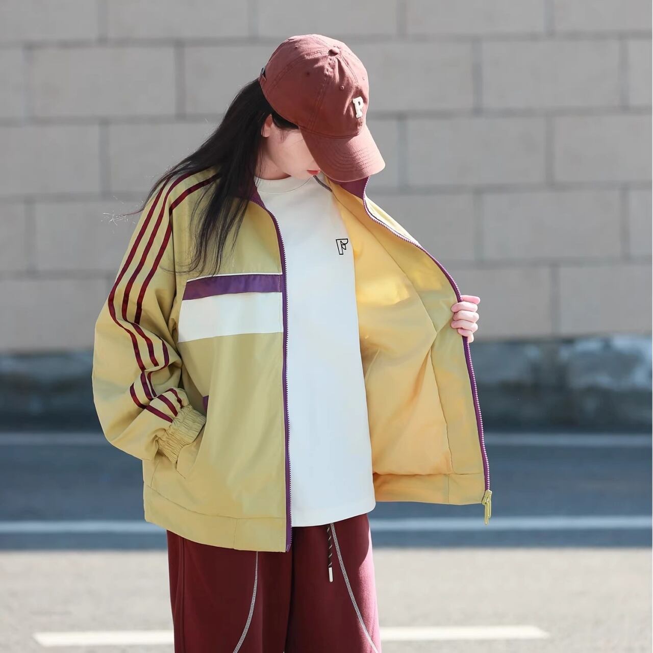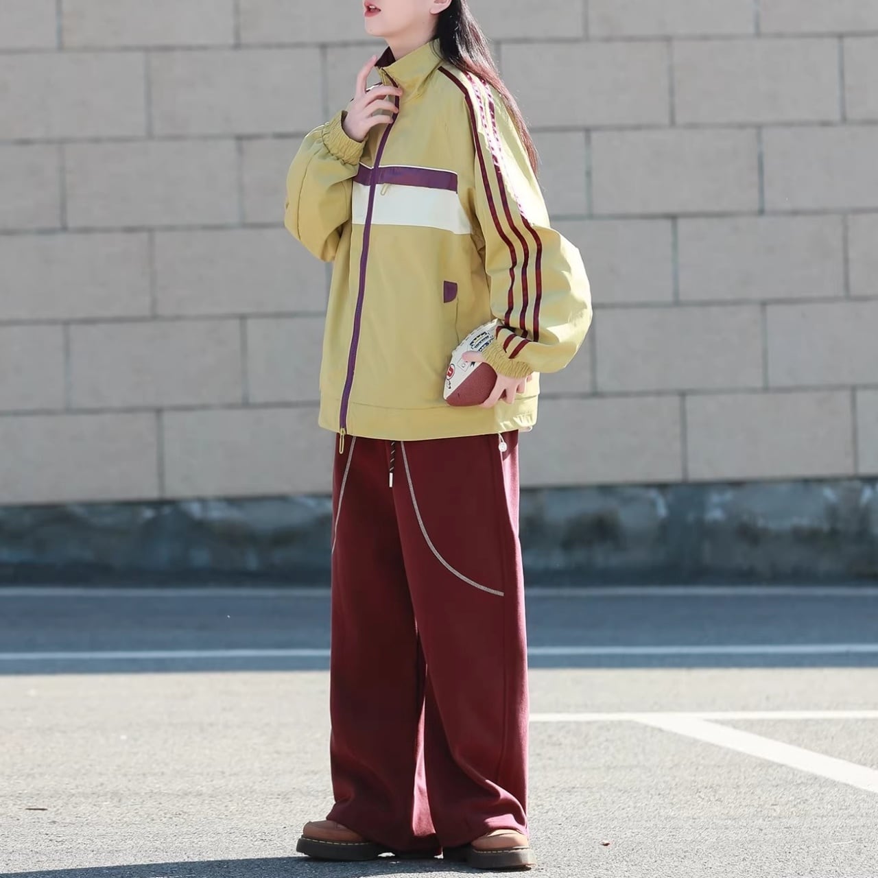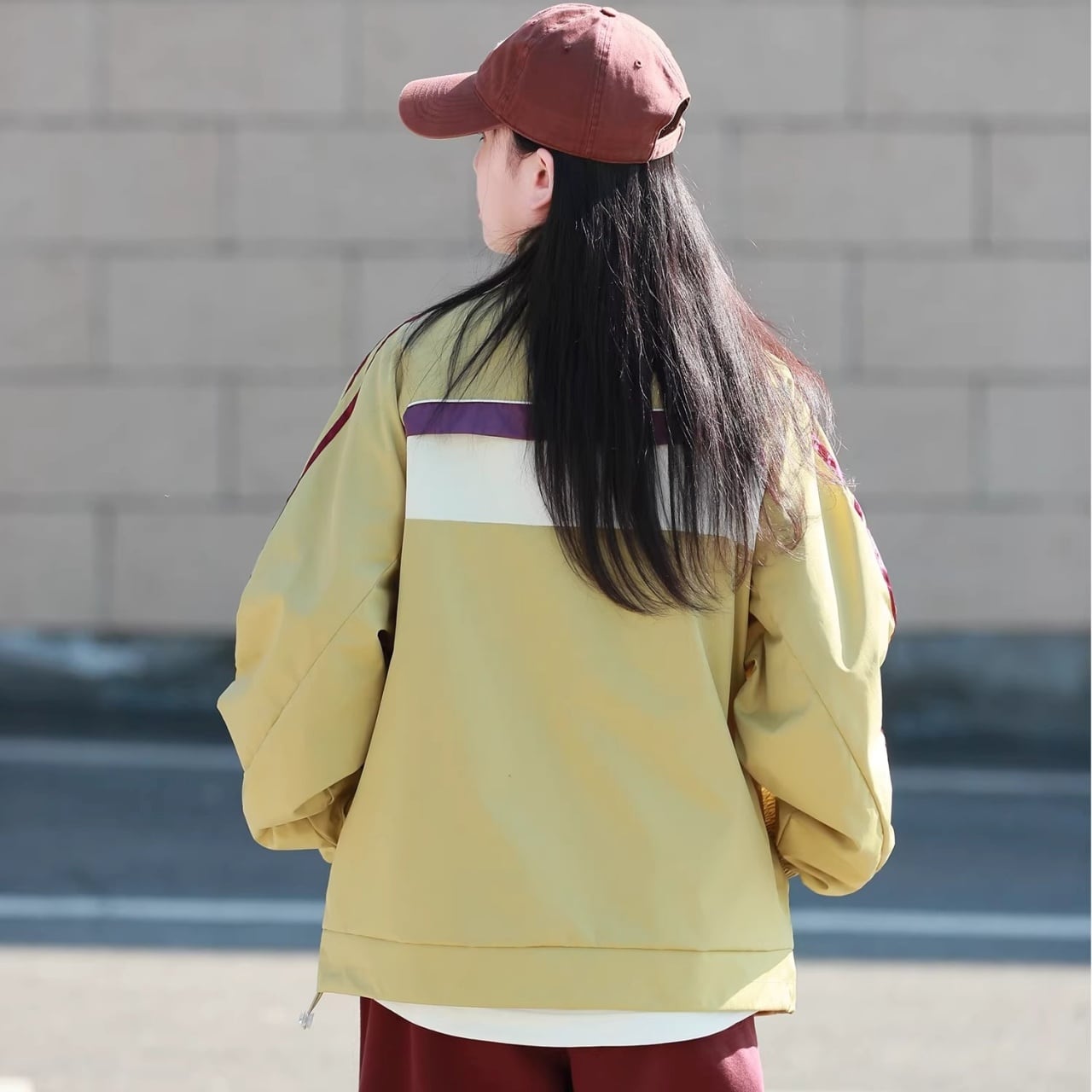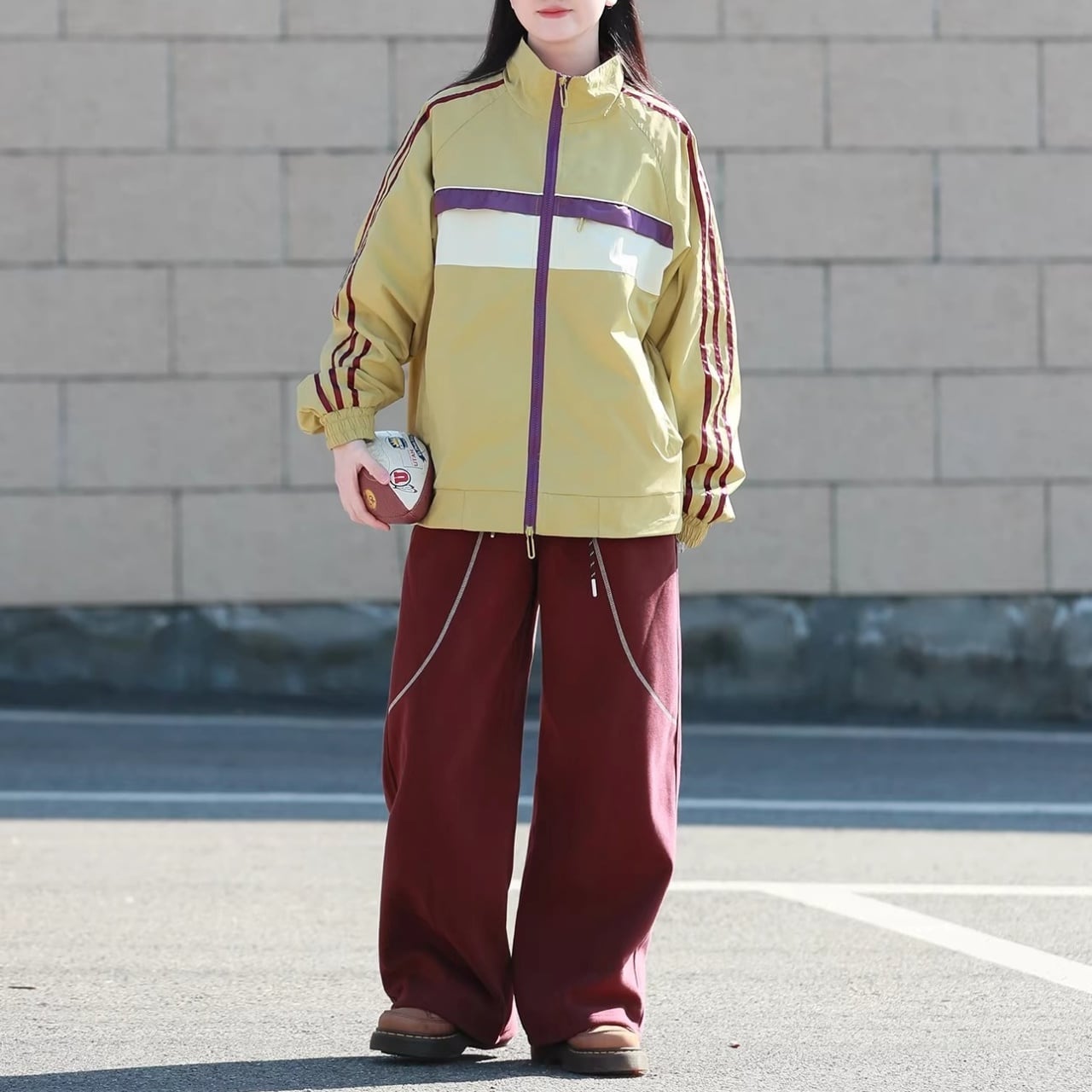 肩から袖にかけての3本ラインと、胸元のカラーブロックがコーディネートのアクセントになります。