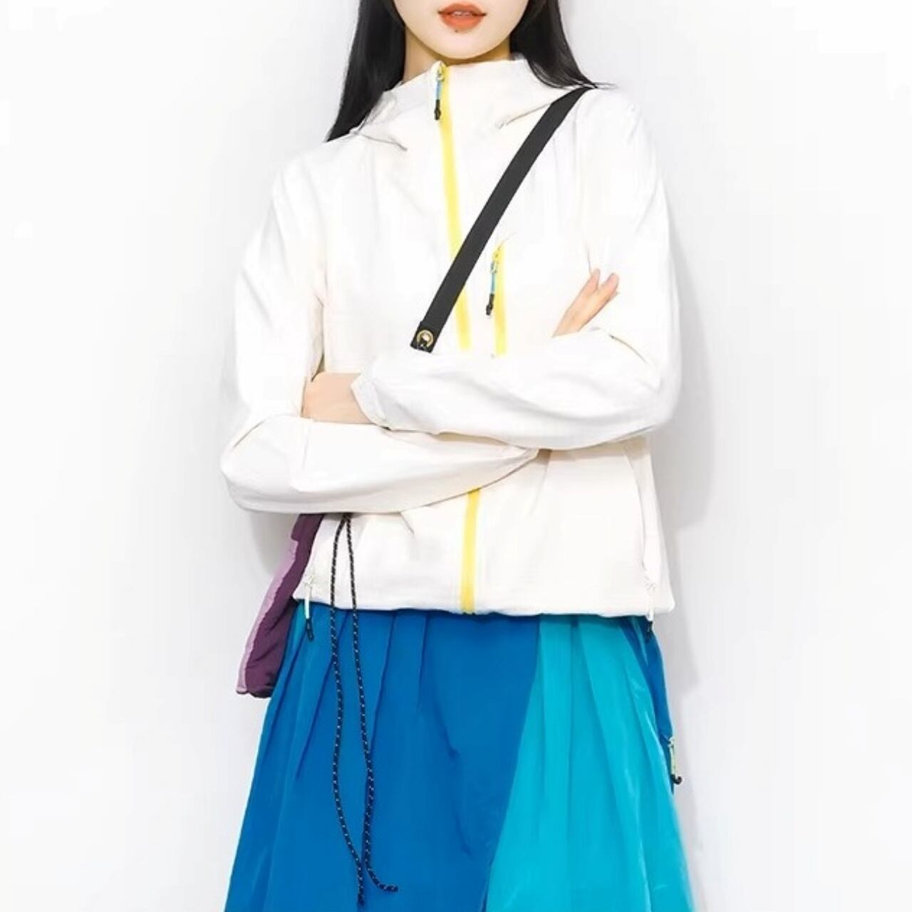 立体的なフードシルエットと、アクセントになるコントラストジップが洗練された印象を演出。
