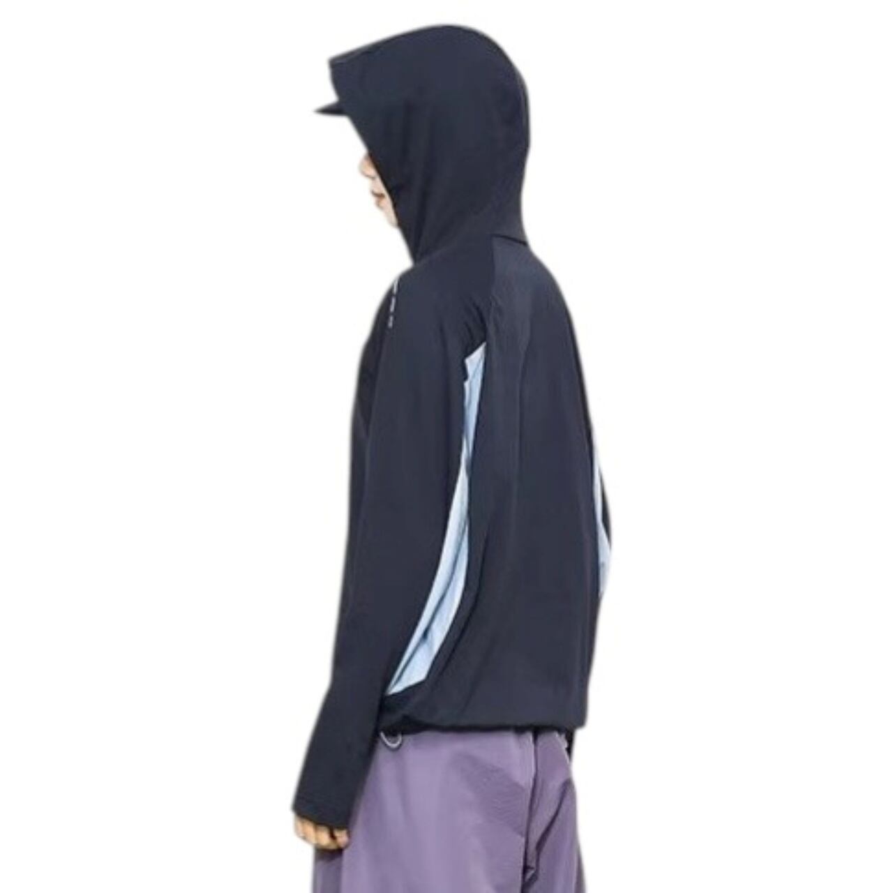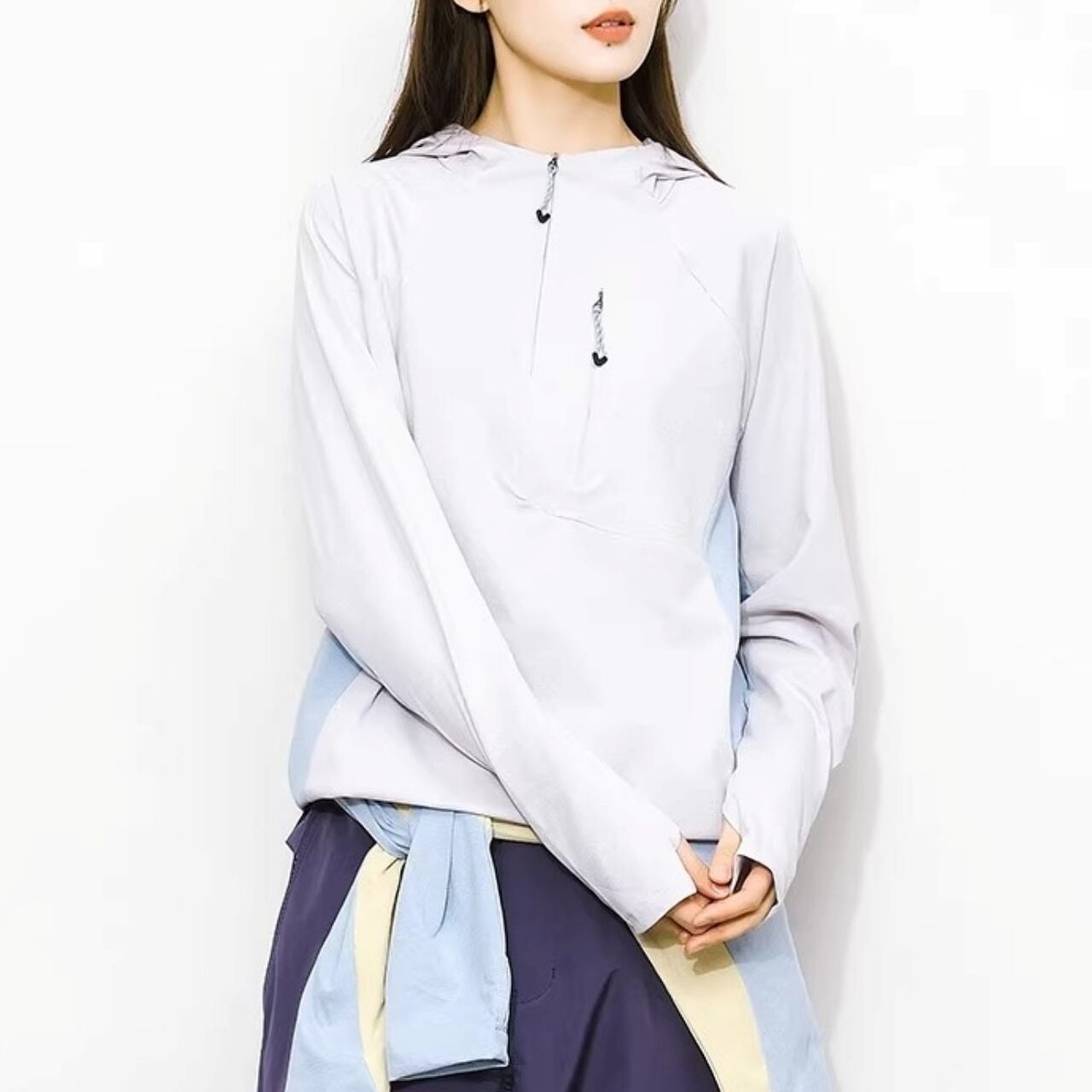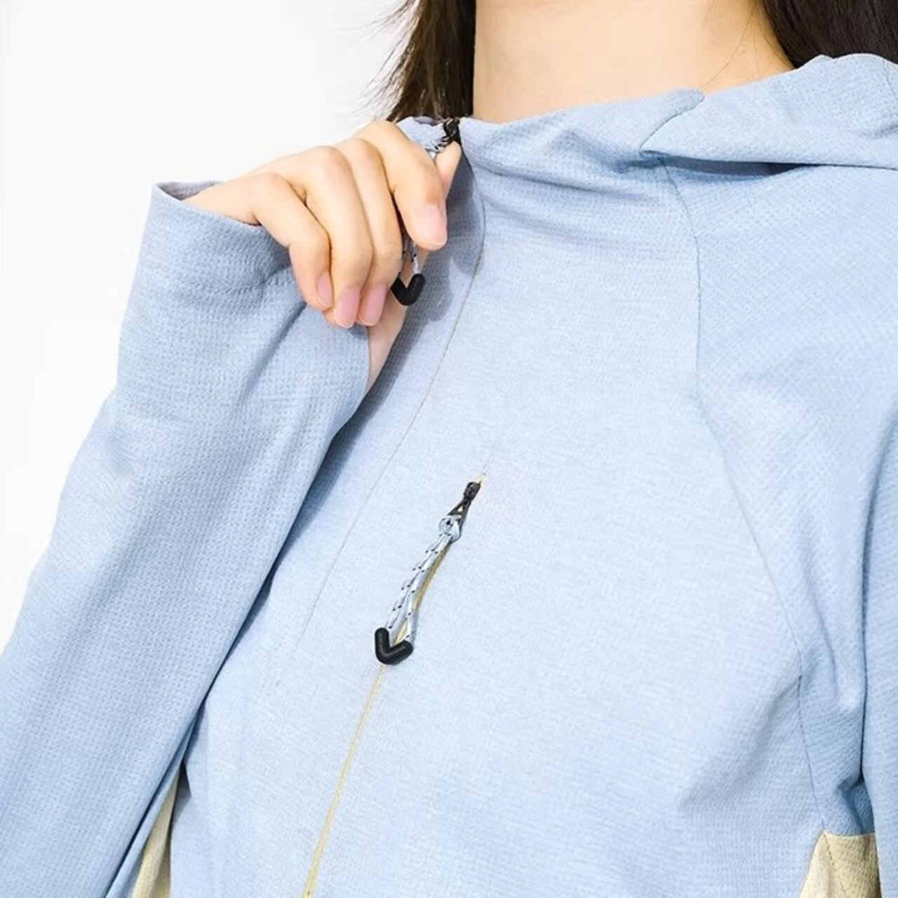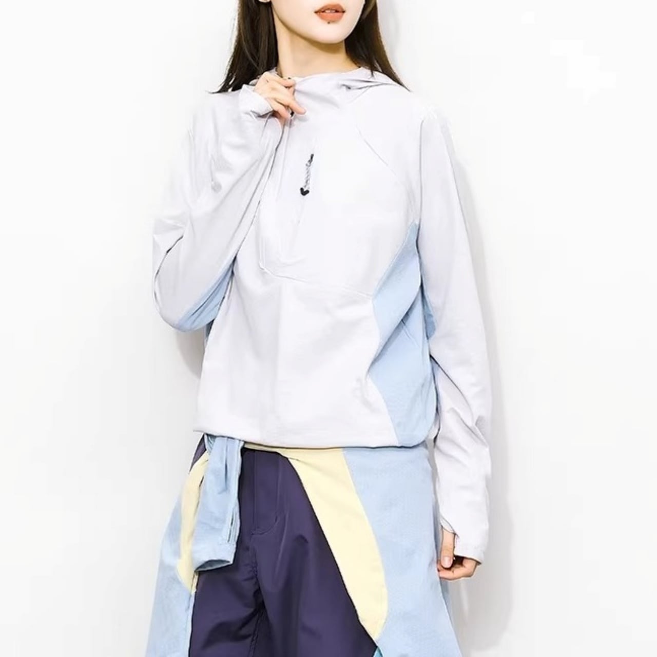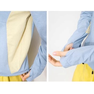 袖口の指抜きデザインにより、アクティブな動きの中でも袖のズレを防ぎ、手の甲までカバー。